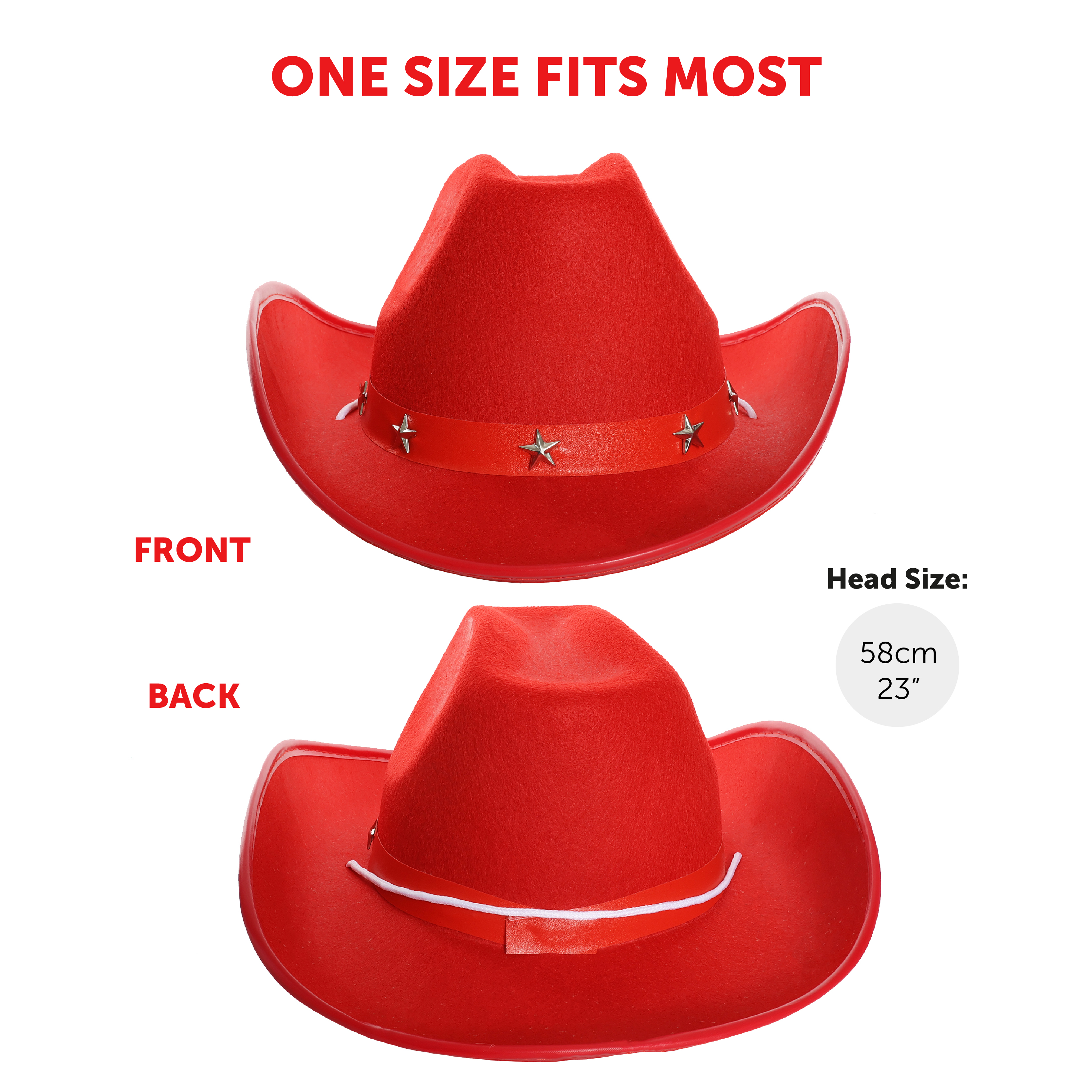 ONE SIZE FITS MOST: Being a very comfortable one size, this Red Studded Cowboy Hat is wearable for most, measuring a Head Size of 58cm (23"), making it perfect for all fancy dress events!