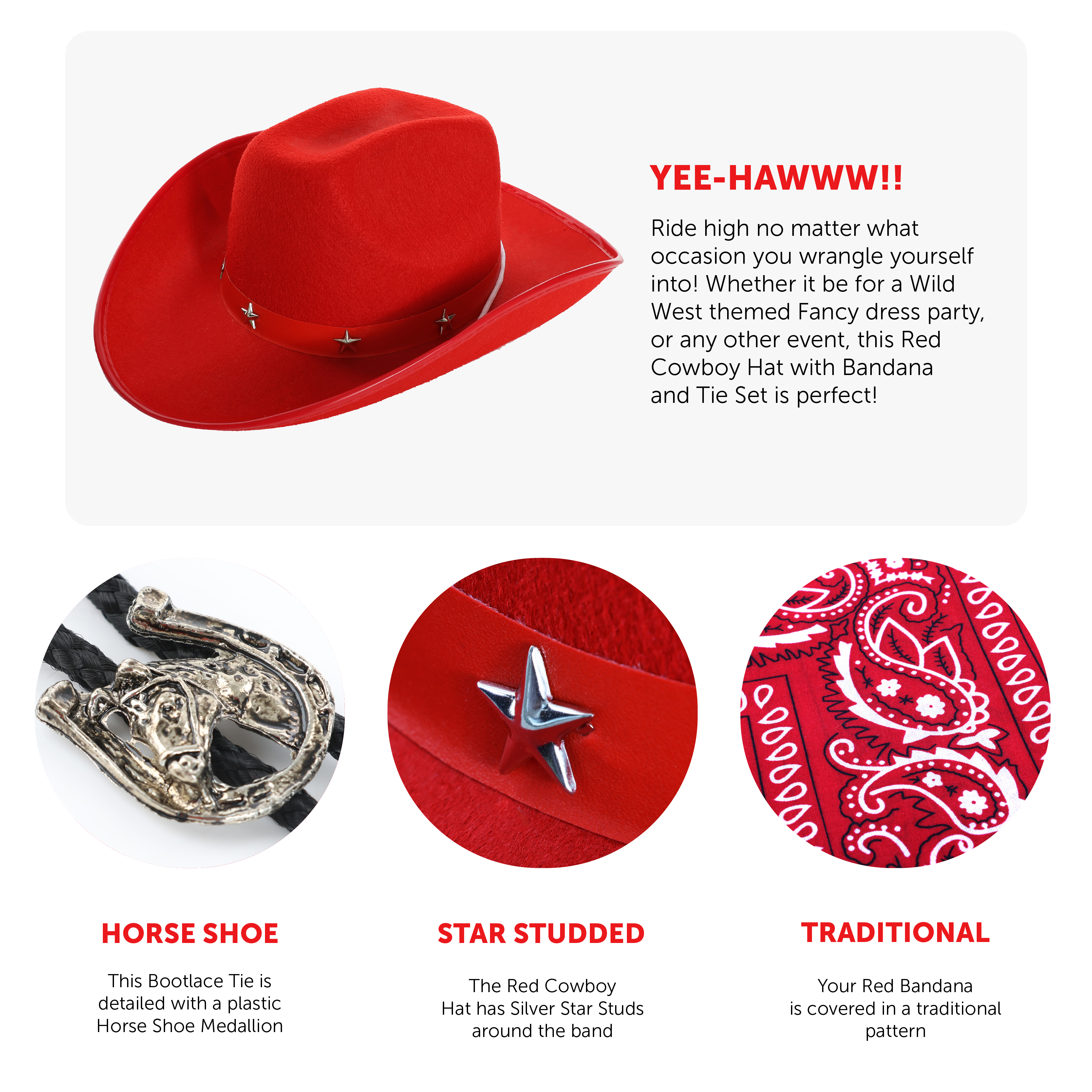 SET INCLUDES: This Set includes a Red Cowboy Hat, with Silver Star studs and an adjustable strap for extra comfort, a Red Bandana covered in a paisley pattern, and a long Black Bootlace Tie with a Horse Medallion, the perfect way to finish off your fancy dress outfit!
