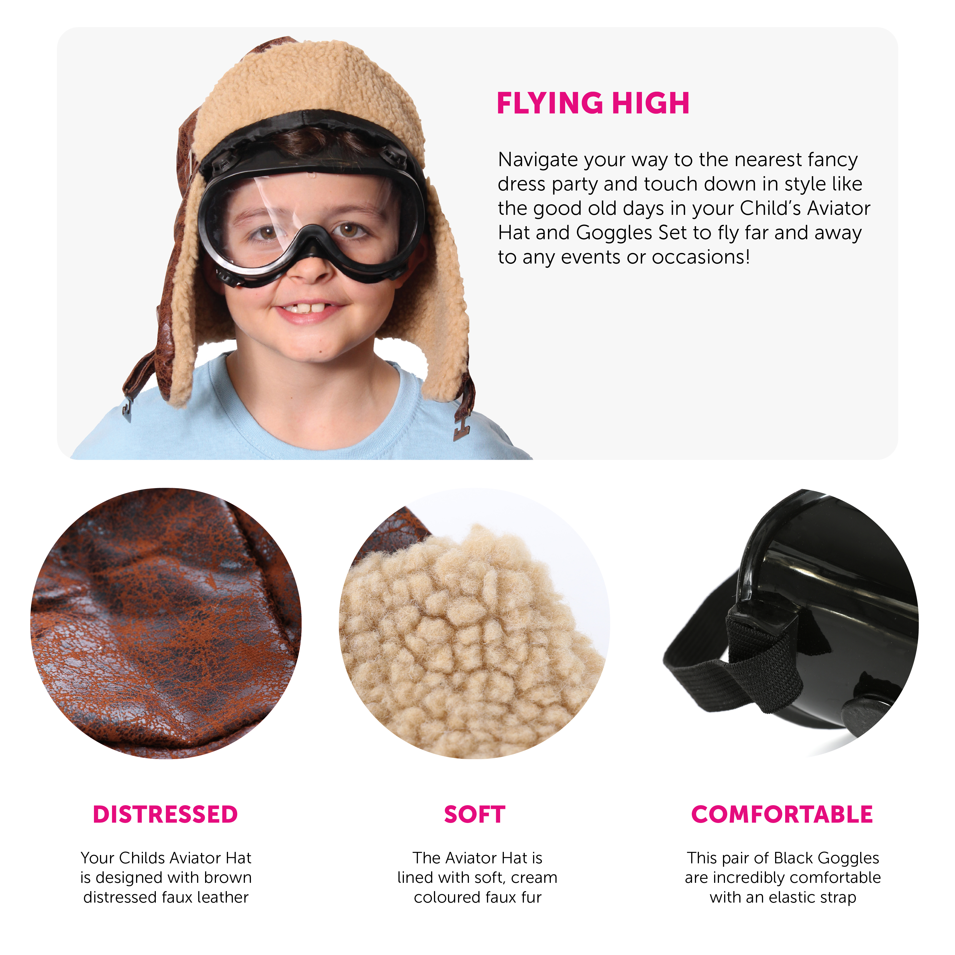 CHILD’S AVIATOR HAT AND GOGGLES SET: Navigate your way to the nearest fancy dress party and touch down in style like the good old days in your Child’s Aviator Hat and Goggles Set to fly far and away to any events or occasions!