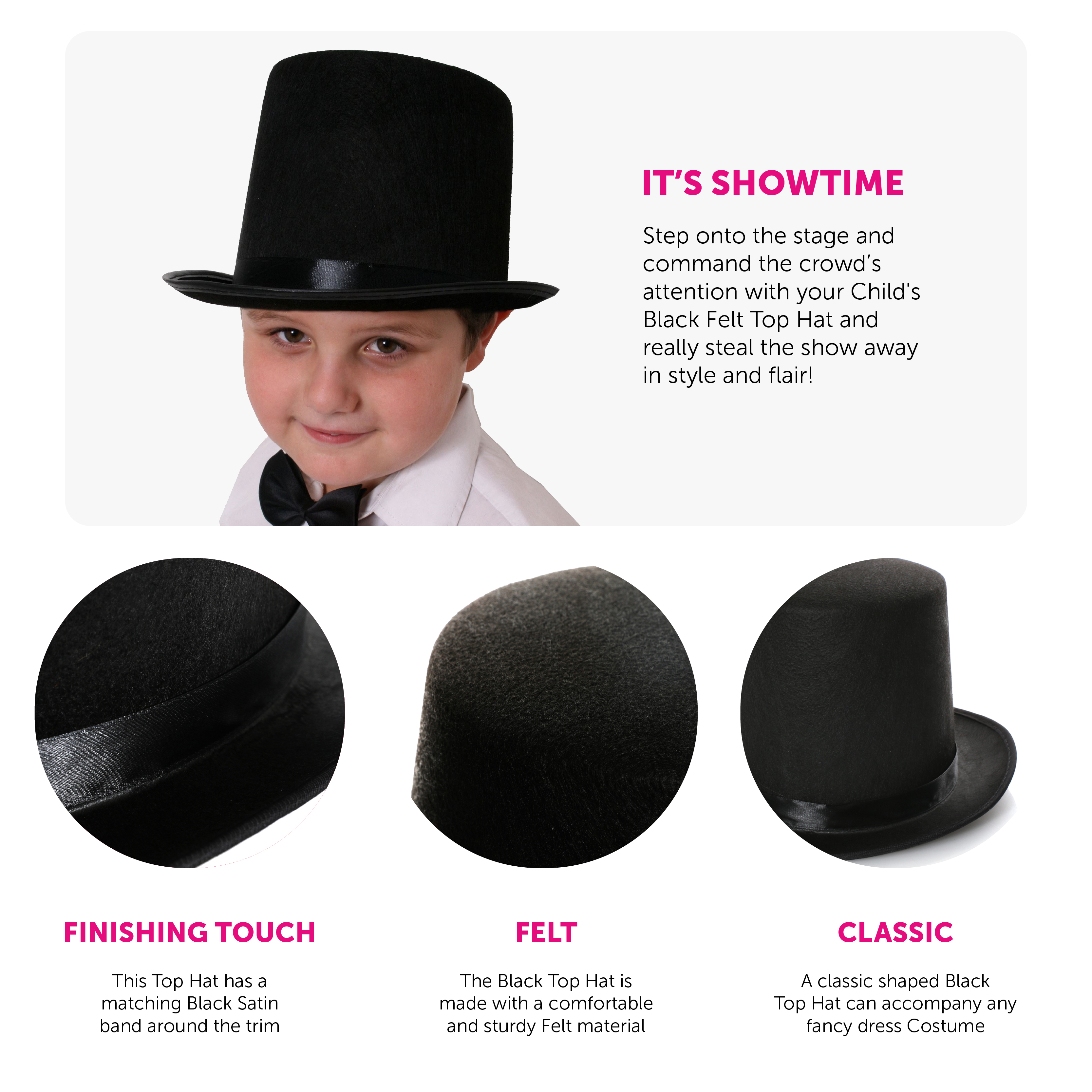 CHILD'S BLACK FELT TOP HAT: Step onto the stage and command the crowd’s attention with your Child's Black Felt Top Hat and really steal the show away in style and flair!
