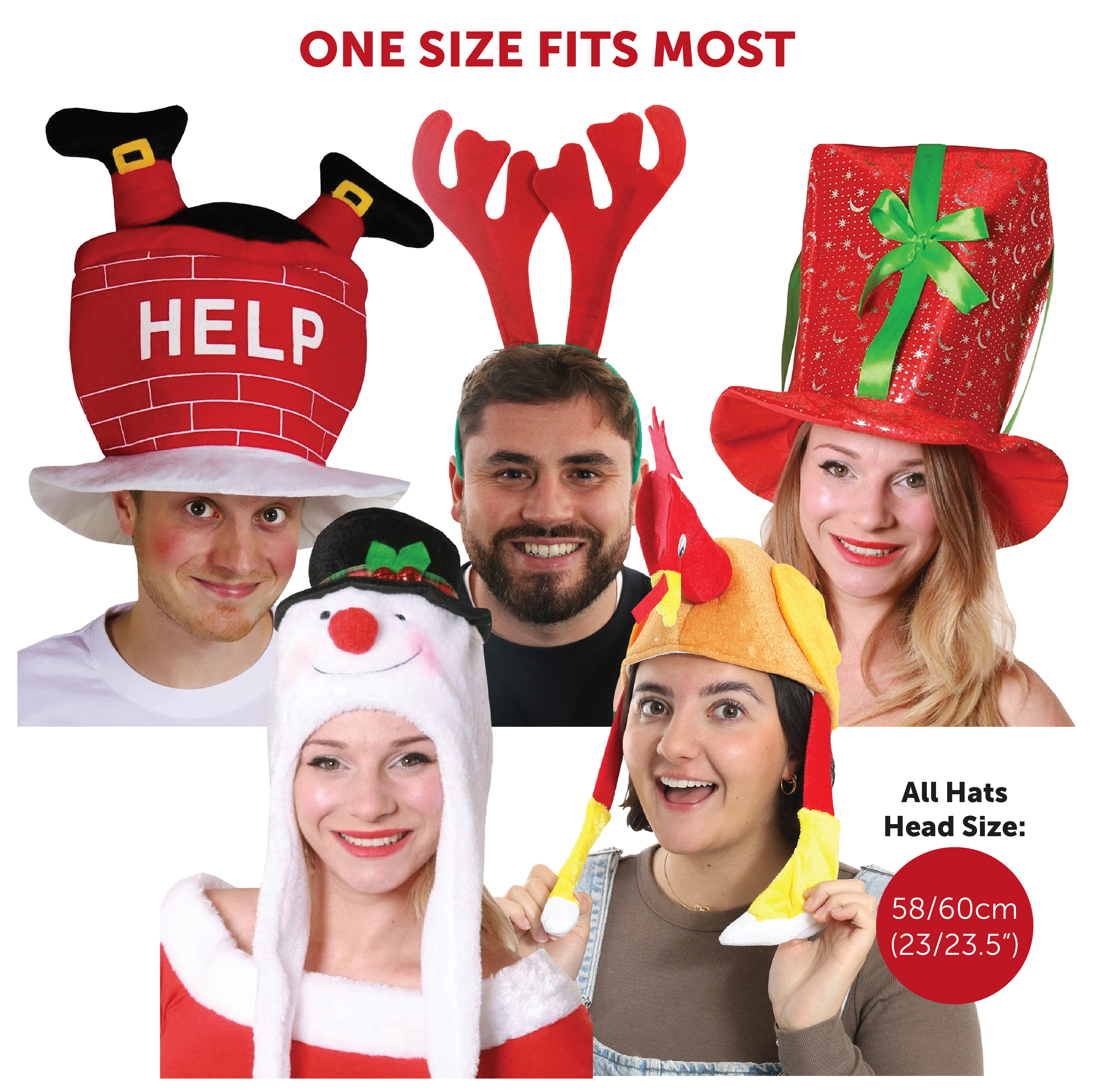 ONE SIZE FITS MOST: All of these Novelty Christmas Hats are available in one size, which is the perfect fit for most, each with a head circumference of approximately 58/60cm (23/23.5"), this should fit most Adults comfortably!