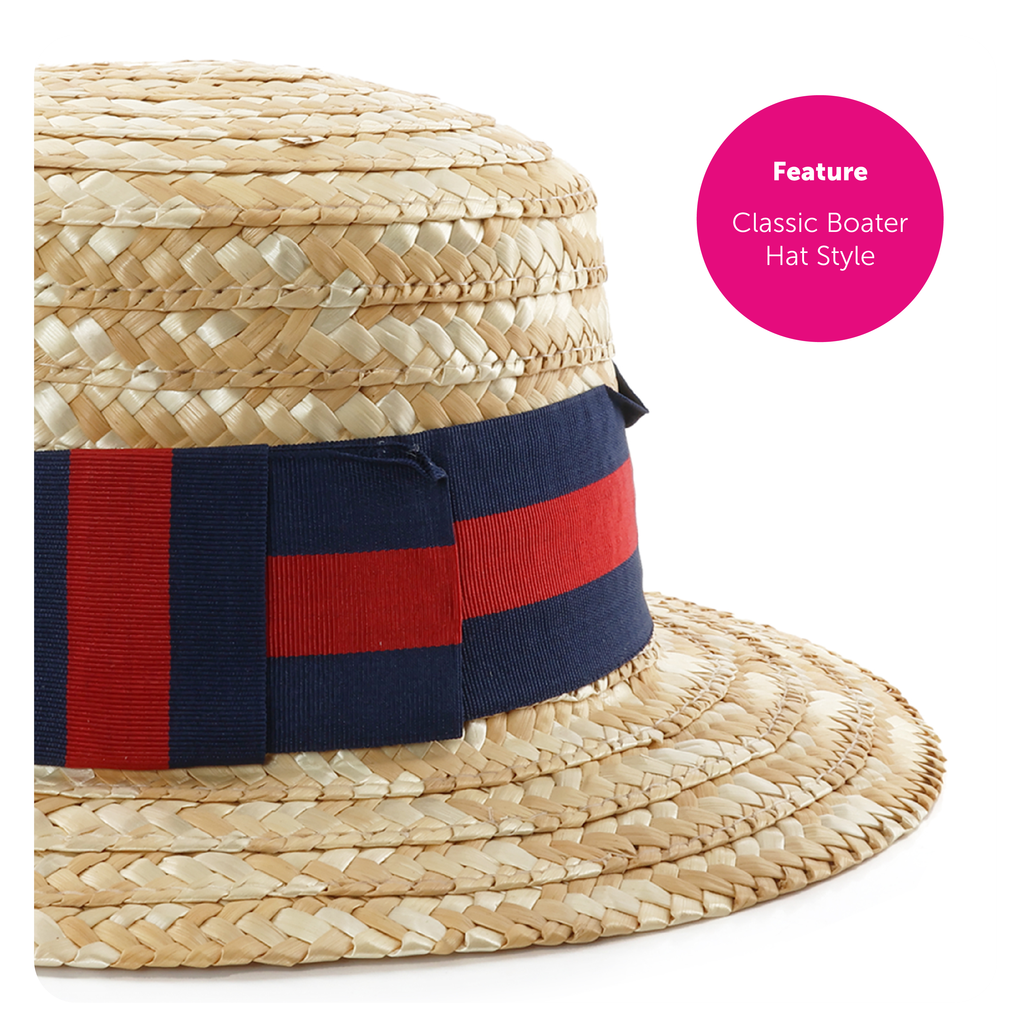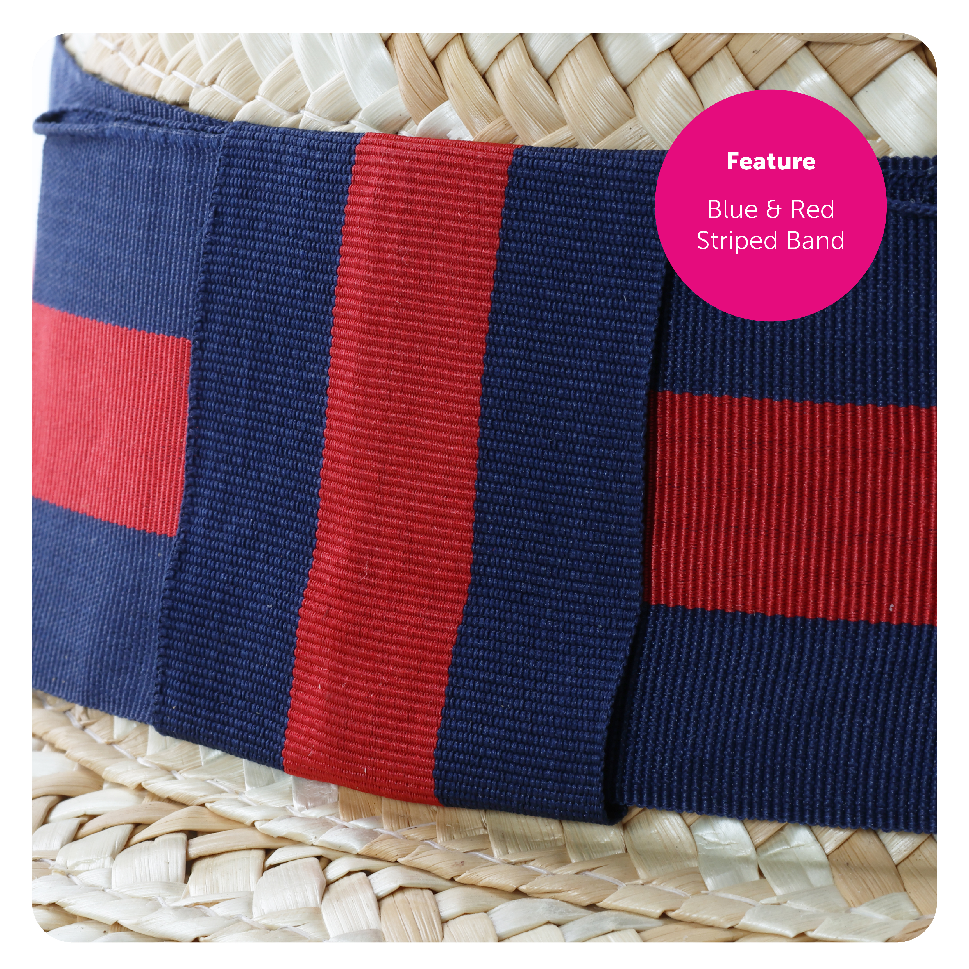 BOATER HAT DETAILS: This Adults Boater Hat is a lightweight, woven Straw styled Hat with a Navy Blue and Red Striped Band wrapped around - a great finishing touch to any outfit!