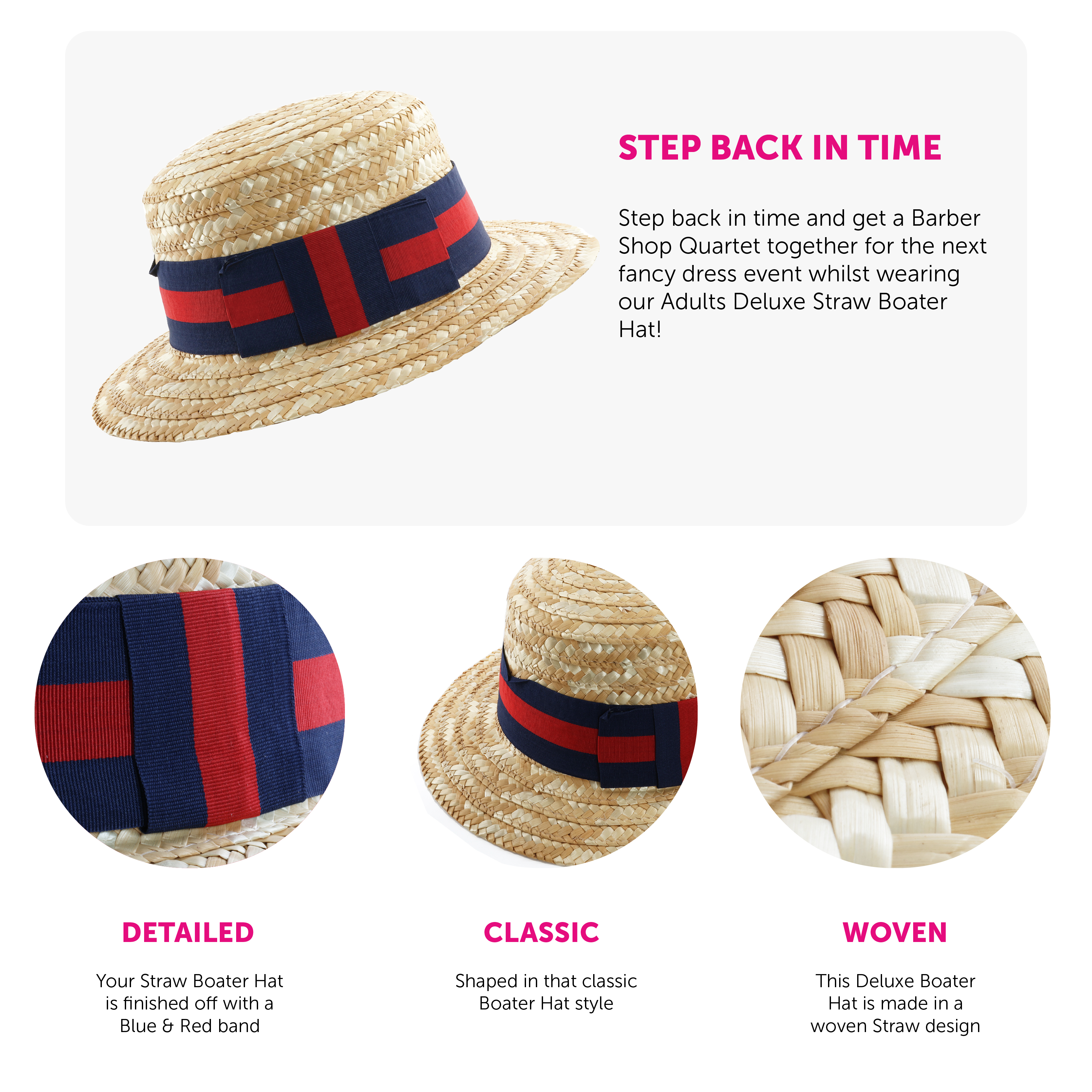 DELUXE STRAW BOATER HAT: Step back in time and get a Barber Shop Quartet together for the next fancy dress event whilst wearing our Adults Deluxe Straw Boater Hat!