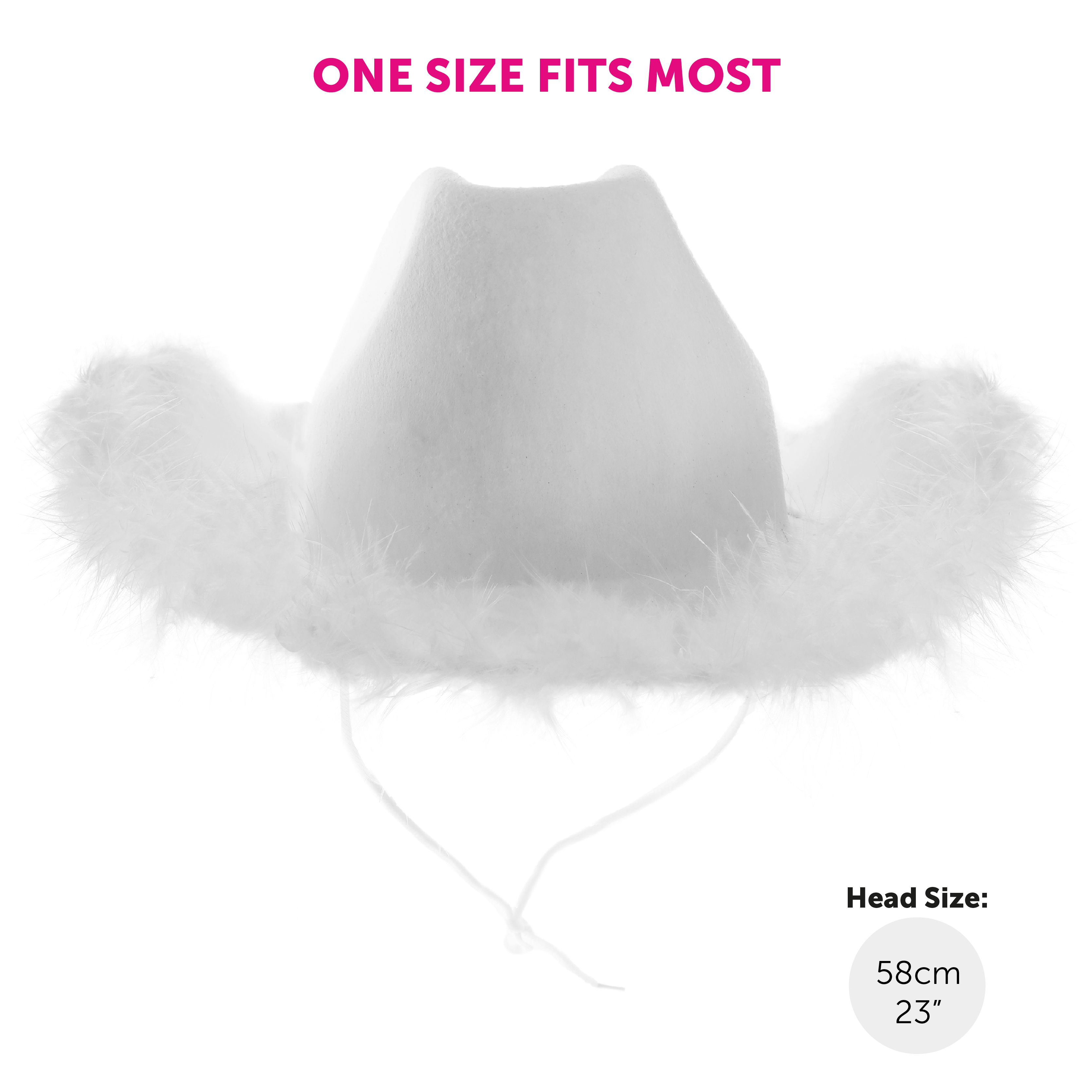 This Cowgirl Hat features a sleek White tone, trimmed with soft White Marabou Feathers around the brim and finished with an adjustable white string for a secure and comfortable fit. The ideal accessory to top off your standout look!