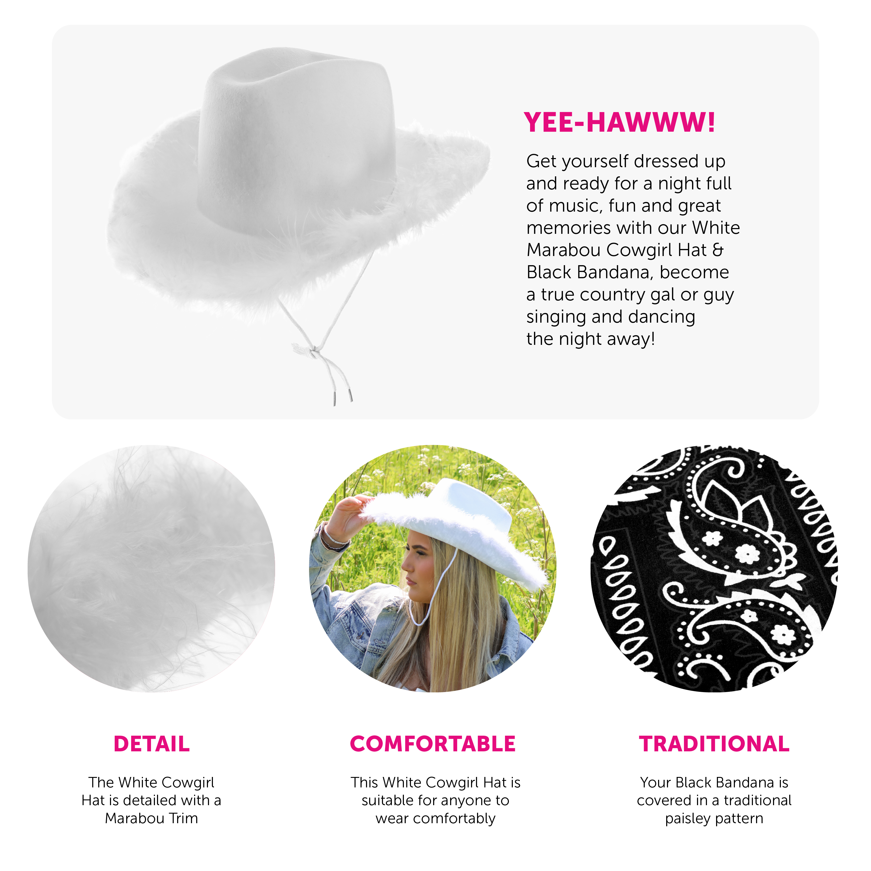 White Cowboy Hat with Marabou Trim + Black Paisley Bandana   £10.99