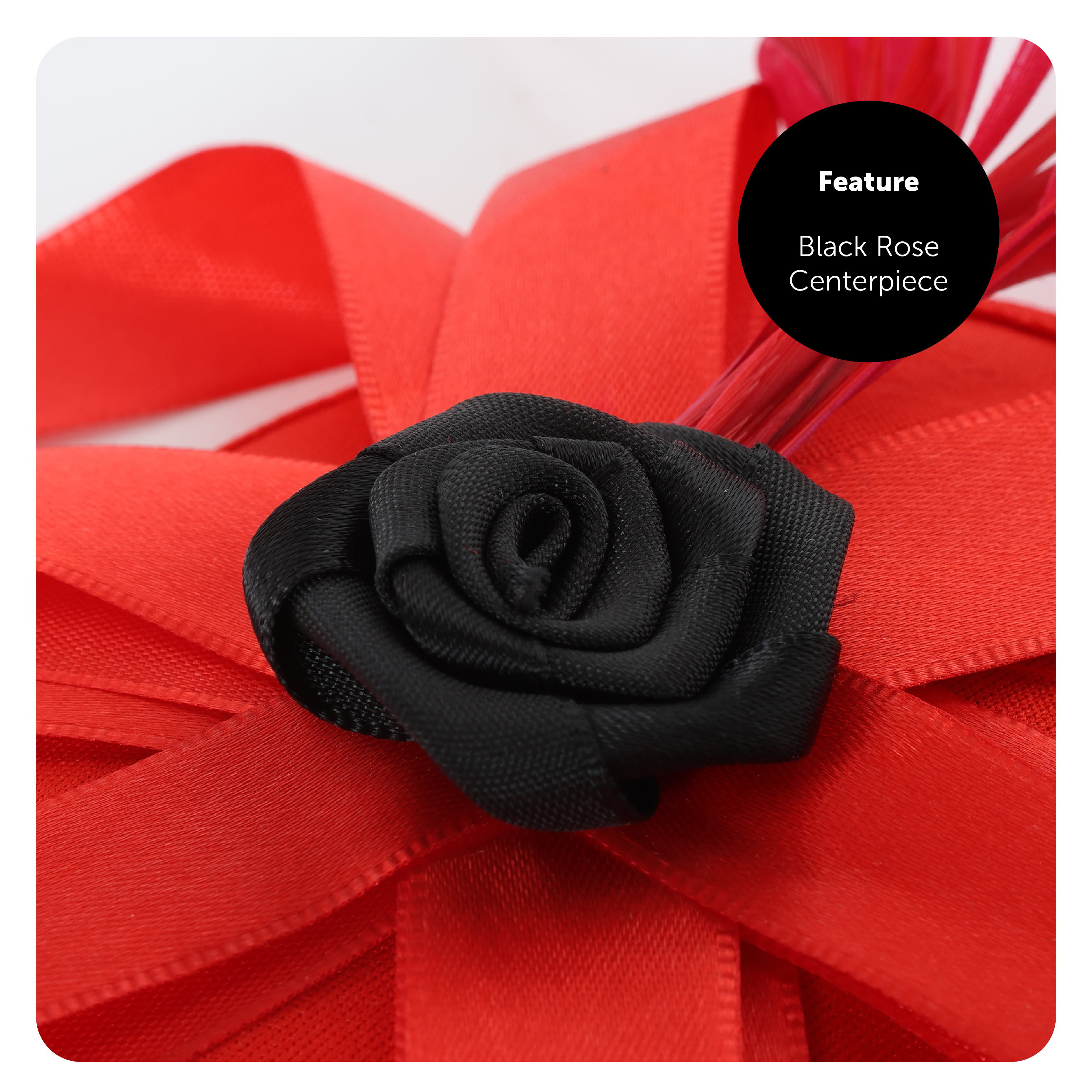 HEADPIECE DETAILS: This Fascinator Headpiece is a Red Satin Headpiece with looped Ribbon, a Black Rose in the middle, small Red Feathers and hair grips on the underside for a simple and stand out look!