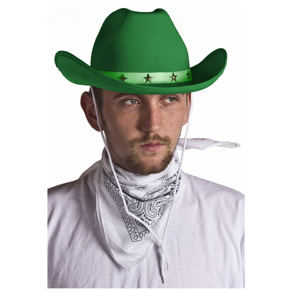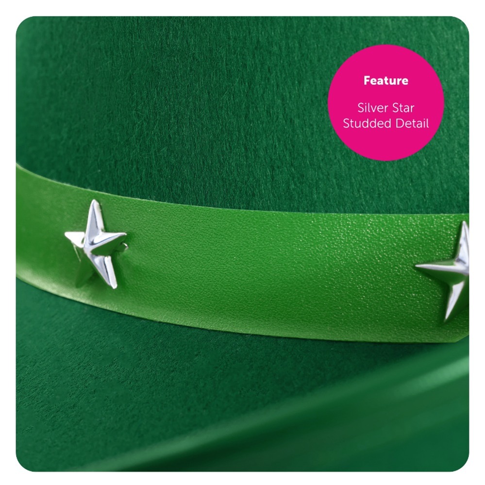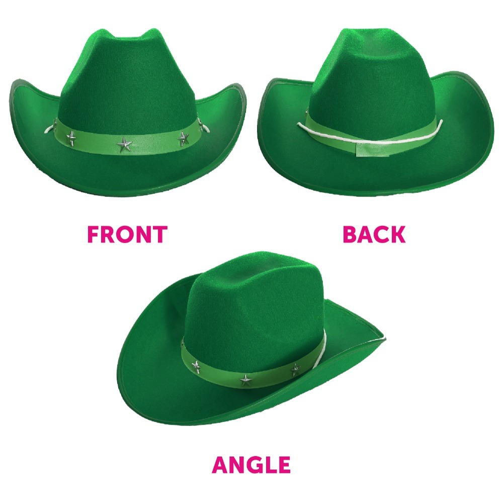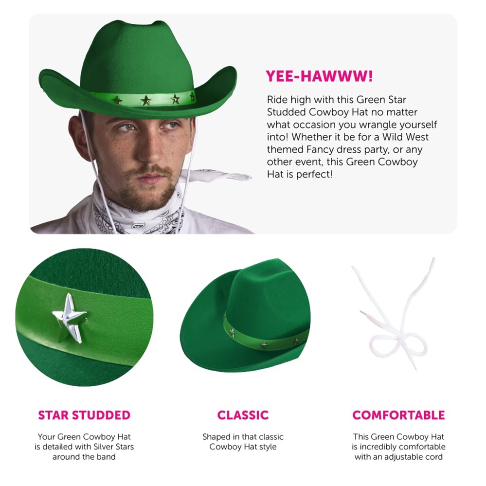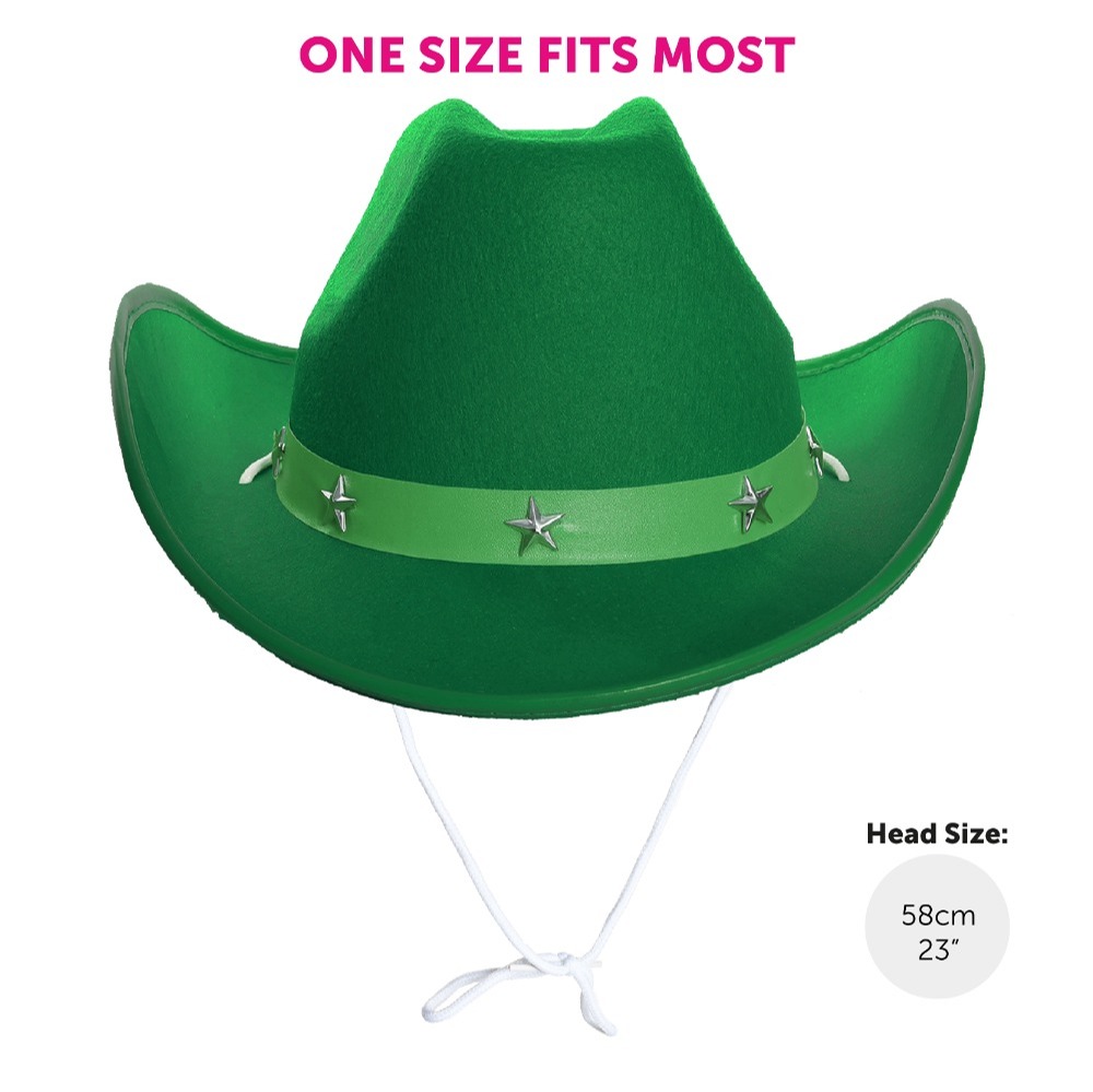 This Cowboy Hat features a bold Green colour with Silver Star studs around the band and an adjustable white chin strap for comfort and secure wear. Ideal for completing any cowboy, cowgirl, or rodeo look.
