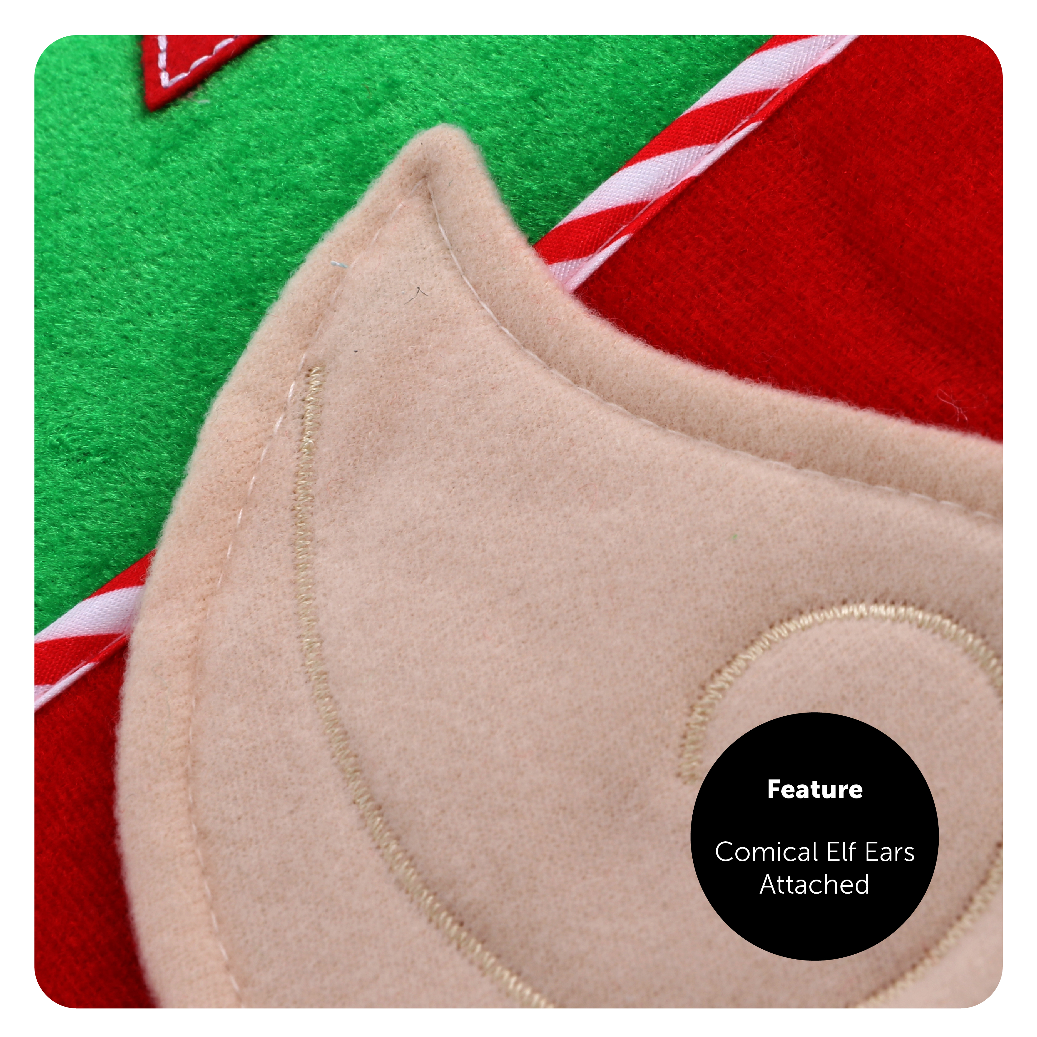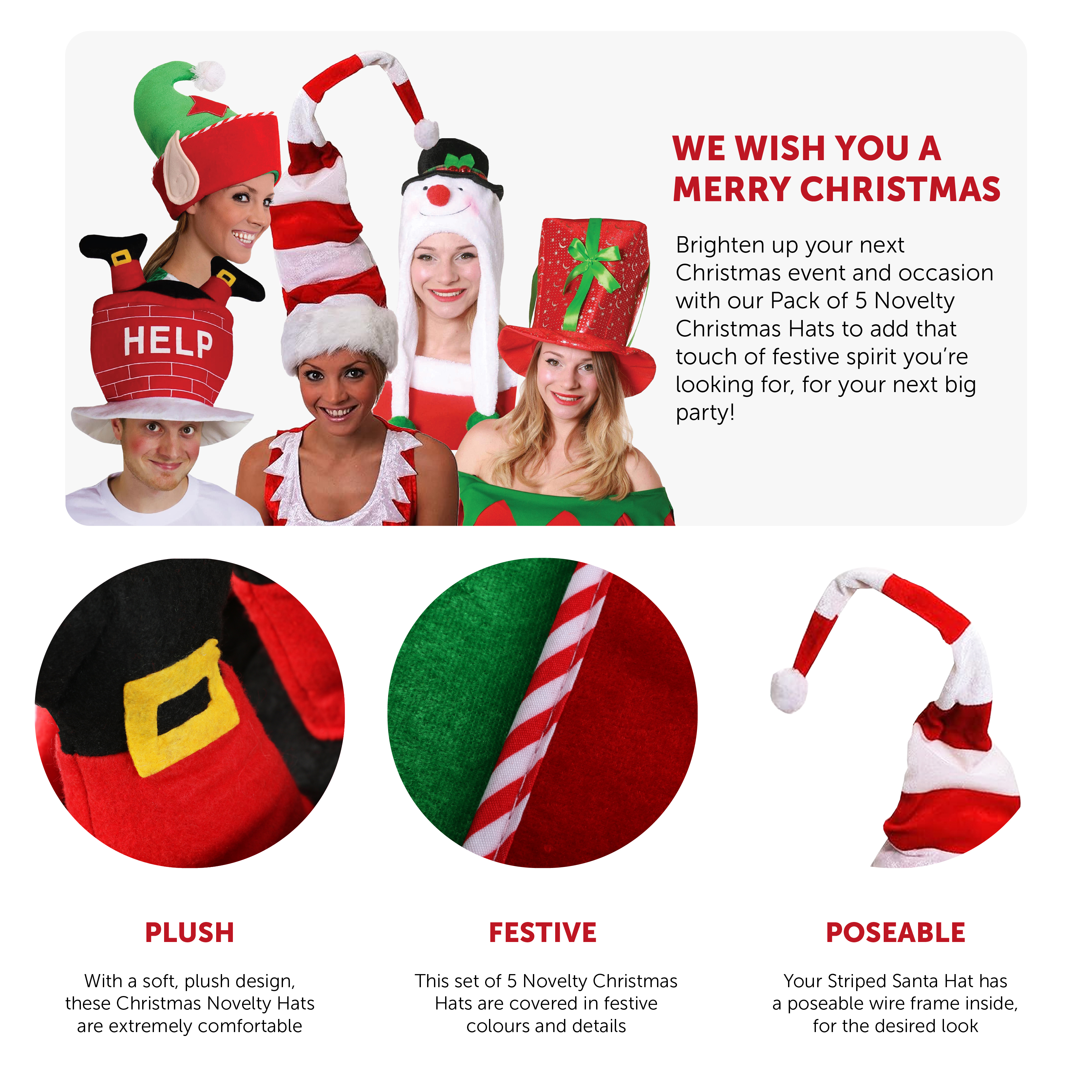 HAT SET INCLUDES: Your Christmas Hat Set includes 5x different Novelty Hats including, 1x Plush Red Christmas Present Hat covered in a festive Silver pattern and wrapped in a Green Ribbon Bow, 1x Soft White Snowman Head Hat, detailed with a Red Nose, a Black Top Hat with Holly and warm Ear Covers on either side with Green Pom-Poms, 1x Plush Red Chimney Shaped Hat with a White 'Snow' Brim, 'HELP' printed on the front and two Plush Legs sticking out of the top, 1x Red and White Stripes Santa Hat with a poseable Wire, and 1x Plush Green Elf Hat with a Red Star detailing the front, candy cane stitching and Elf Ears on either side!