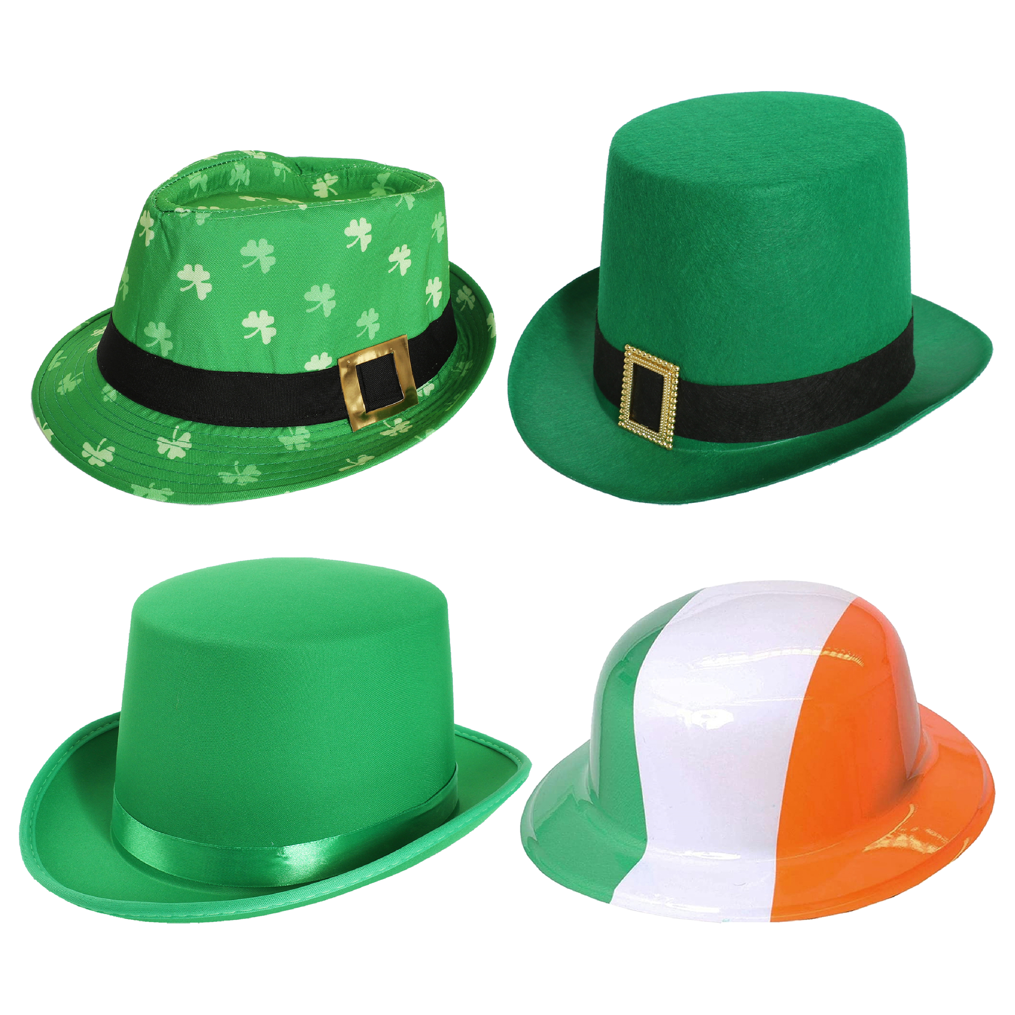 HAT SET INCLUDES: Your Irish Hat Set includes 4x different Novelty Hats including, 1x Dark Green Top Hat with a Gold Buckle, 1x Green Four Leaf Clover Headpiece with a comfortable Hood, 1x Green Trilby Hat covered in a Shamrock pattern with a Gold Buckle, and 1x Satin Green Top Hat, the perfect set to celebrate all things Irish!