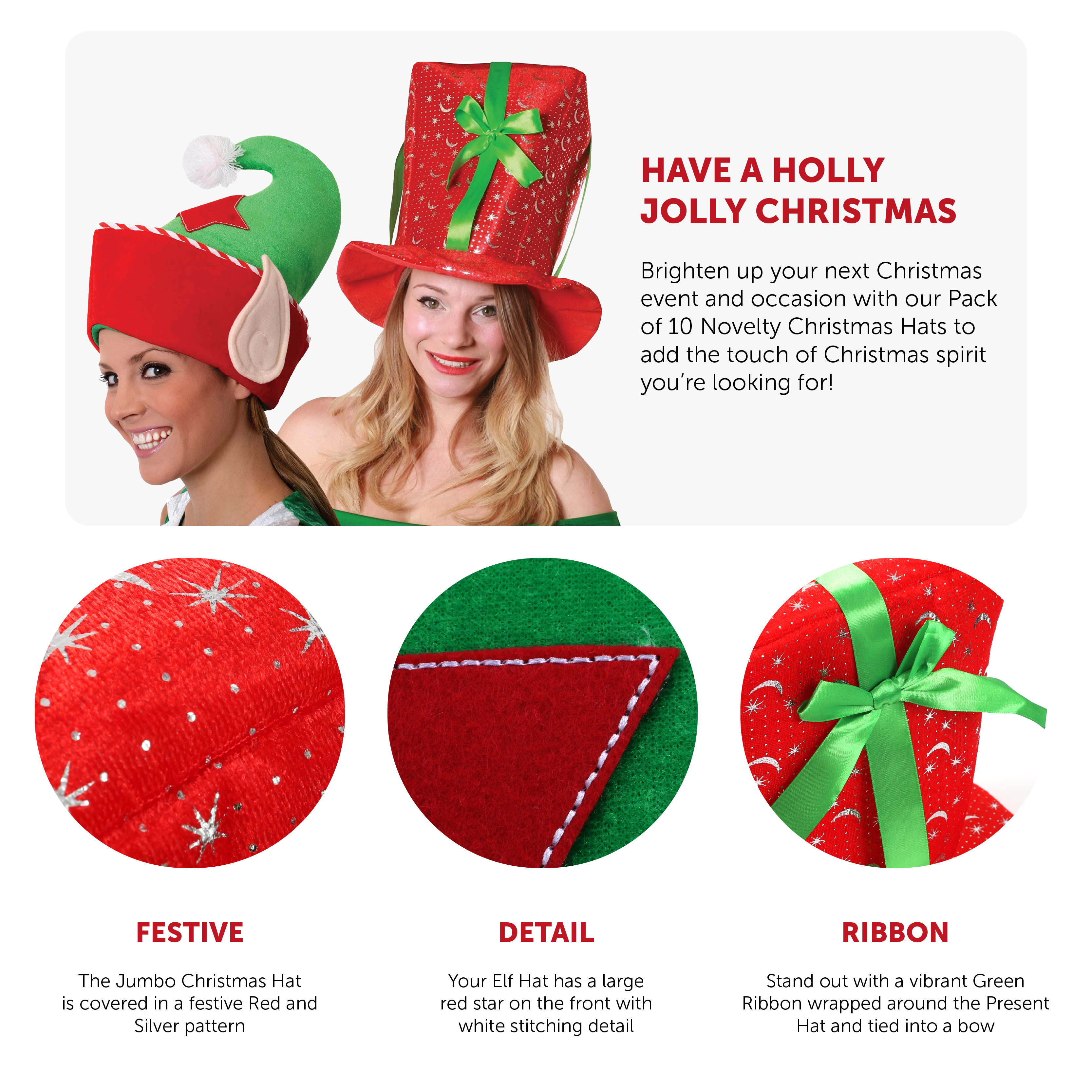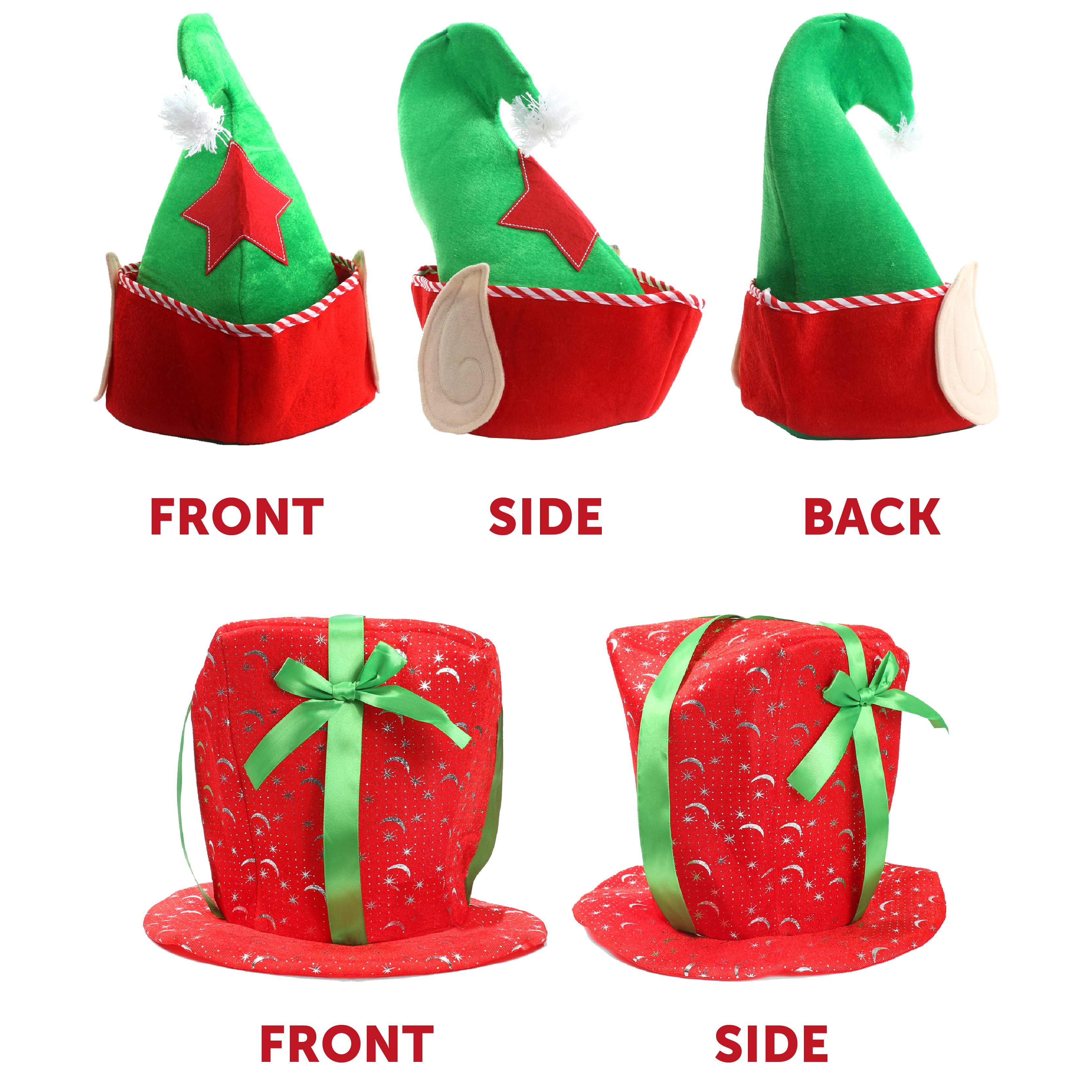PACK INCLUDES: Your Pack of 10 Novelty Christmas Hats includes 5x Plush Red Jumbo Christmas Present Hats, each wrapped in a Large Green Ribbon Bow, and covered in a festive Silver pattern, and 5x Plush Green Elf Hats with Large Red Stars on the front, Candy Cane style edging and Elf Ears attached to the sides!