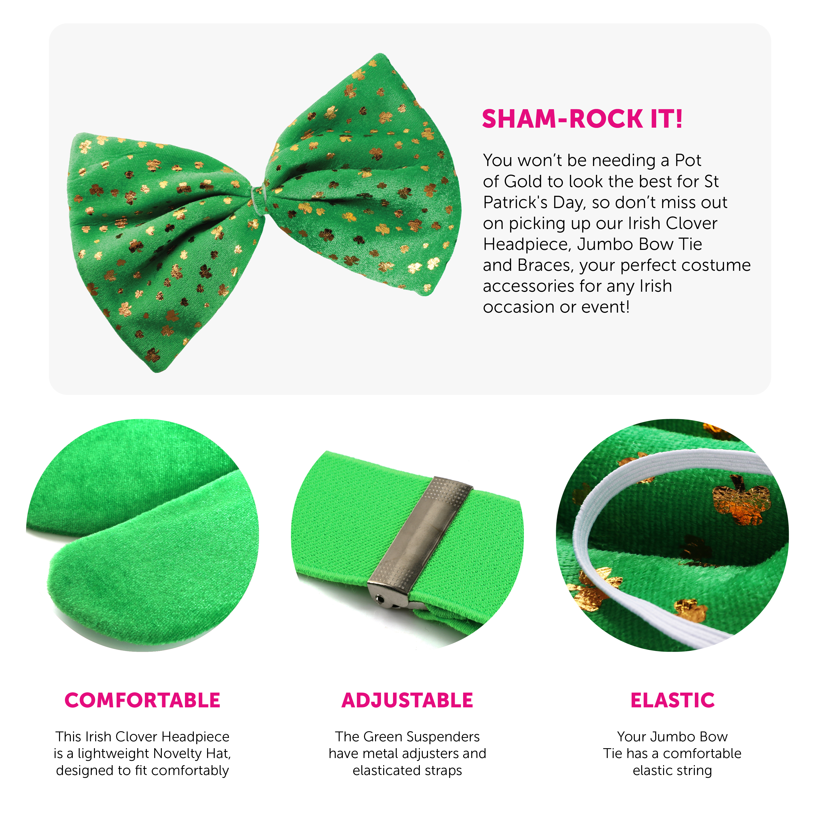 IRISH SET INCLUDES: This Irish Set includes a large Green Irish Clover Headpiece with a comfortable Green Hood, an oversized Green Bow Tie with a Golden Shamrock pattern and a comfortable elastic strap, and elasticated Green Suspenders with metal adjusters and fasteners, a the perfect Irish Set for any event!