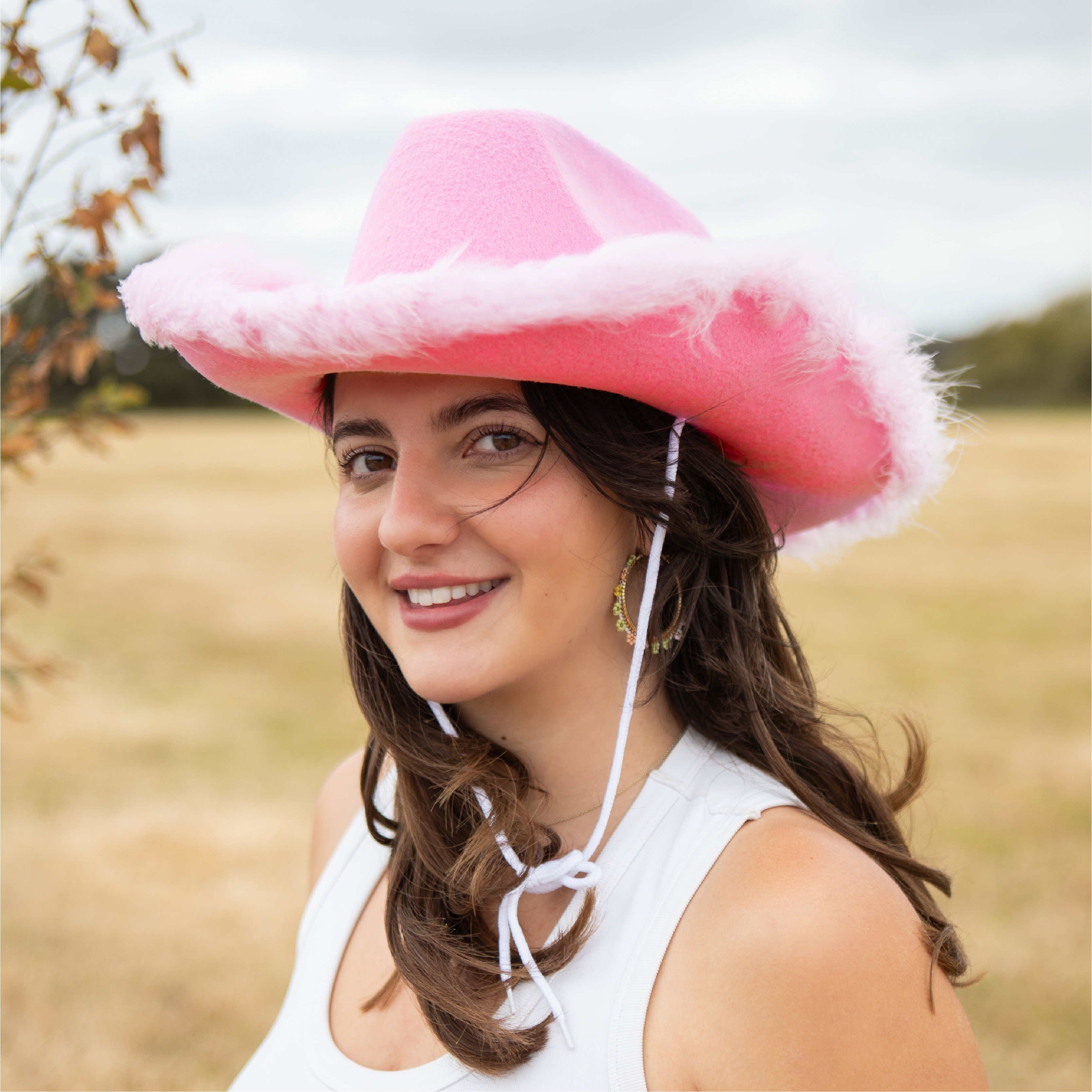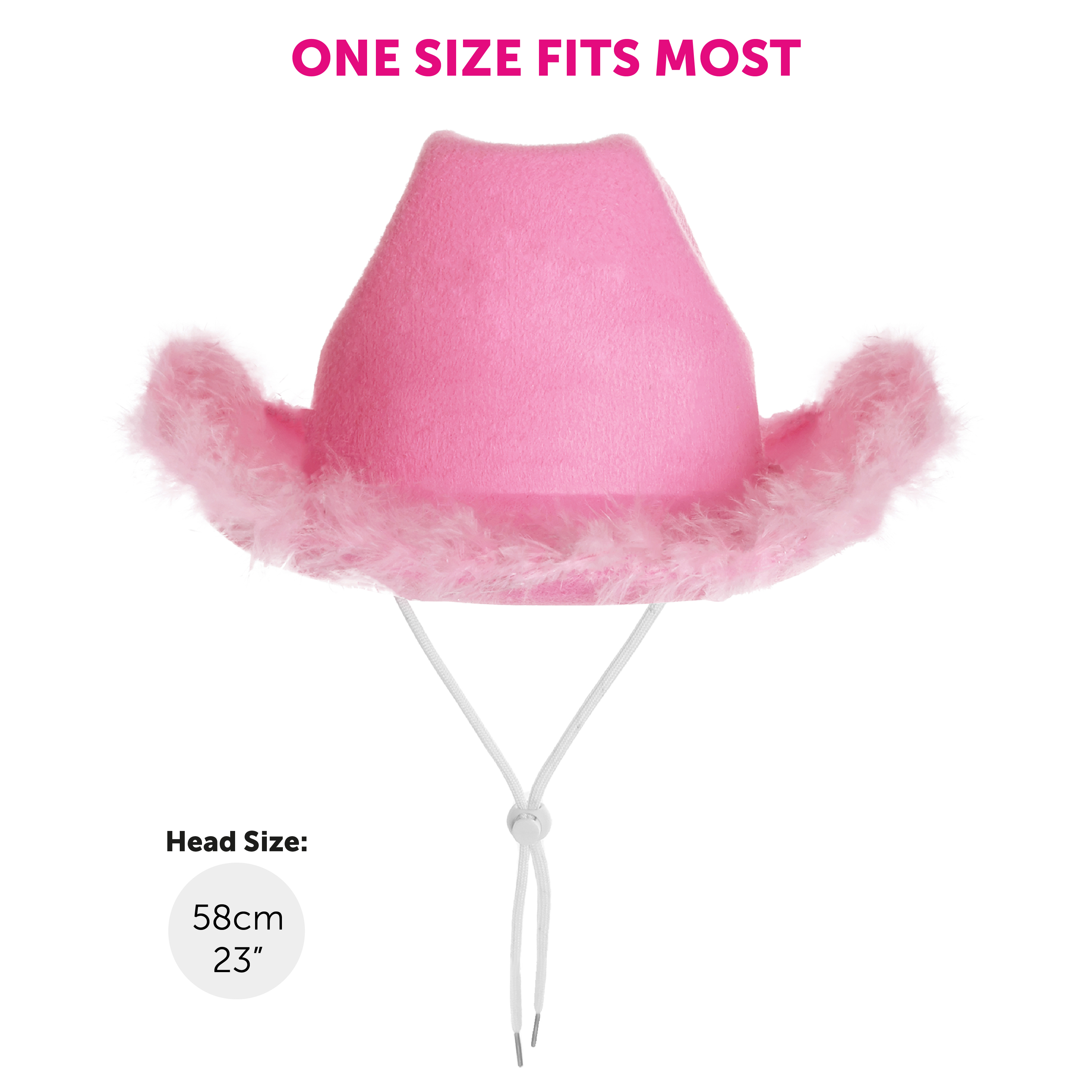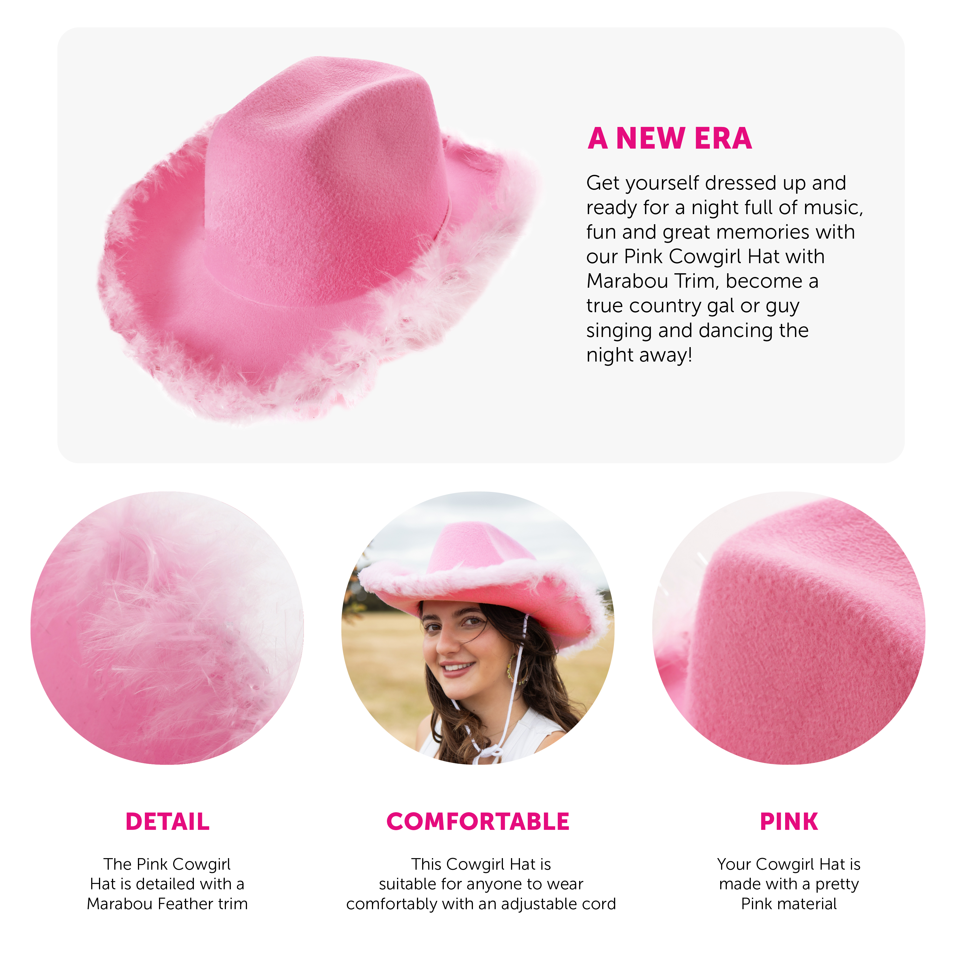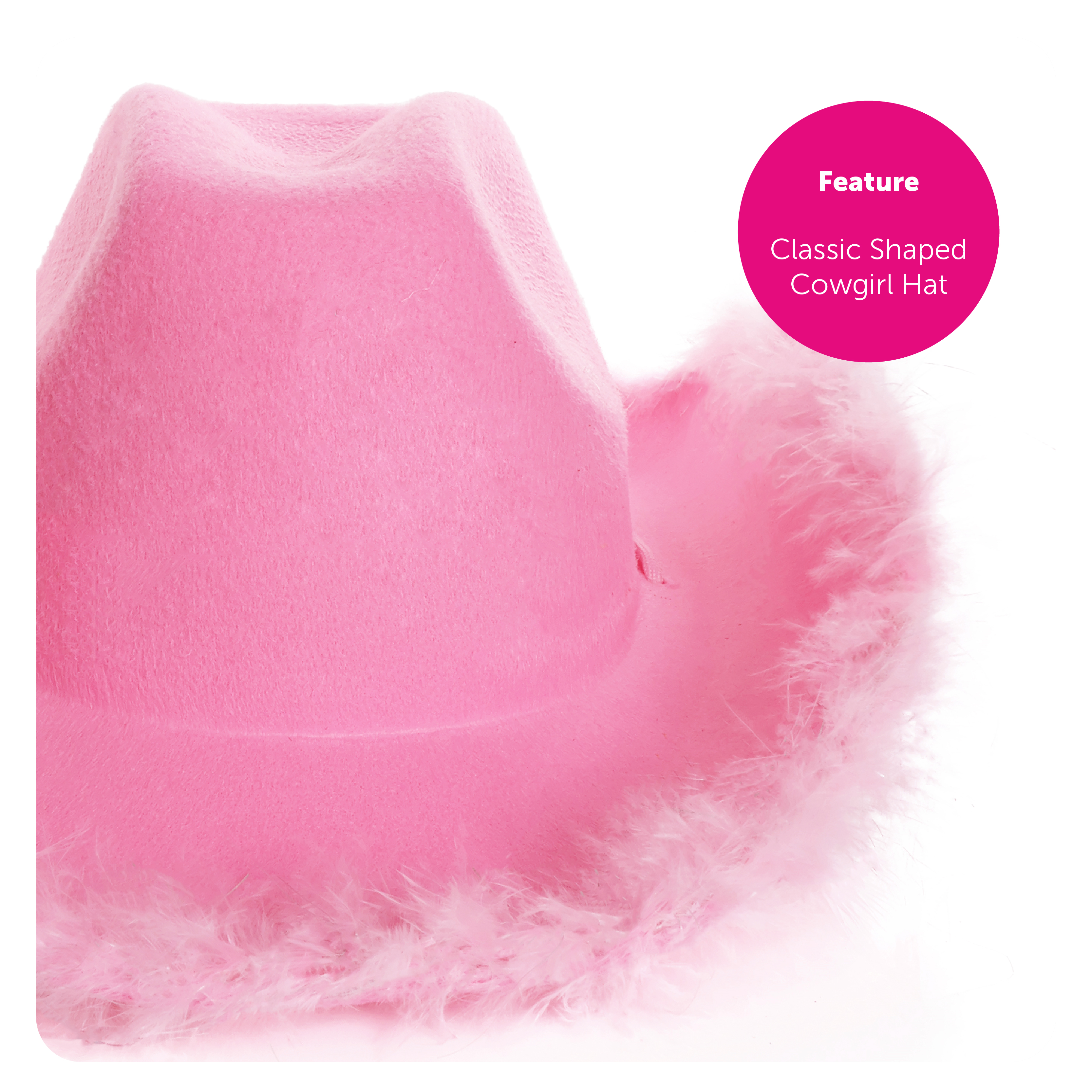 COWGIRL HAT DETAILS: This Cowgirl Hat is a pretty Pink colour, with a fluffy, Pink Marabou Feather detail around the brim and an adjustable string for extra comfort, the perfect way to finish off your outfit!