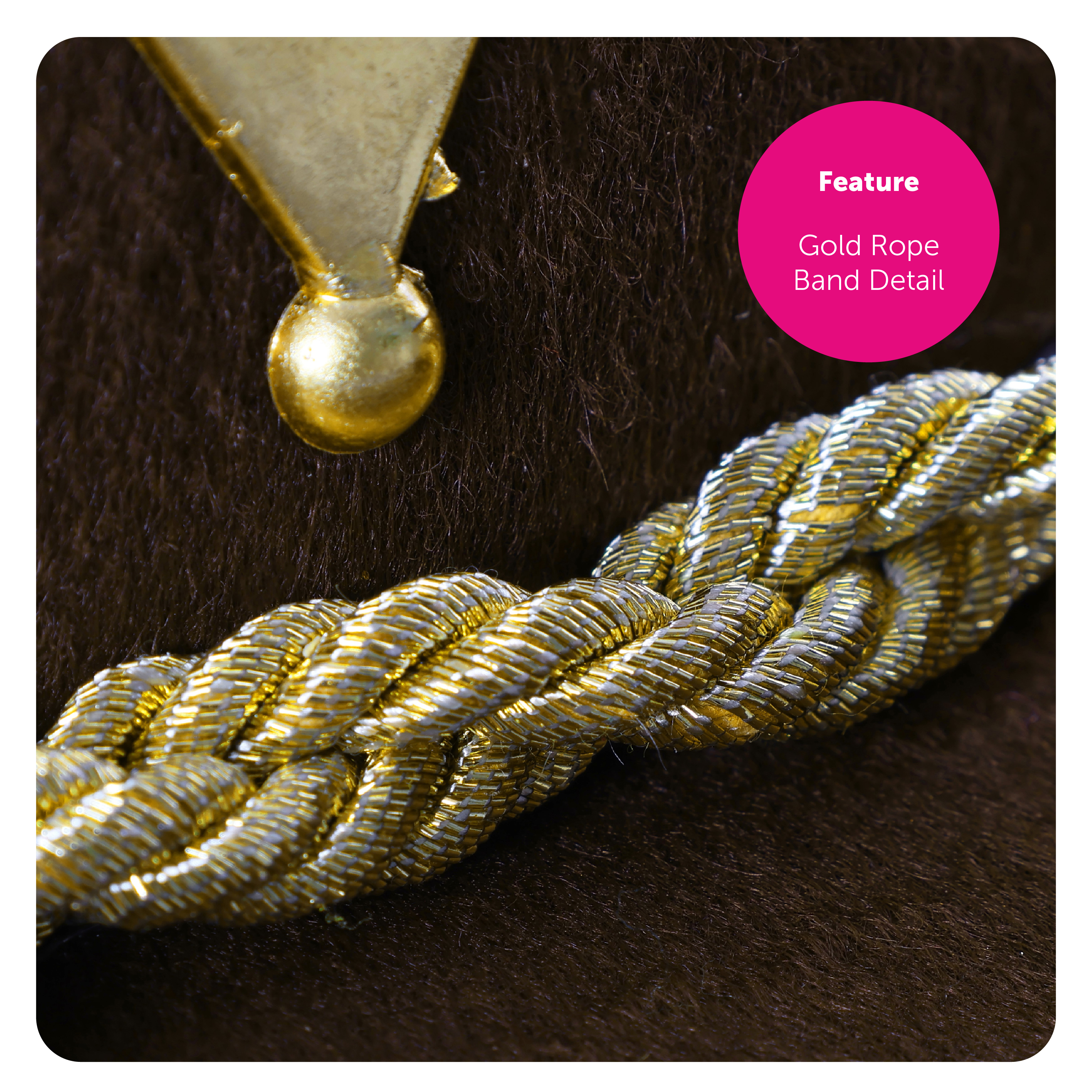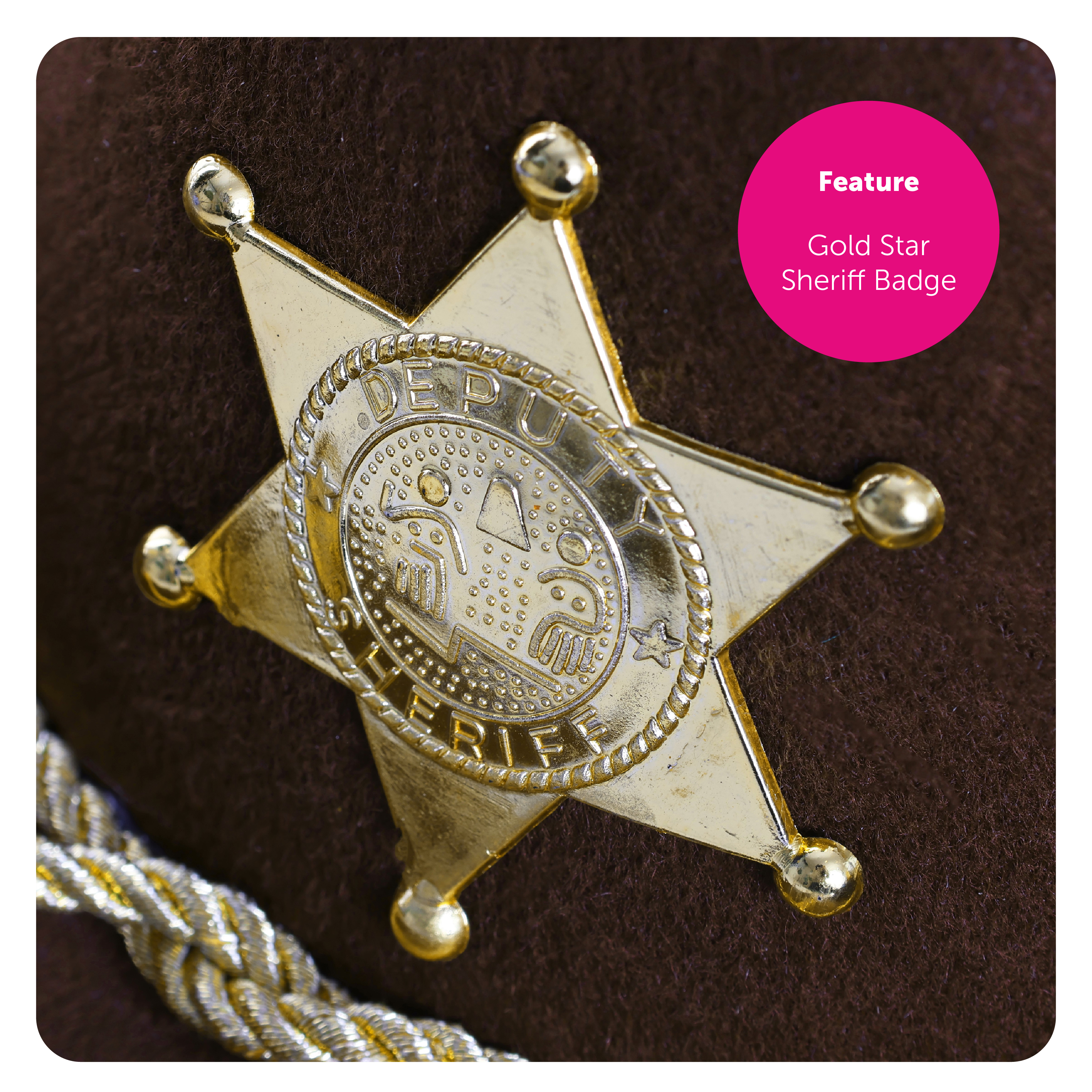HAT DETAILS: Your US Sheriff Hat is a Brown Cowboy shaped Hat with a Gold Rope Band tied around the brim and a Gold Sheriff Badge on the front, the perfect accessory to Sheriff outfit!