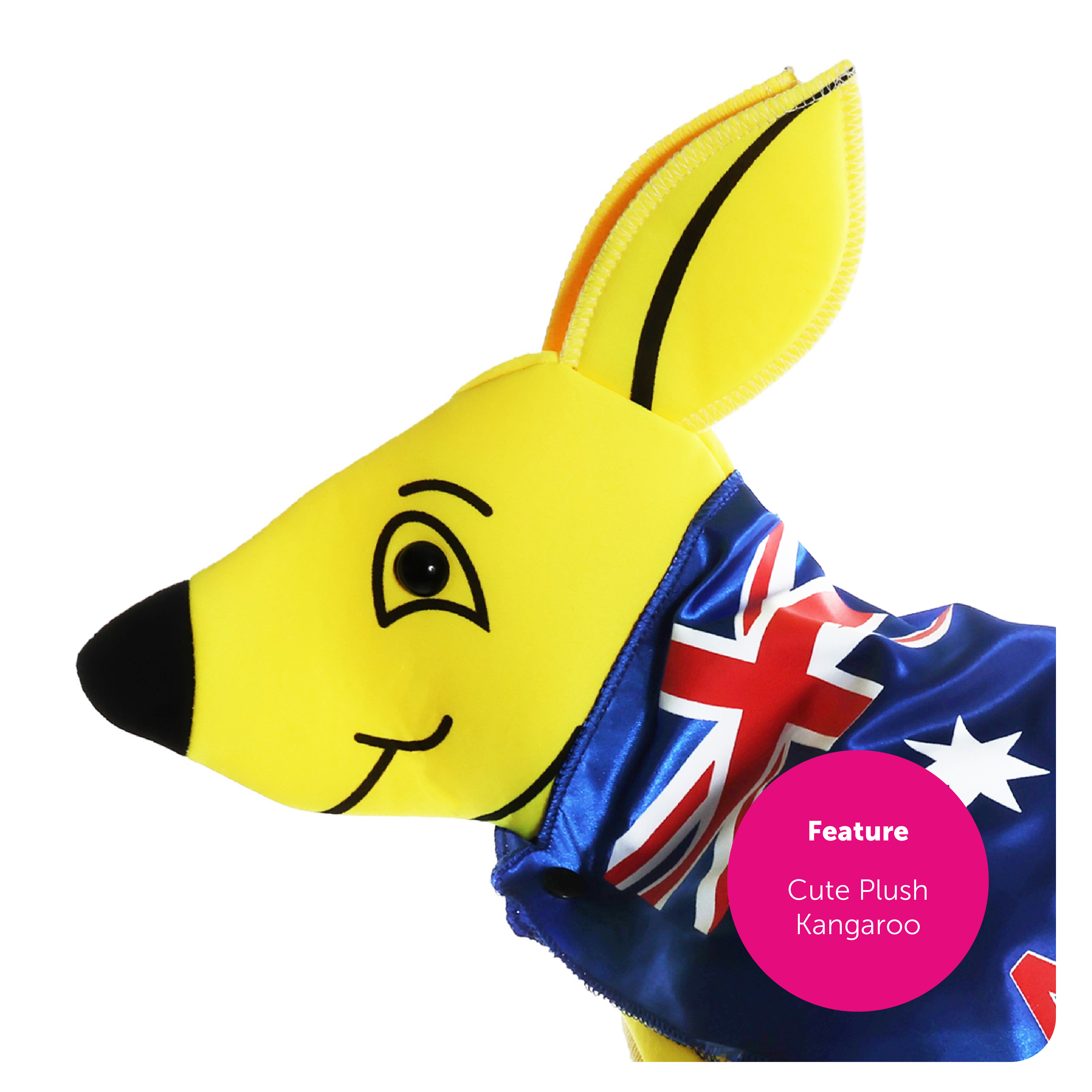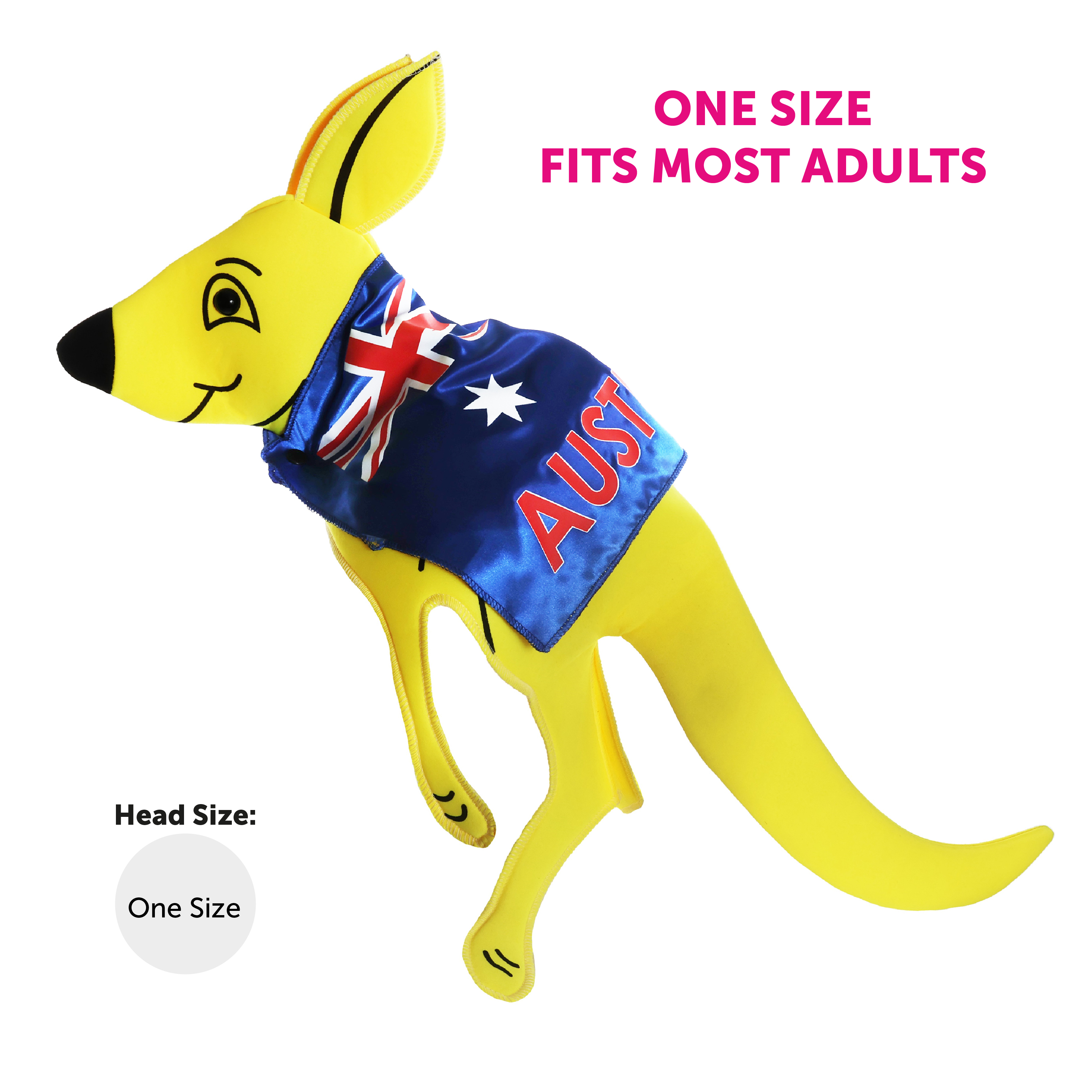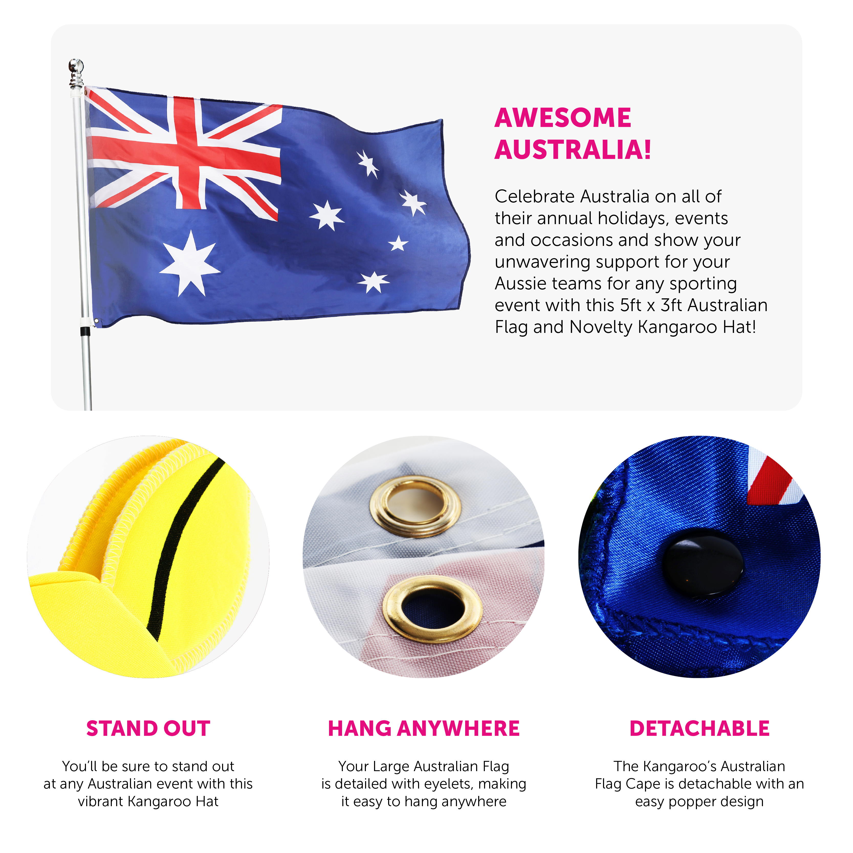 SET INCLUDES: Your Australian Set includes a 5ft x 3ft Australian Flag with eyelet holes for easy hanging, and a Plush Yellow Novelty Kangaroo Hat with a detachable Australian Flag Cape on its back, the perfect set for all Australian events!