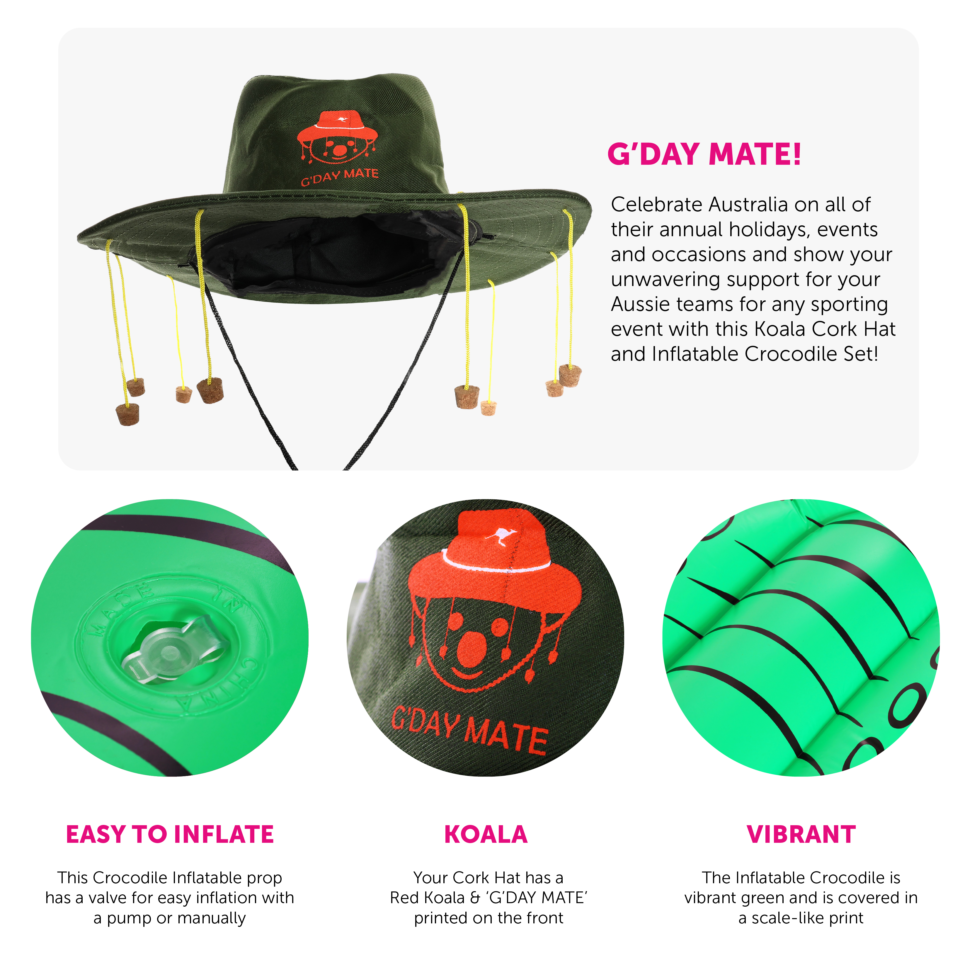 SET INCLUDES: Your Australian Set includes a large Green Inflatable Crocodile with an easy to inflate design, and a quality Green Hat with a red Koala Print and 'G'DAY MATE' on the front and corks hanging by string attached all around the brim, the perfect look for all Australian events!