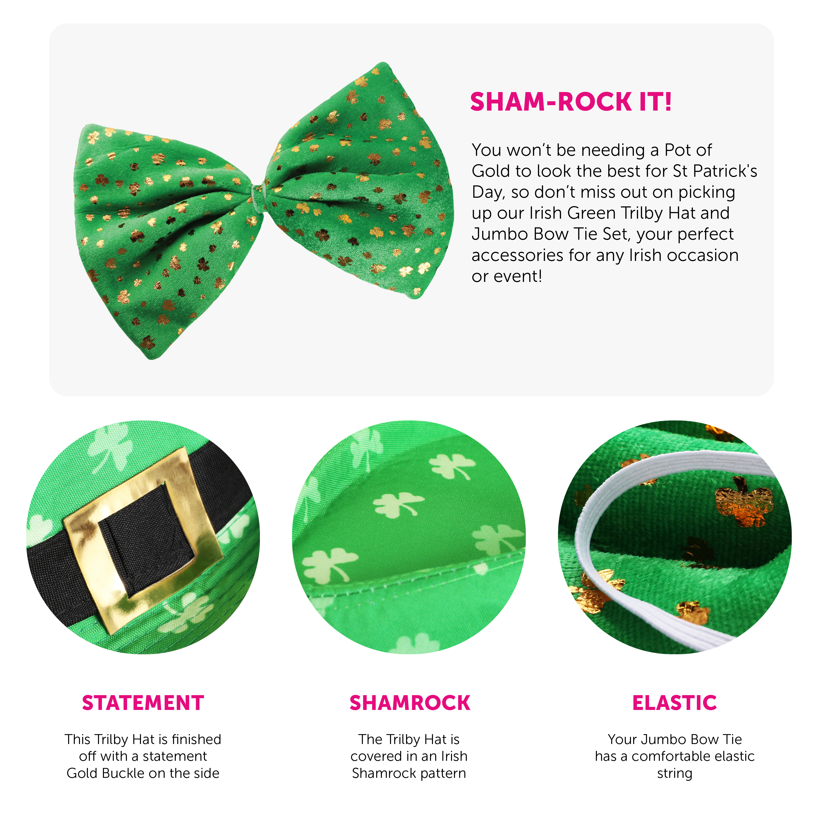 ACCESSORY SET DETAILS: This Accessory Set includes a Green Trilby Hat covered in Shamrock print with a Black band and statement Gold Buckle, and a Jumbo Green Bow Tie covered in gold Shamrock print and attached to elasticated string, to finish off your outfit perfectly!