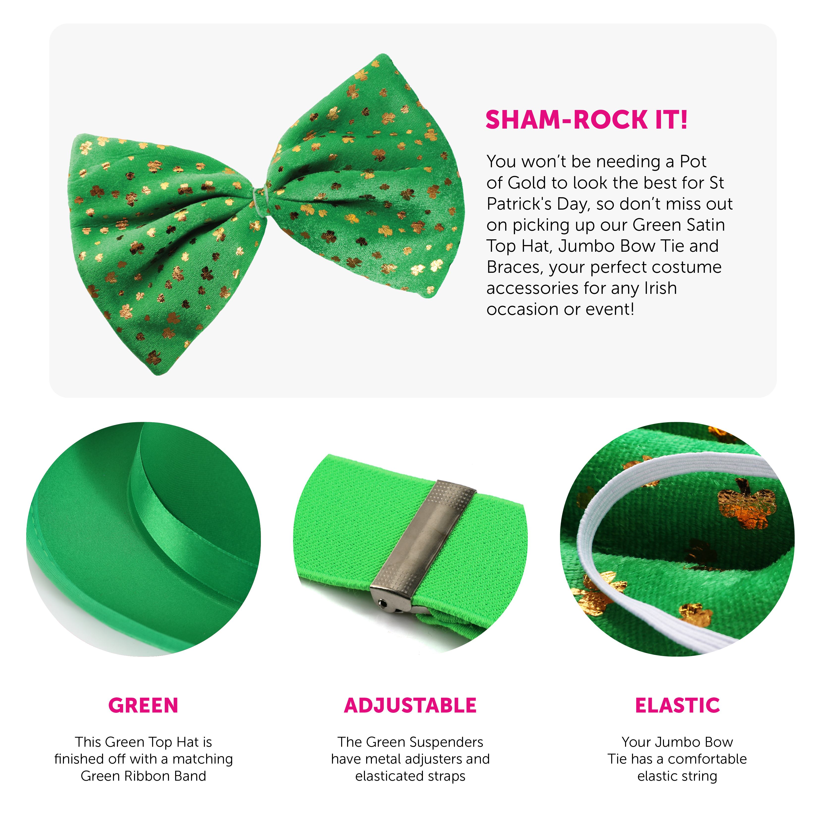 GREEN SATIN TOP HAT, JUMBO BOW TIE & BRACES: You won’t be needing a Pot of Gold to look the best for St Patrick's Day, so don’t miss out on picking up our Green Satin Top Hat, Jumbo Bow Tie and Braces, your perfect costume accessories for any Irish occasion or event!