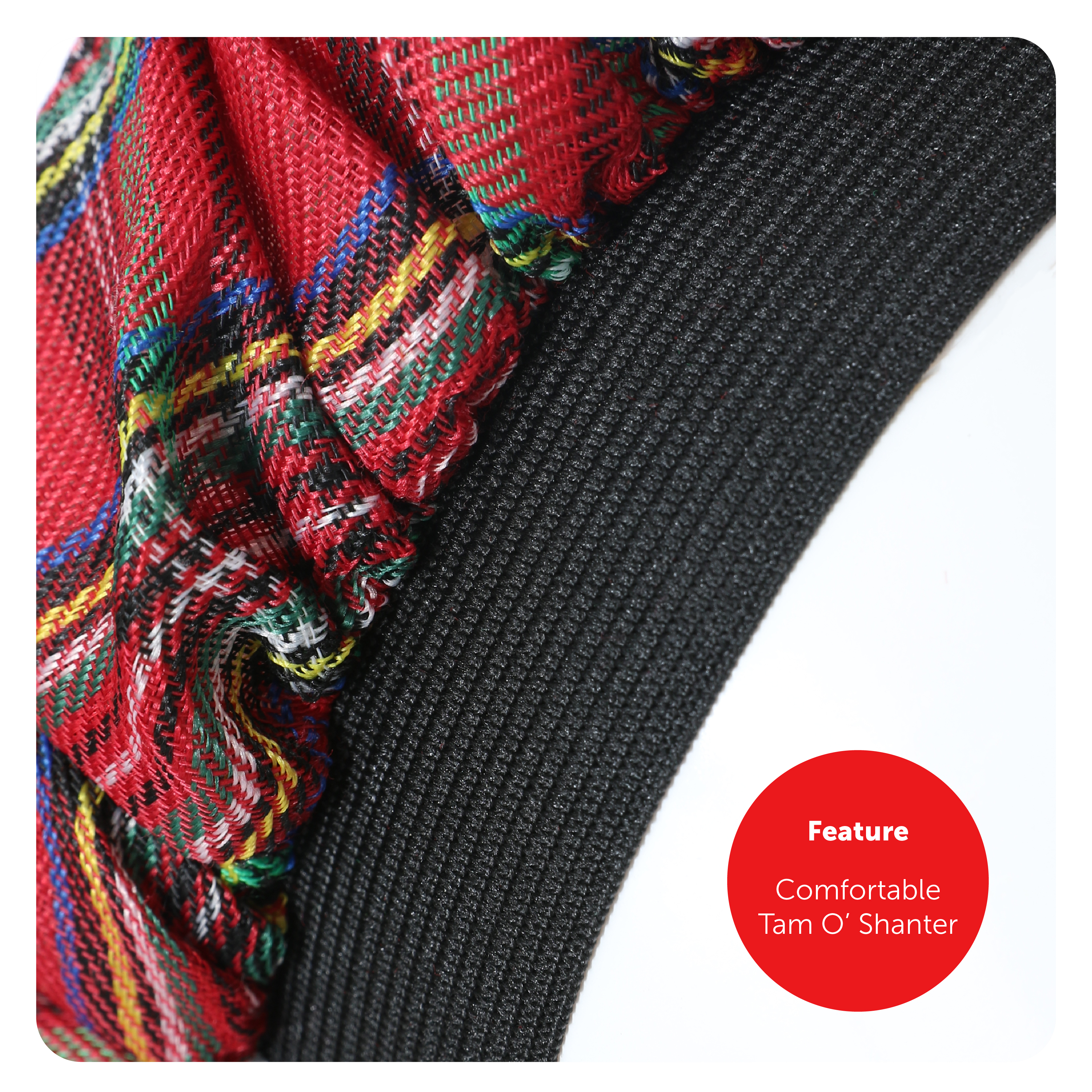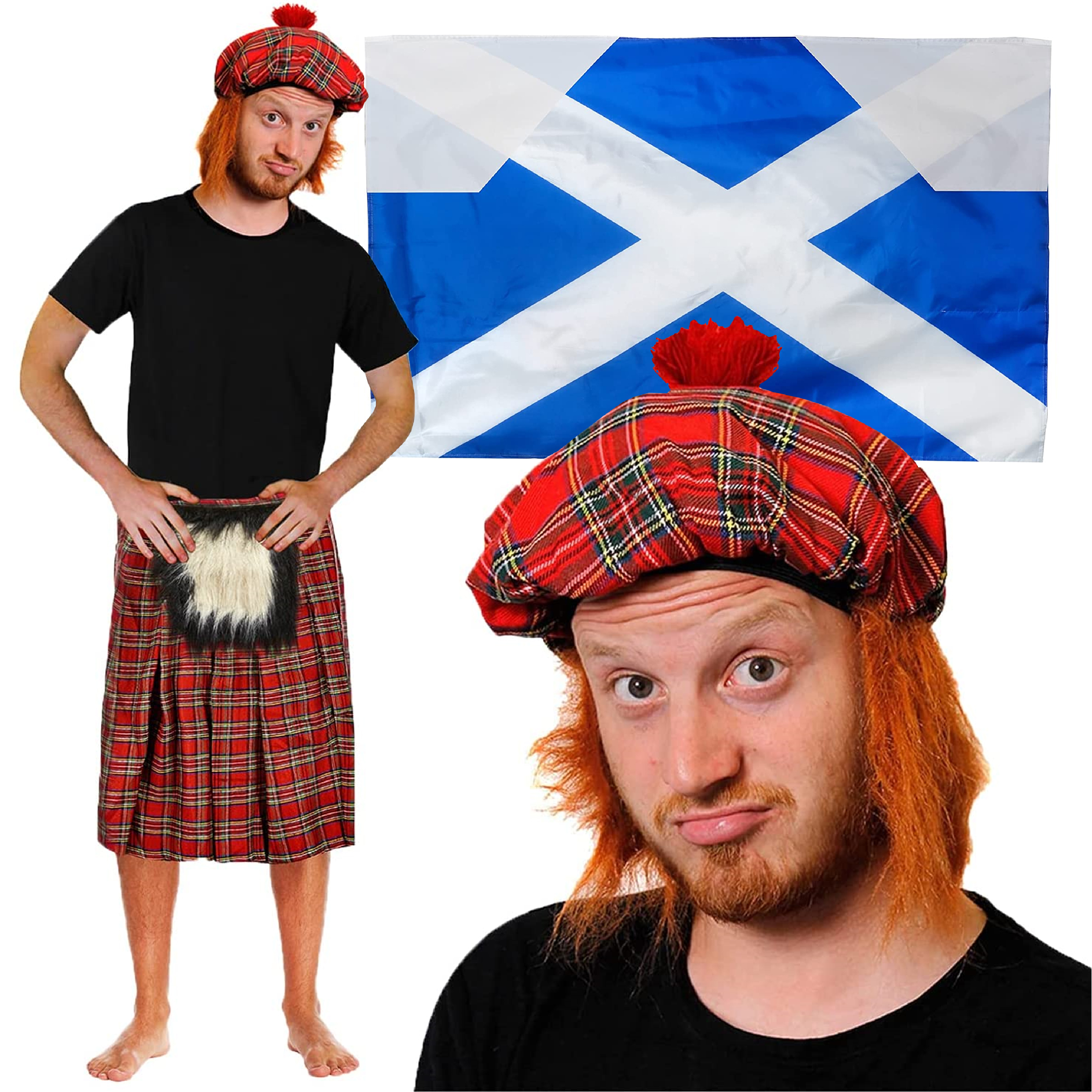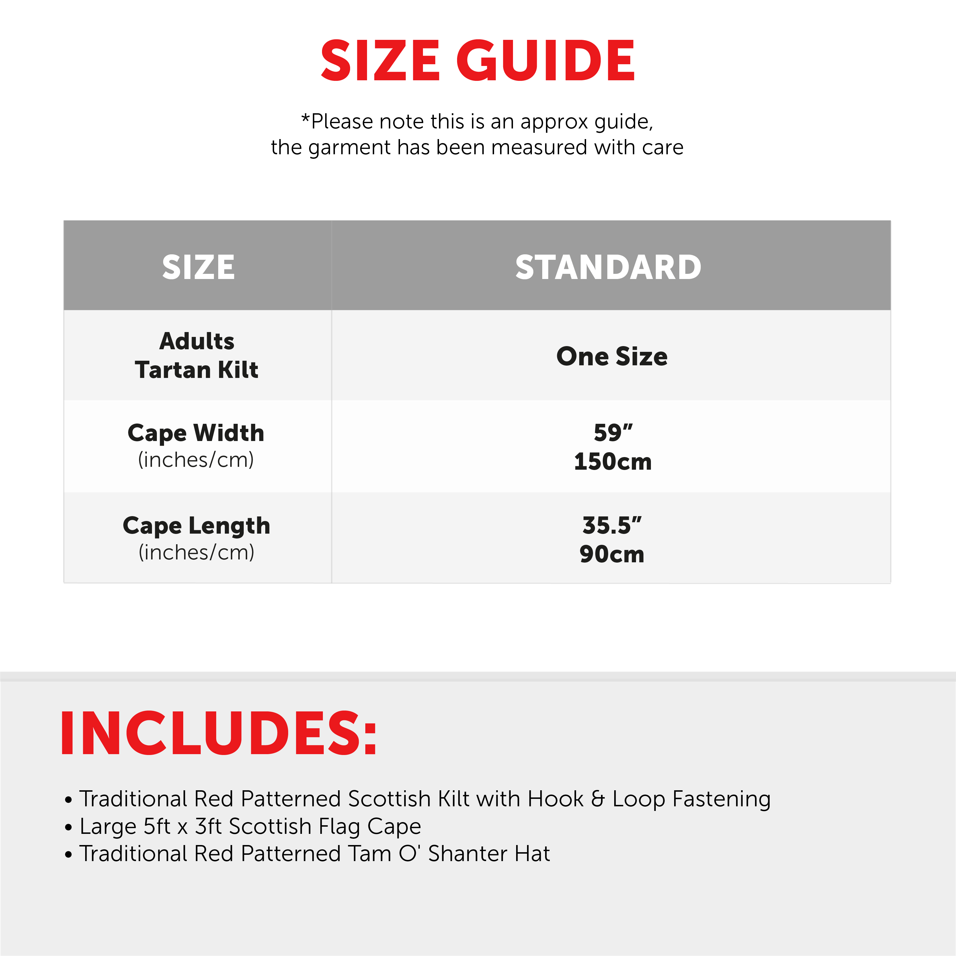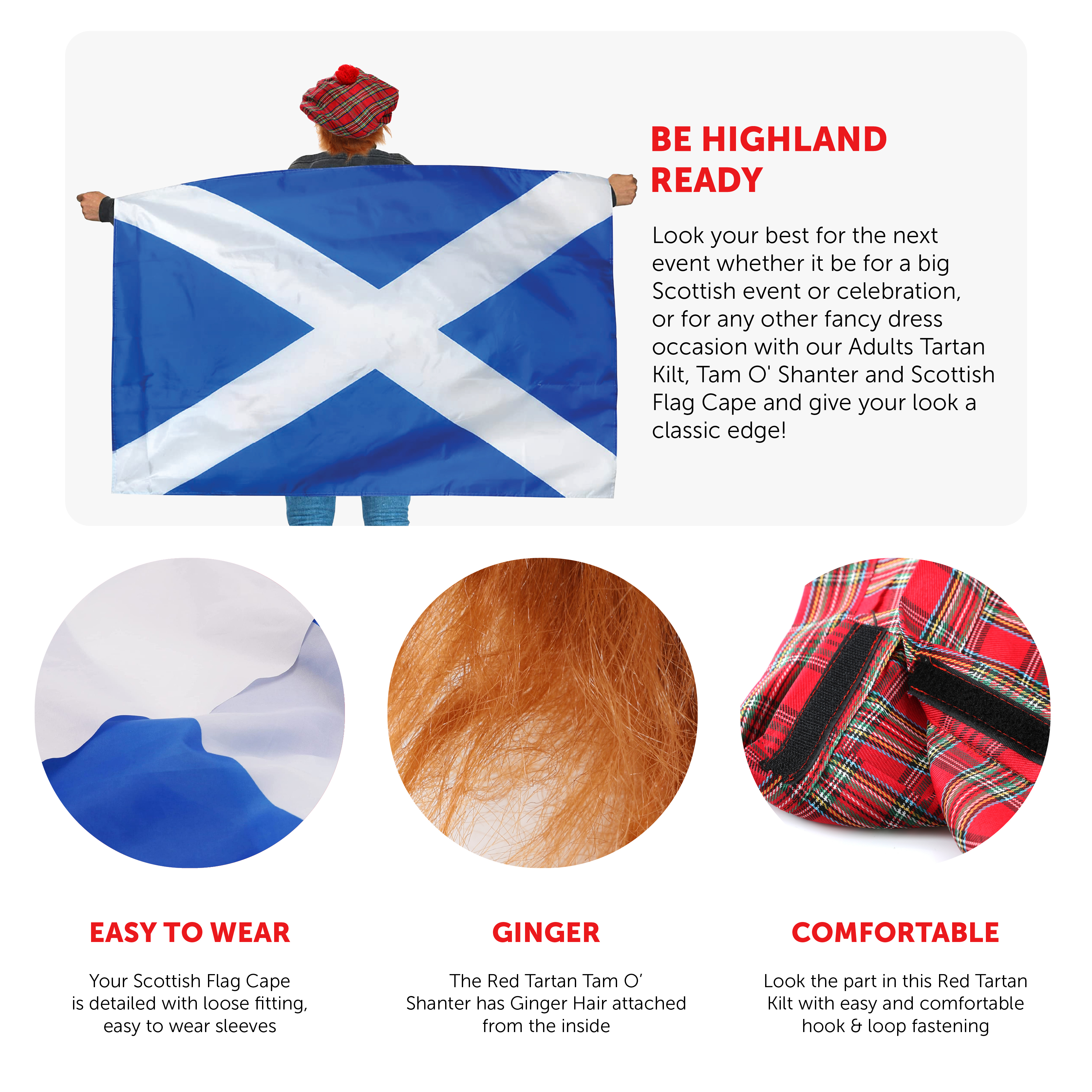 SET INCLUDES: This Adults Scottish Set includes a classic Red patterned Scottish Tam O' Shanter Hat with a Red Pom Pom on top and Red Hair attached inside, a Scottish Kilt covered in a traditional styled Red Tartan pattern, with a soft Black and White Sporran attached to the front, and a comfortable hook and loop fastening design, and a large 5ft x 3ft Scottish Flag Cape with sleeves, you'll be sure to look bonny in this Scottish outfit!
