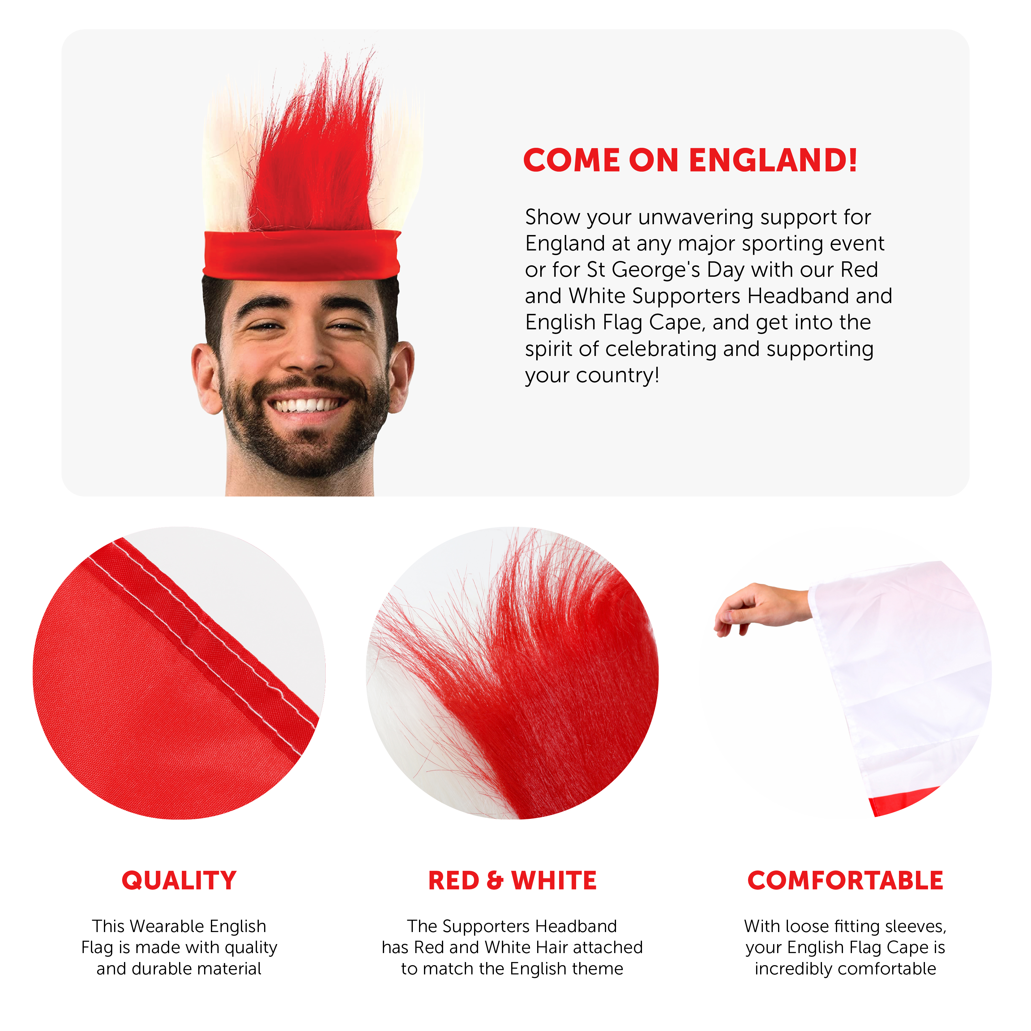 ENGLISH SET INCLUDES: This English Set includes a quality elasticated Red Headband with Red and White Hair attached, and a large English Flag Cape with the St George's Cross and comfortable, loose fitting sleeves, the perfect look to support your Country!