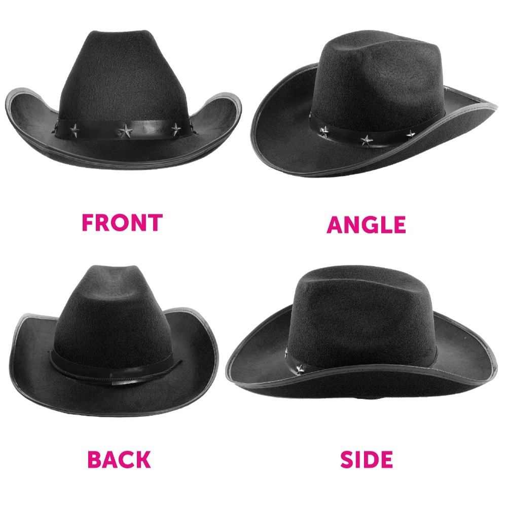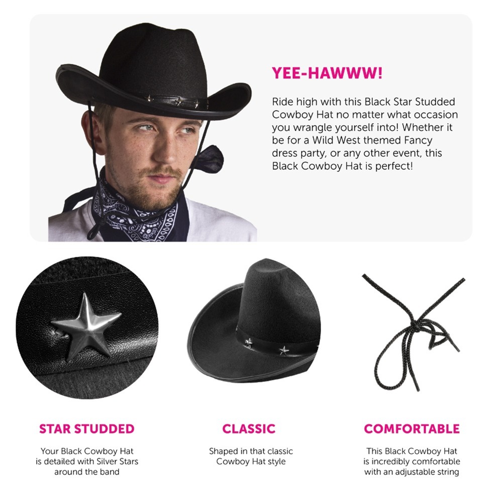 • A deep black cowboy hat featuring silver star studs around the band and an adjustable white chin string for secure and comfortable wear.