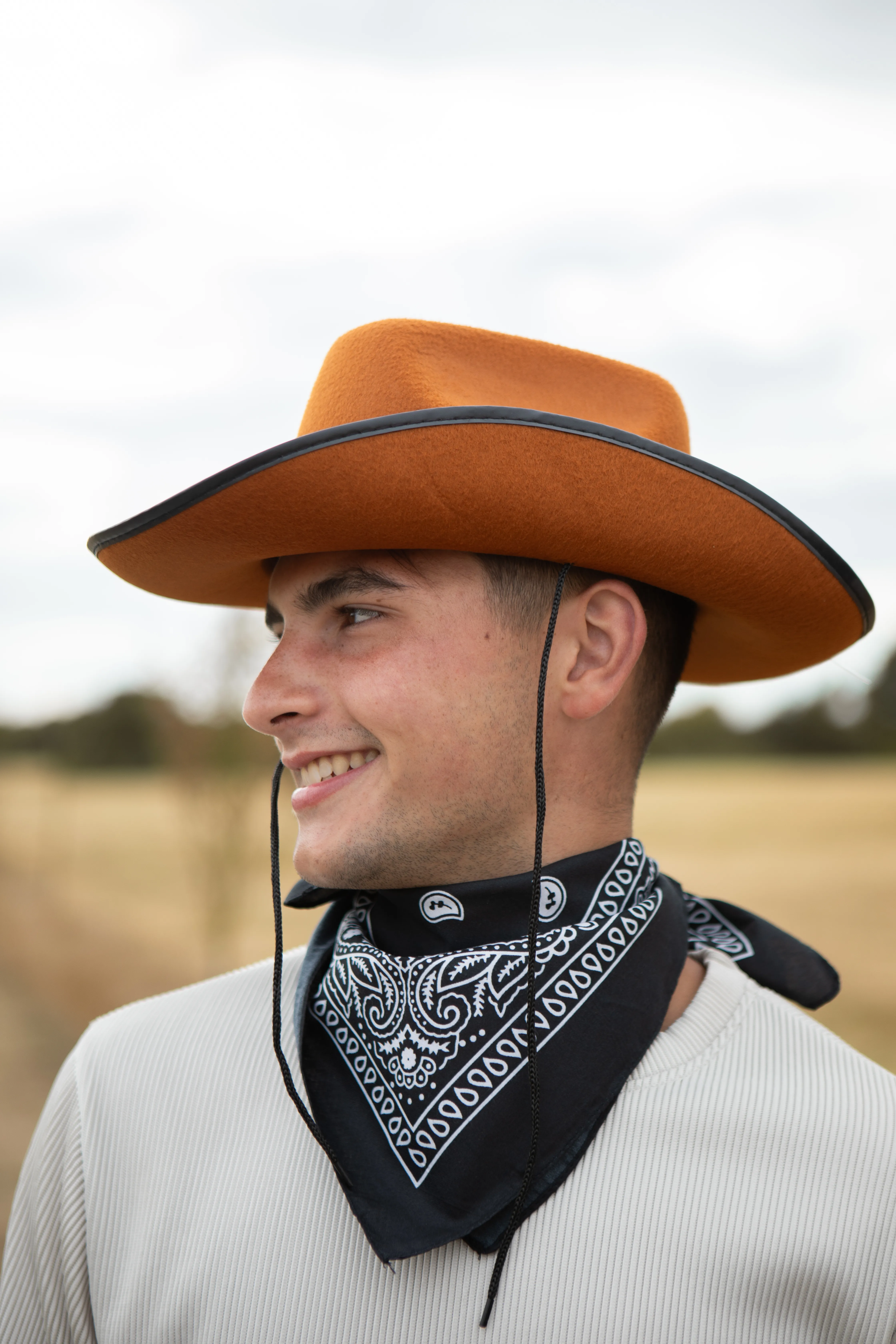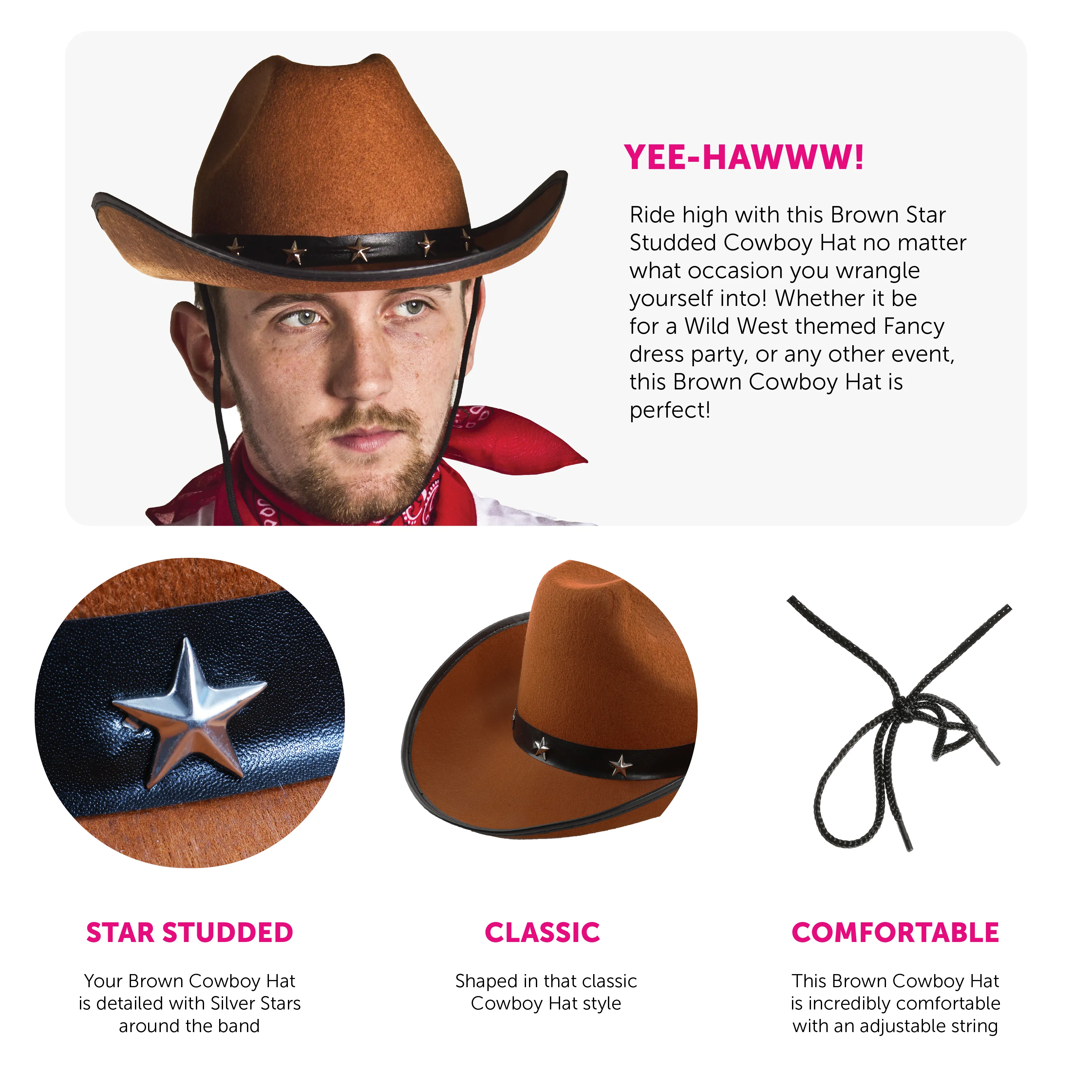 BROWN STUDDED COWBOY HAT: Saddle up with this Brown Star Studded Cowboy Hat — the perfect accessory for Western fancy dress, themed nights, festivals, and costume events. The rich brown felt finish and silver studs give it an authentic cowboy style.