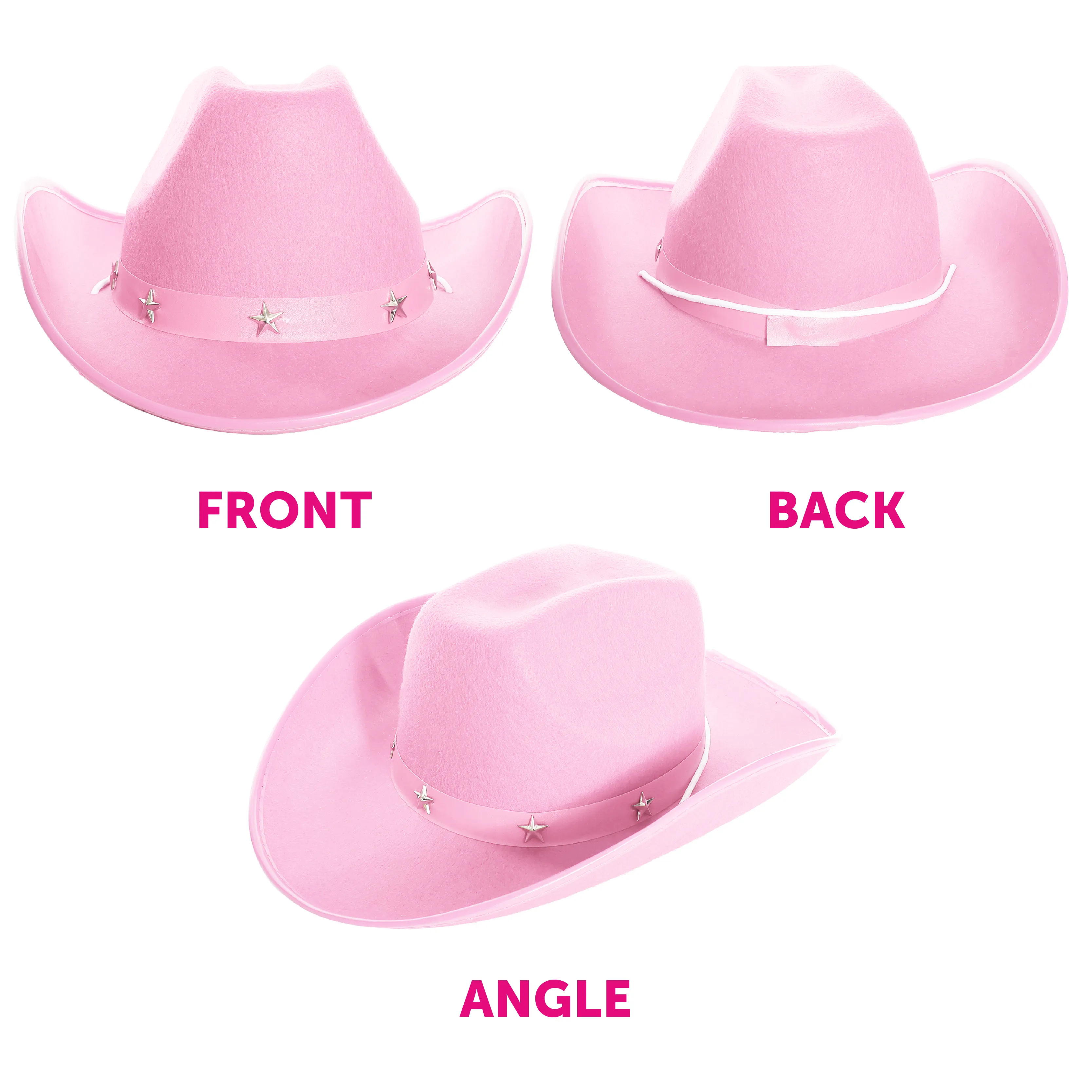 HAT DETAILS: This stylish cowboy hat features a light pink finish, silver star studs around the band, and an adjustable white chin strap for comfort and secure wear — the ideal finishing touch for your outfit.