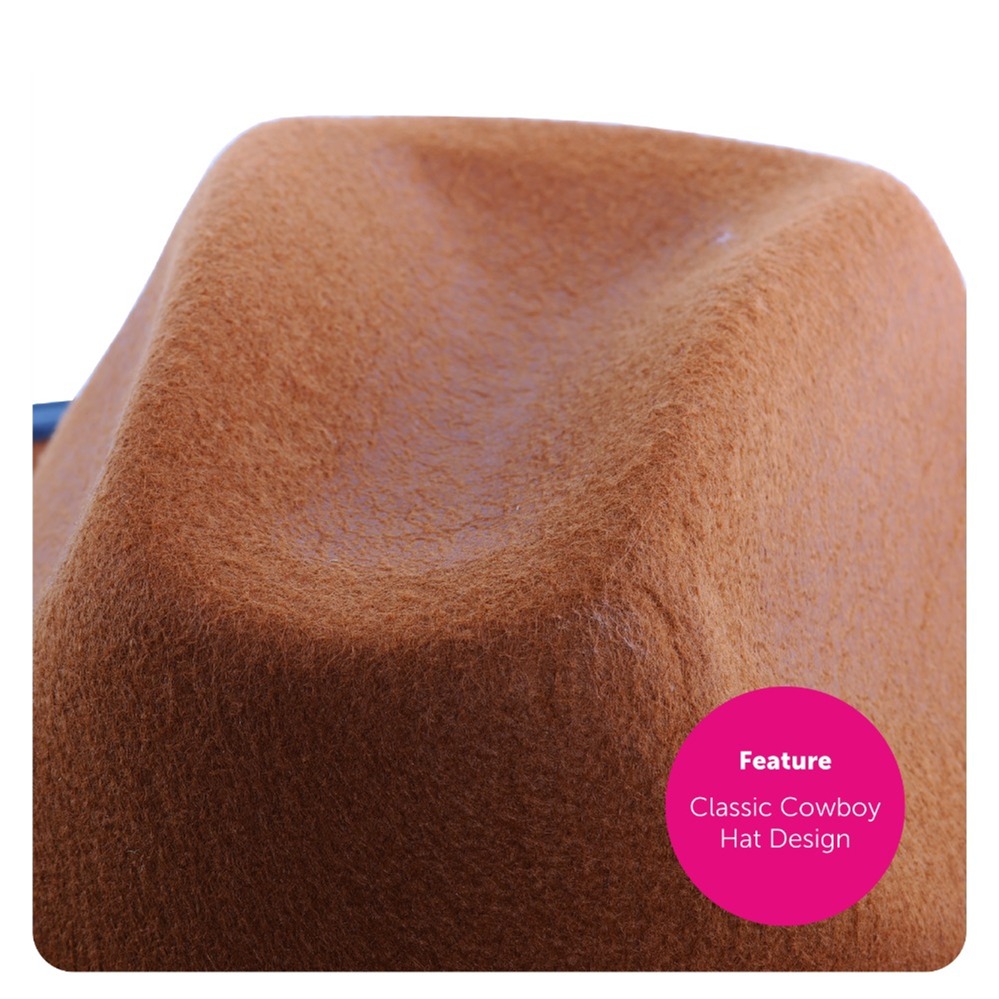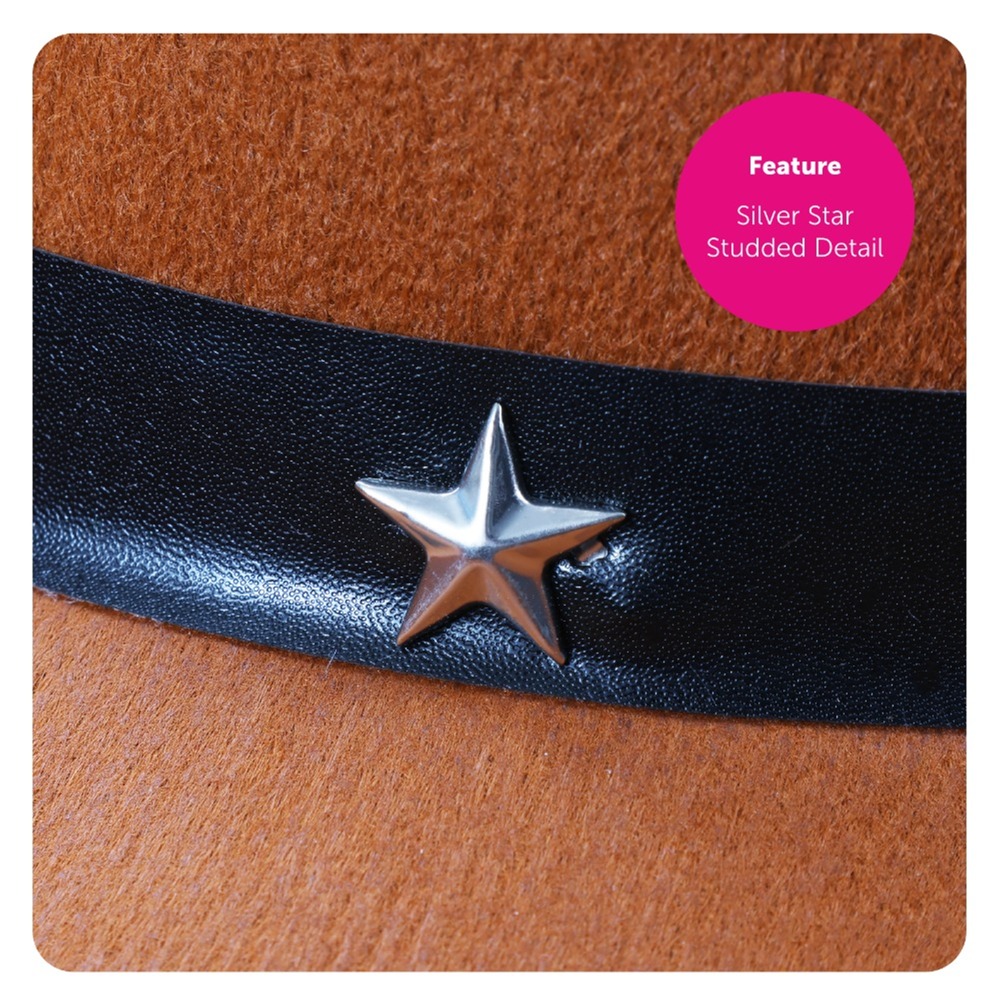 COWBOY HAT DETAILS: This Cowboy Hat features a rich Brown felt design with Silver Star studs decorating the band, paired with an adjustable black chin strap for added comfort and a secure fit. It’s the ideal finishing touch to complete your Western look.