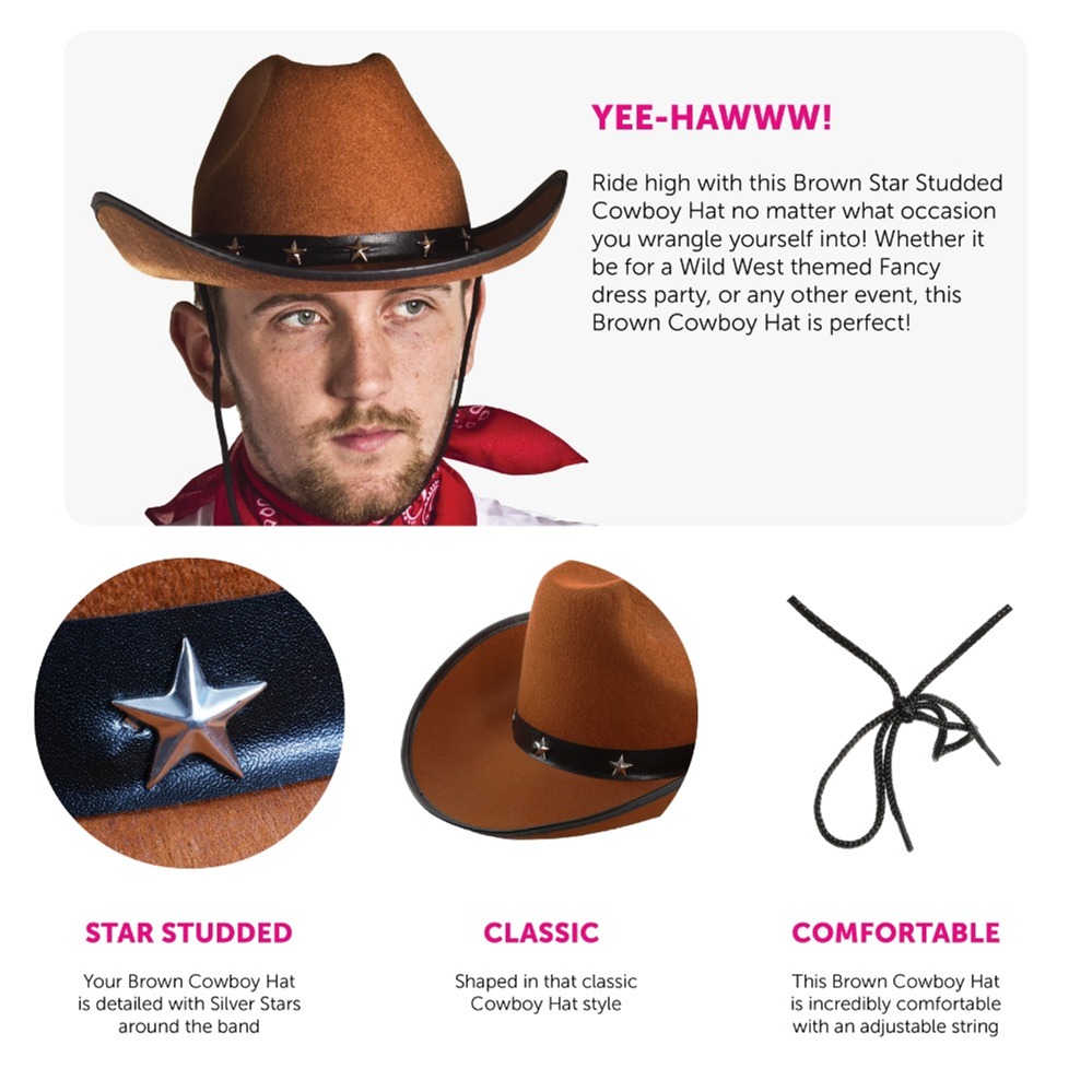 BROWN STUDDED COWBOY HAT: Saddle up in style with this Brown Star Studded Cowboy Hat, the perfect accessory for any Wild West themed Fancy Dress party, festival, night out, or just for adding a bit of cowboy attitude to your outfit! This bold Brown Cowboy Hat is guaranteed to stand out wherever the adventure takes you.