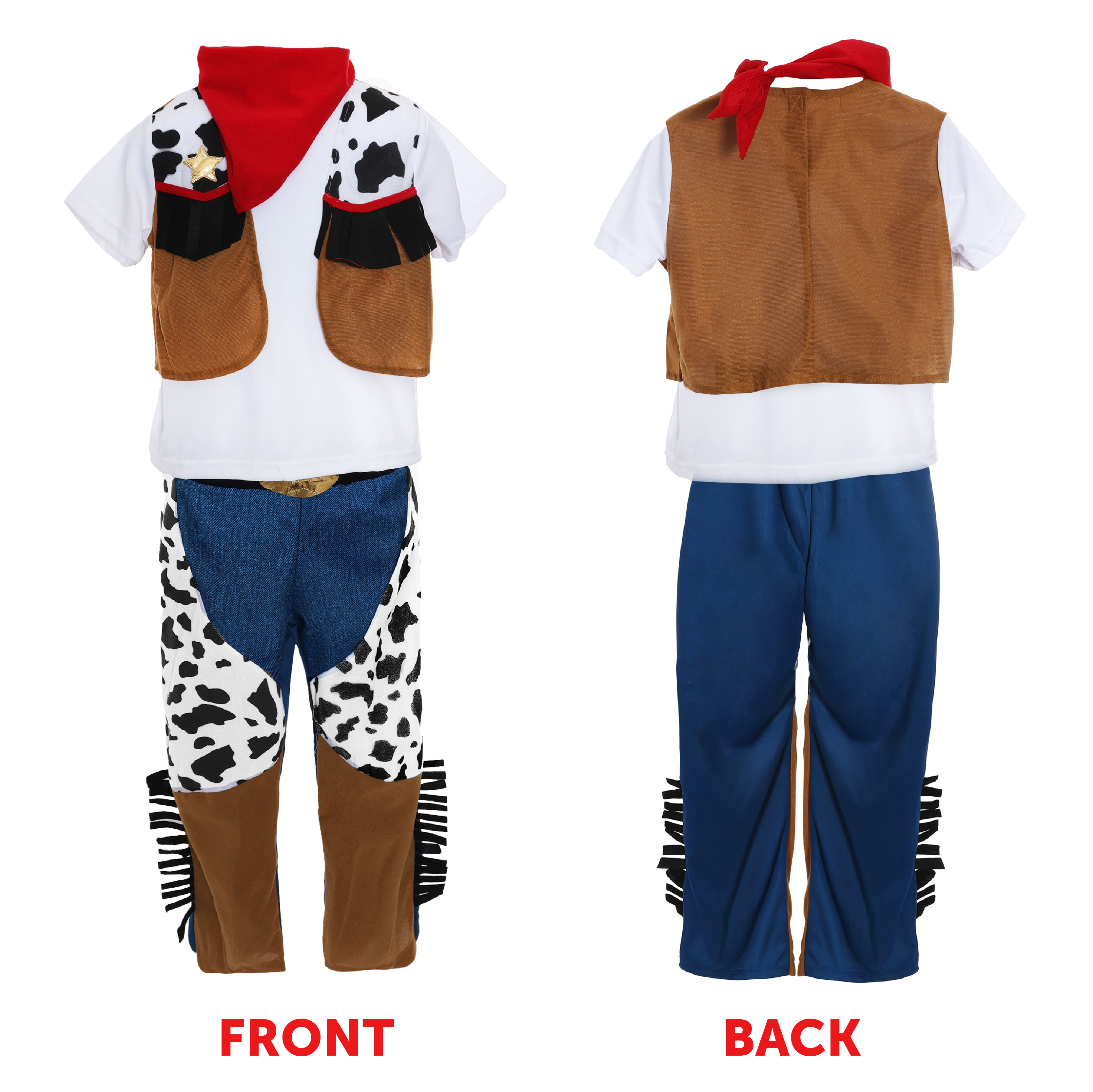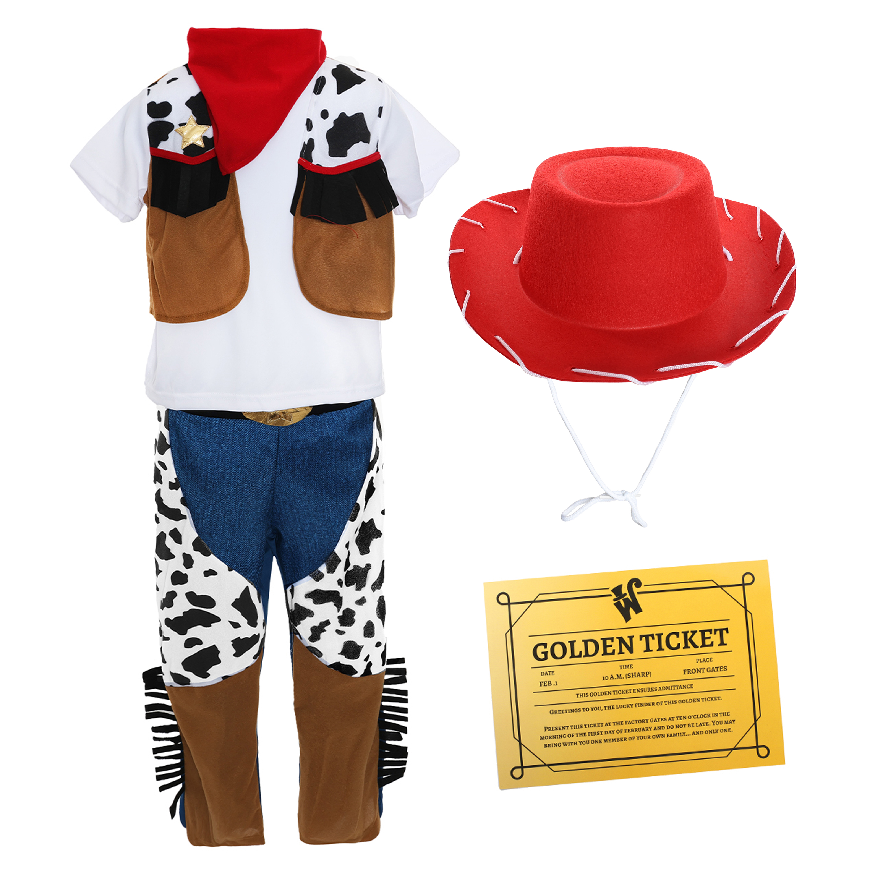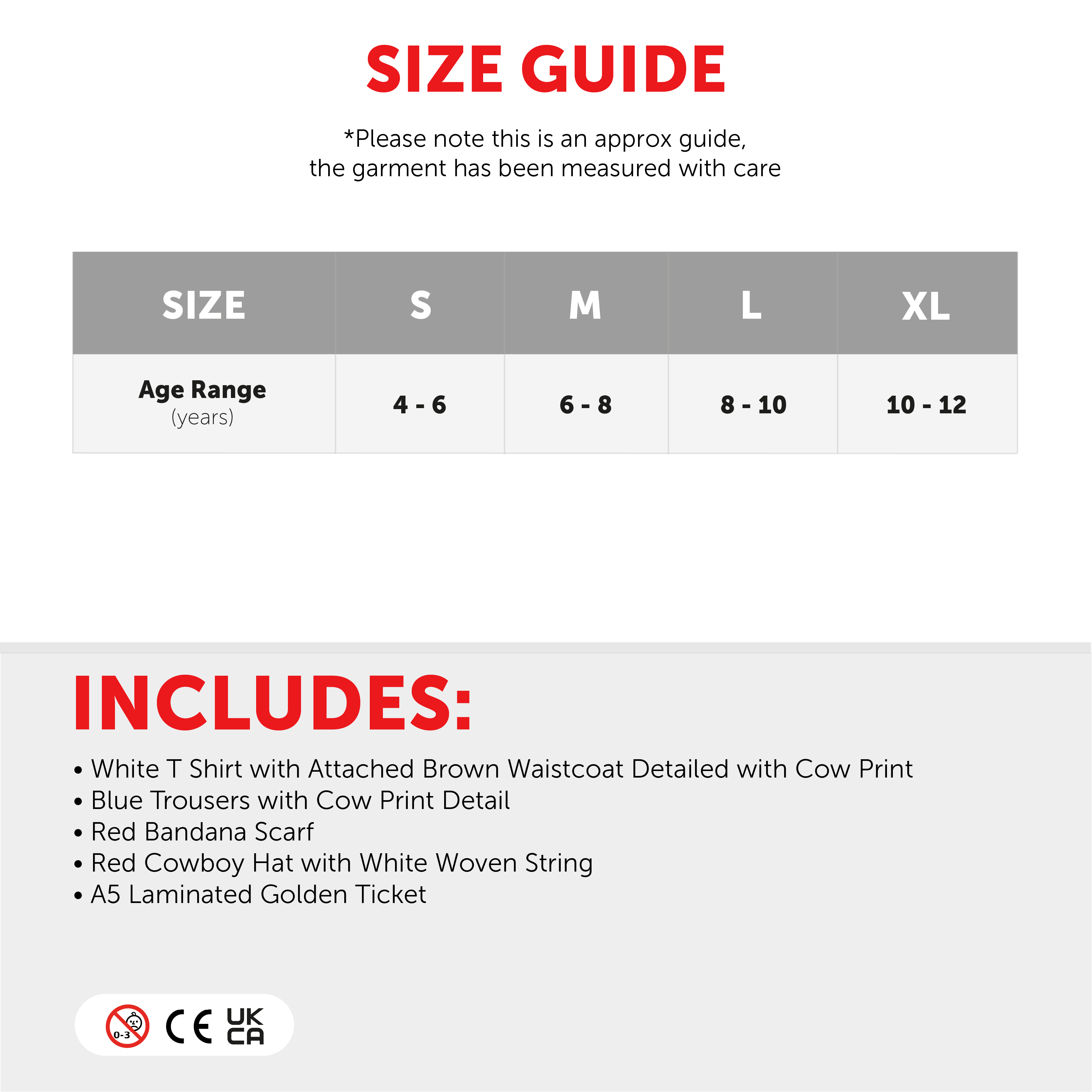 COSTUME INCLUDES: Your Child's Ticket Winner Costume includes a short sleeved White T Shirt with a Brown Waistcoat with Cow Print detail, Blue Trousers with Cow Print detail, a Red Bandana Scarf, Red Felt Cowboy Hat with White String woven around the brim, and a laminated A5 Golden Ticket prop, to finish off your outfit!