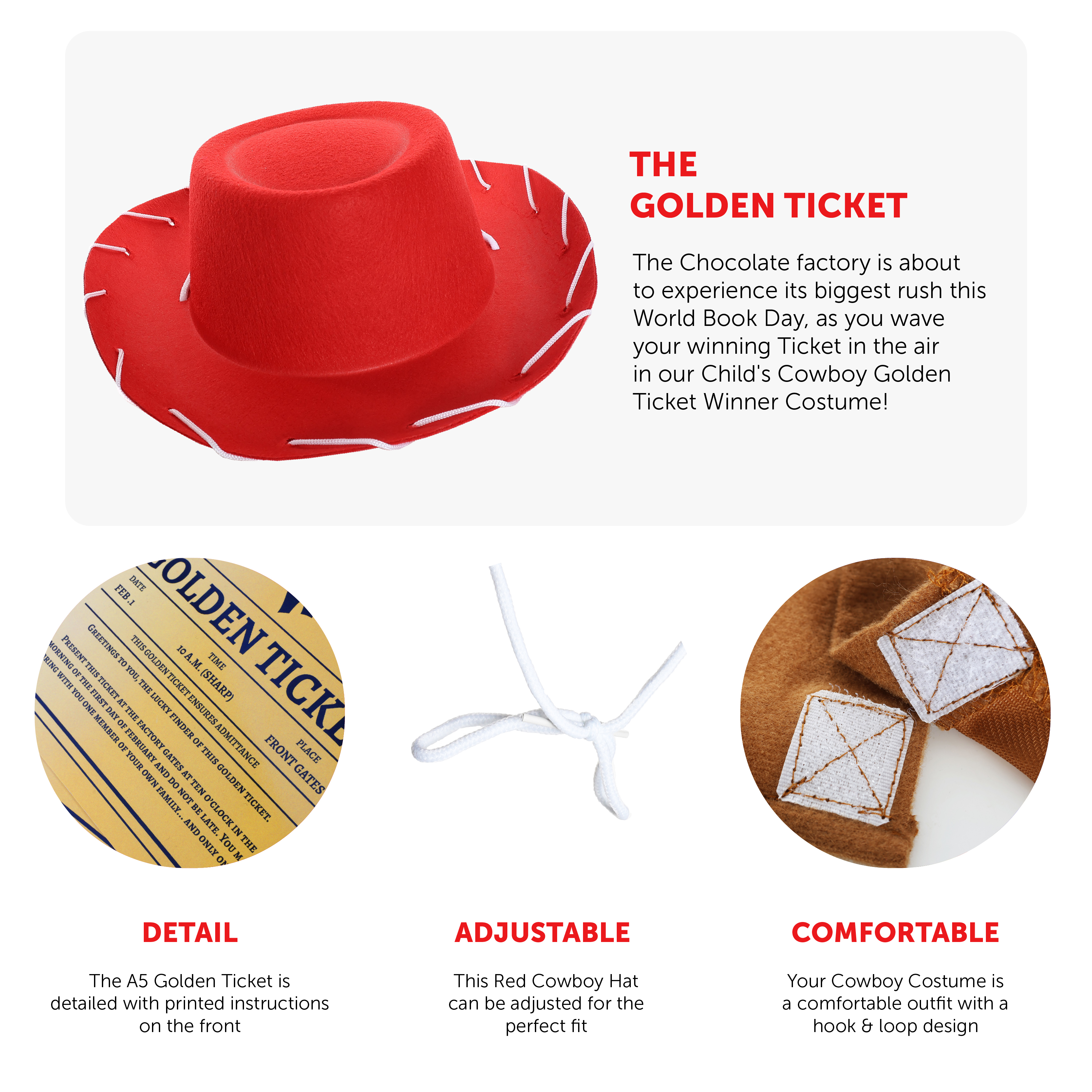 PERFECT SIZED ACCESSORIES: Your Red Cowboy Hat is one size, making it suitable for most Children to wear comfortably! The Golden Ticket is an A5 accessory with measurements of 21cm x 14.5cm (8" x 5.5")