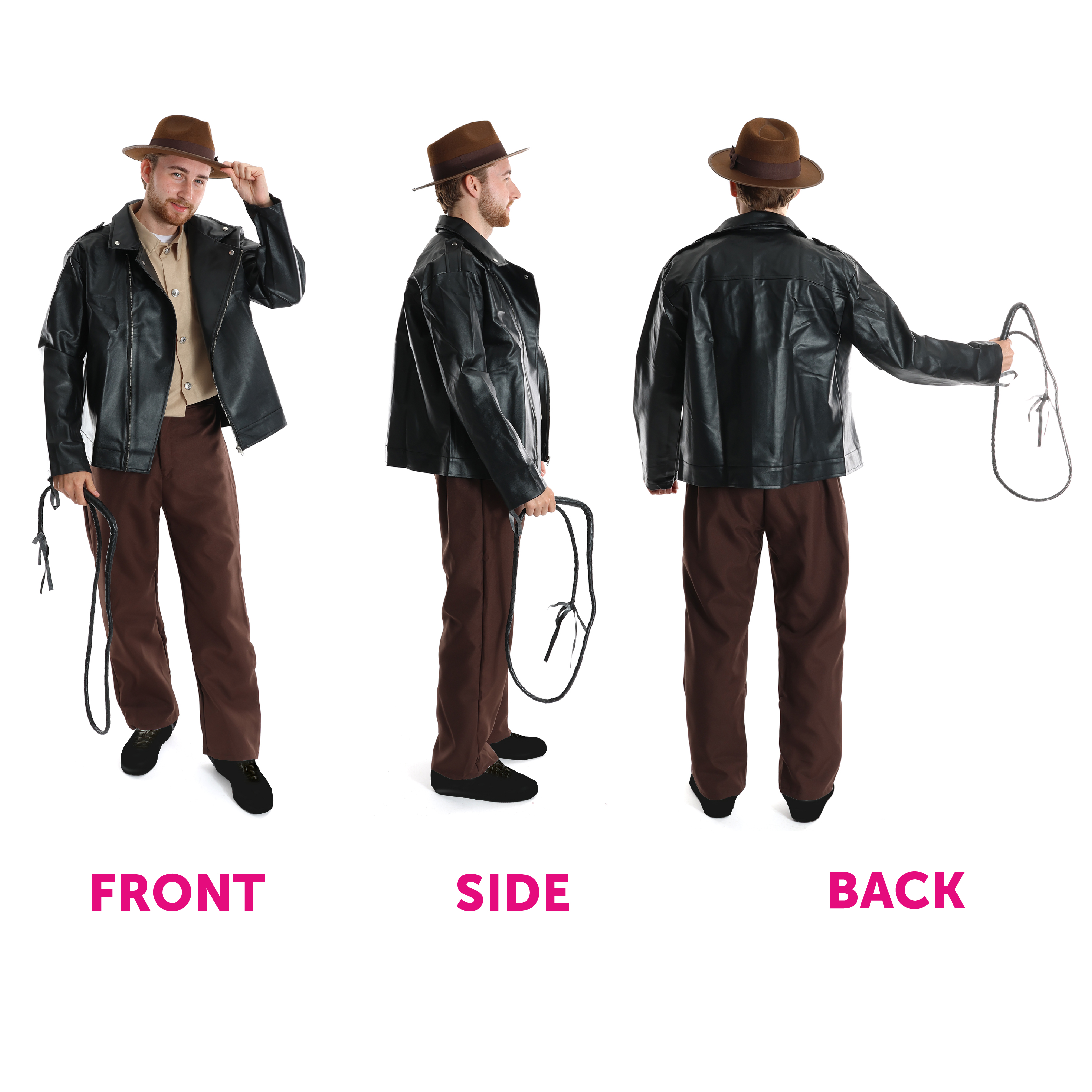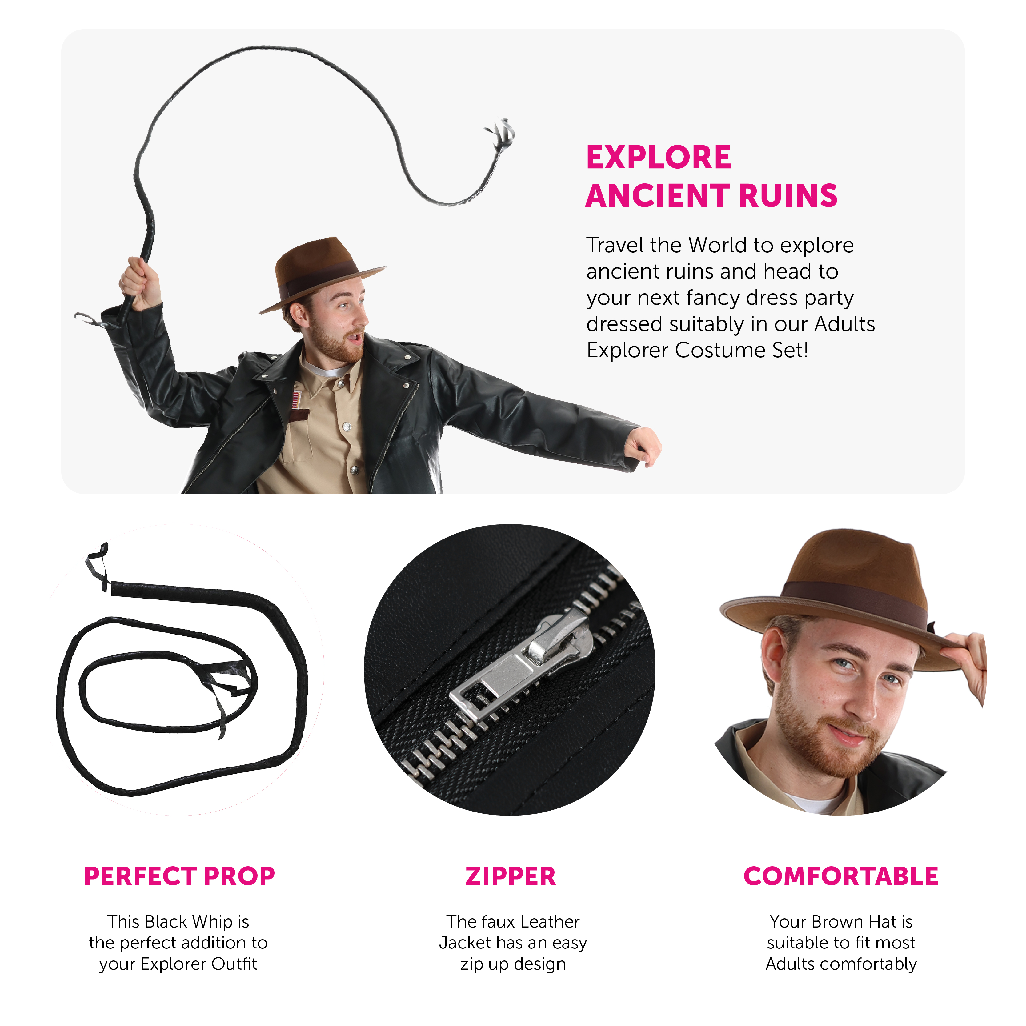 COSTUME SET INCLUDES: This Adults Explorer Costume includes a long-sleeved, faux Black Leather Jacket with zip up fastening, a Brown Explorer Hat and a Black Whip prop, perfect for any fancy dress event!