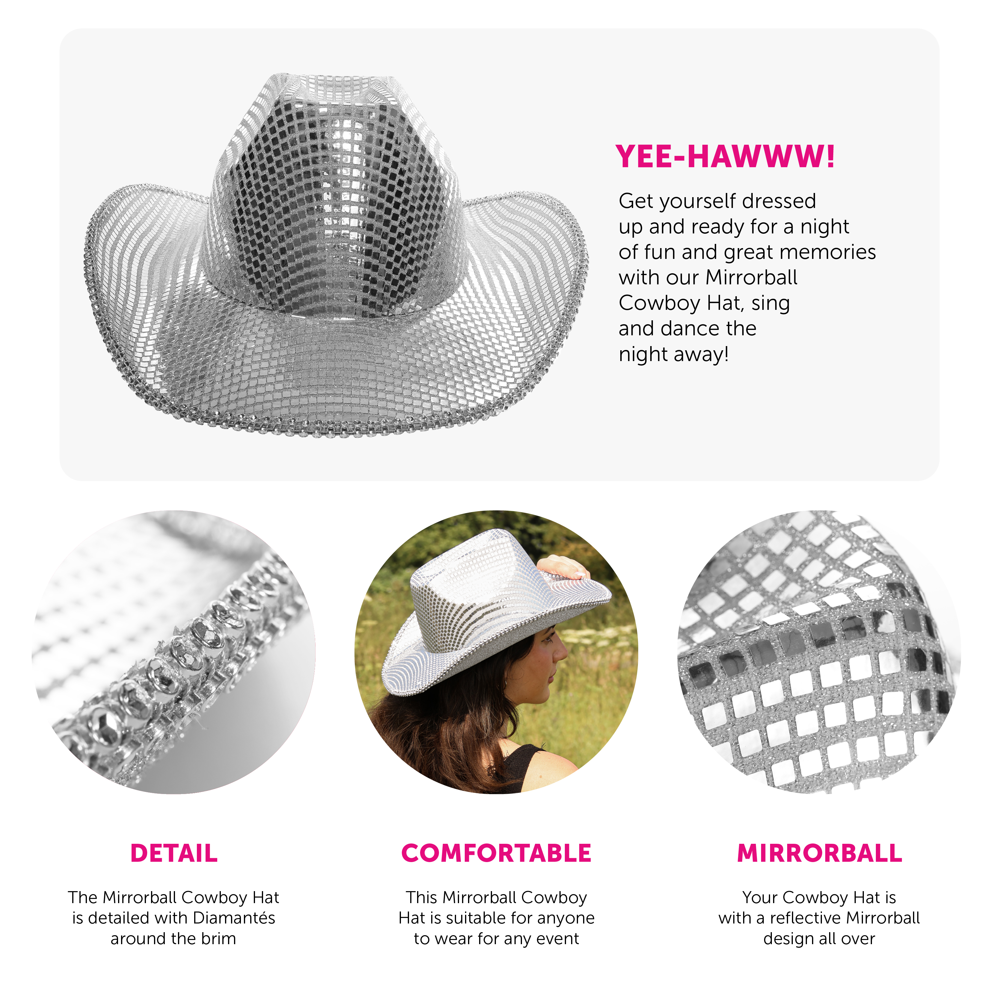 - MIRRORBALL COWBOY HAT: Get yourself dressed up and ready for a night of fun and great memories with our Mirrorball Cowboy Hat, sing and dance the night away!