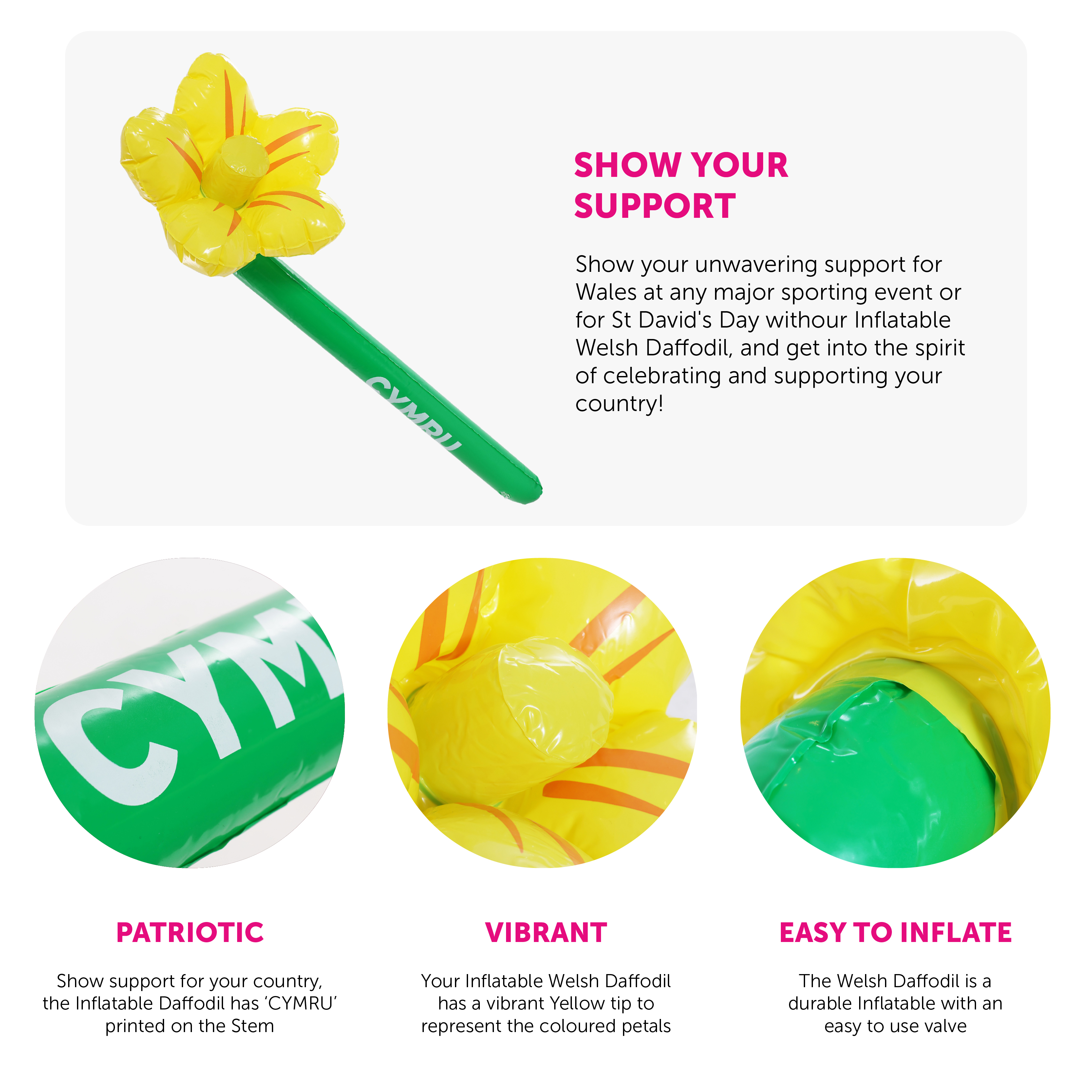 DAFFODIL DETAILS: This Welsh Daffodil has an easy to inflate design, with an easy to use valve! The Inflatable Daffodil has a long Green Stem with 'CYMRU' printed in White on the side, and vibrant Yellow Petals at the end!
