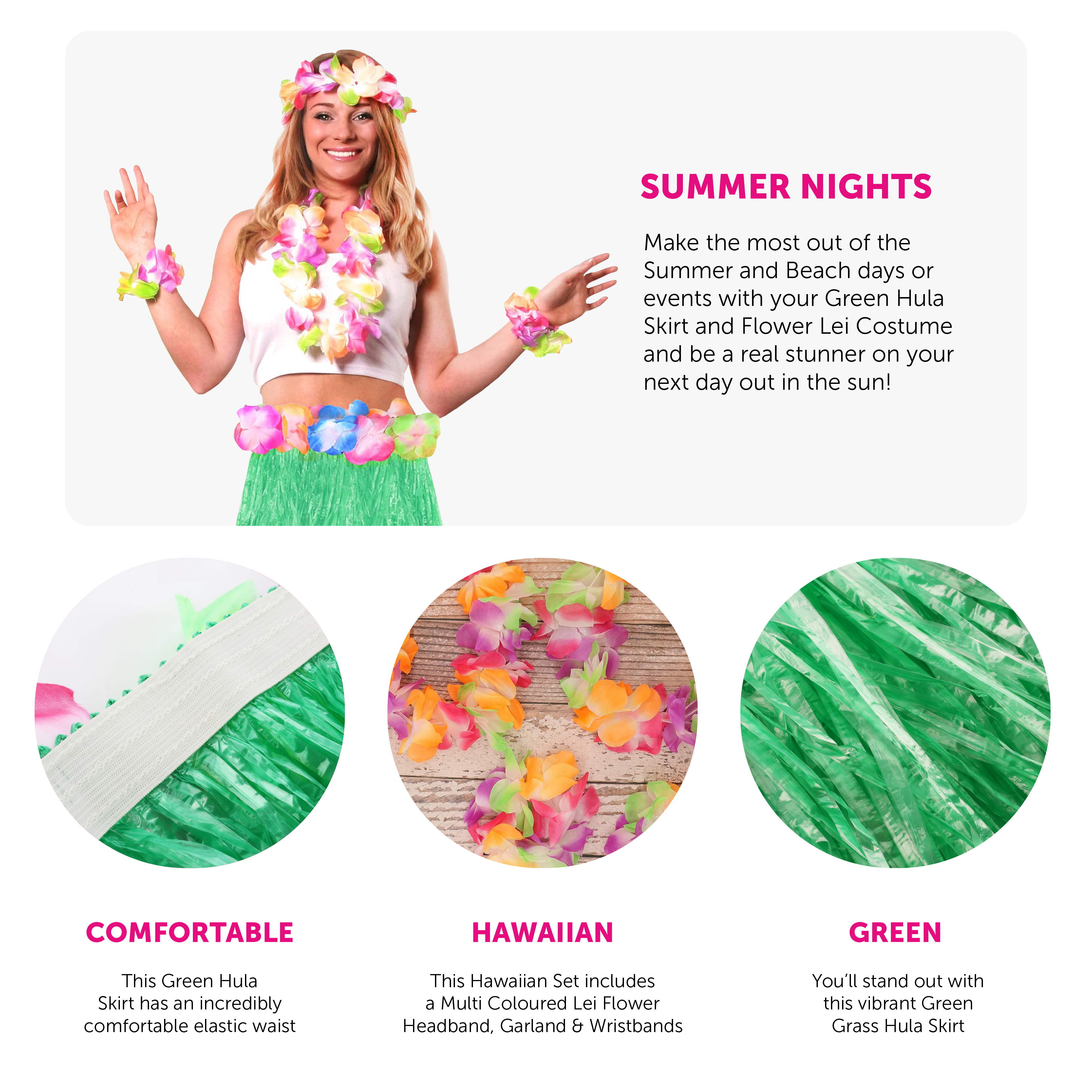 COSTUME DETAILS: Your Costume includes a short grass-like Green Hula Skirt with an elasticated waistband, with multi coloured decorative Hawaiian Lei Flowers around the waist, and a 4 Piece Multi coloured Hawaiian Lei Flower Necklace, Headband and Wristband Set, all tropical and ready for the beach!