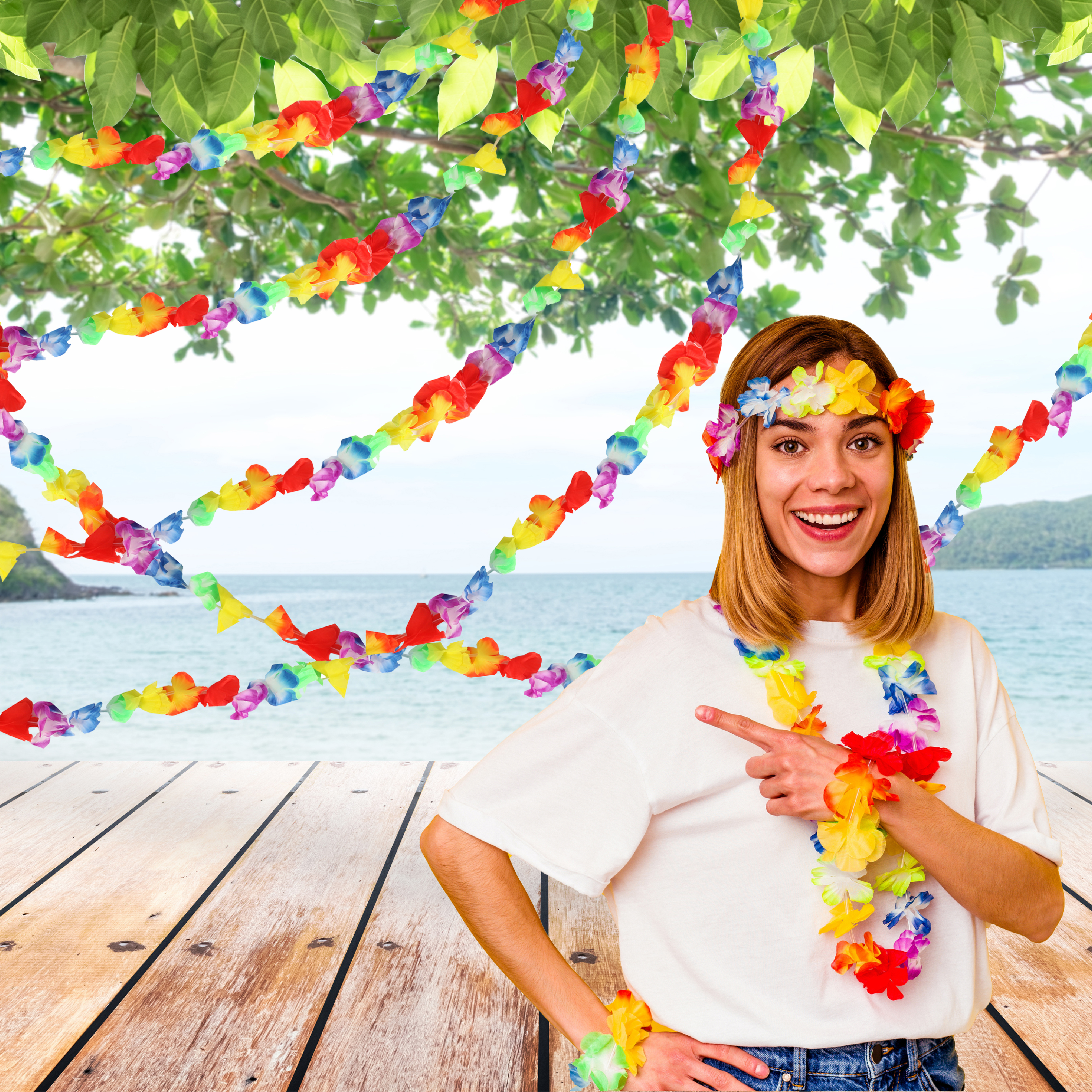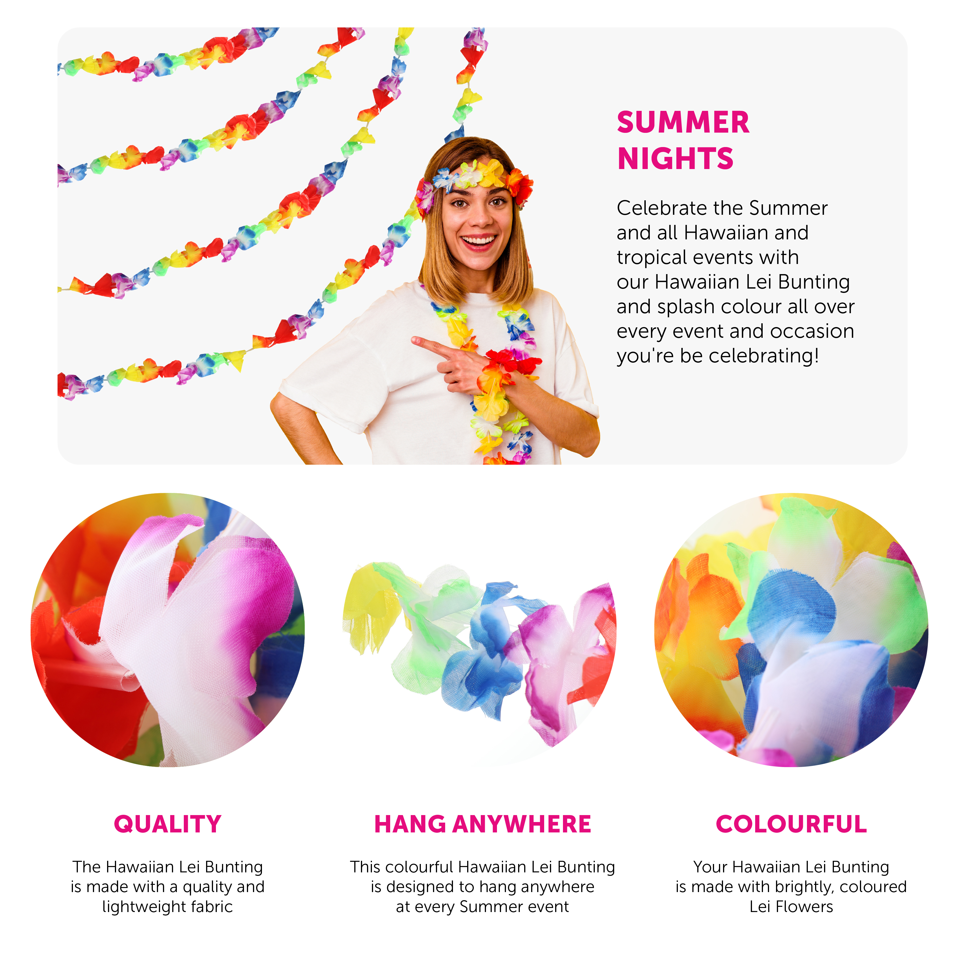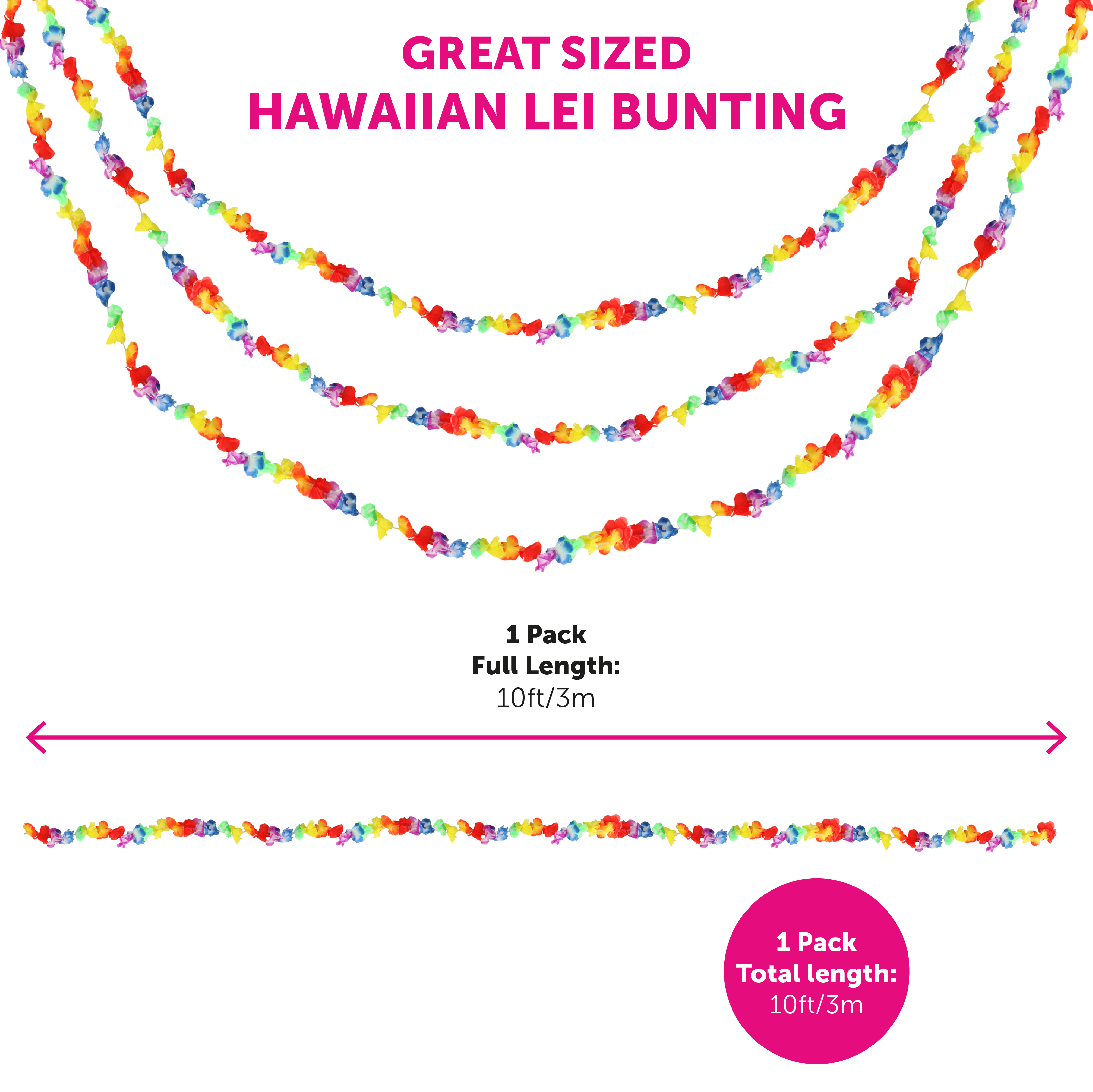 HAWAIIAN LEI BUNTING DETAILS: Your Hawaiian Lei Buntings are each 10ft/3m long and feature a full string of multicoloured Hawaiian Leis, soft to the touch and even more beautiful to look at to decorate anywhere with!