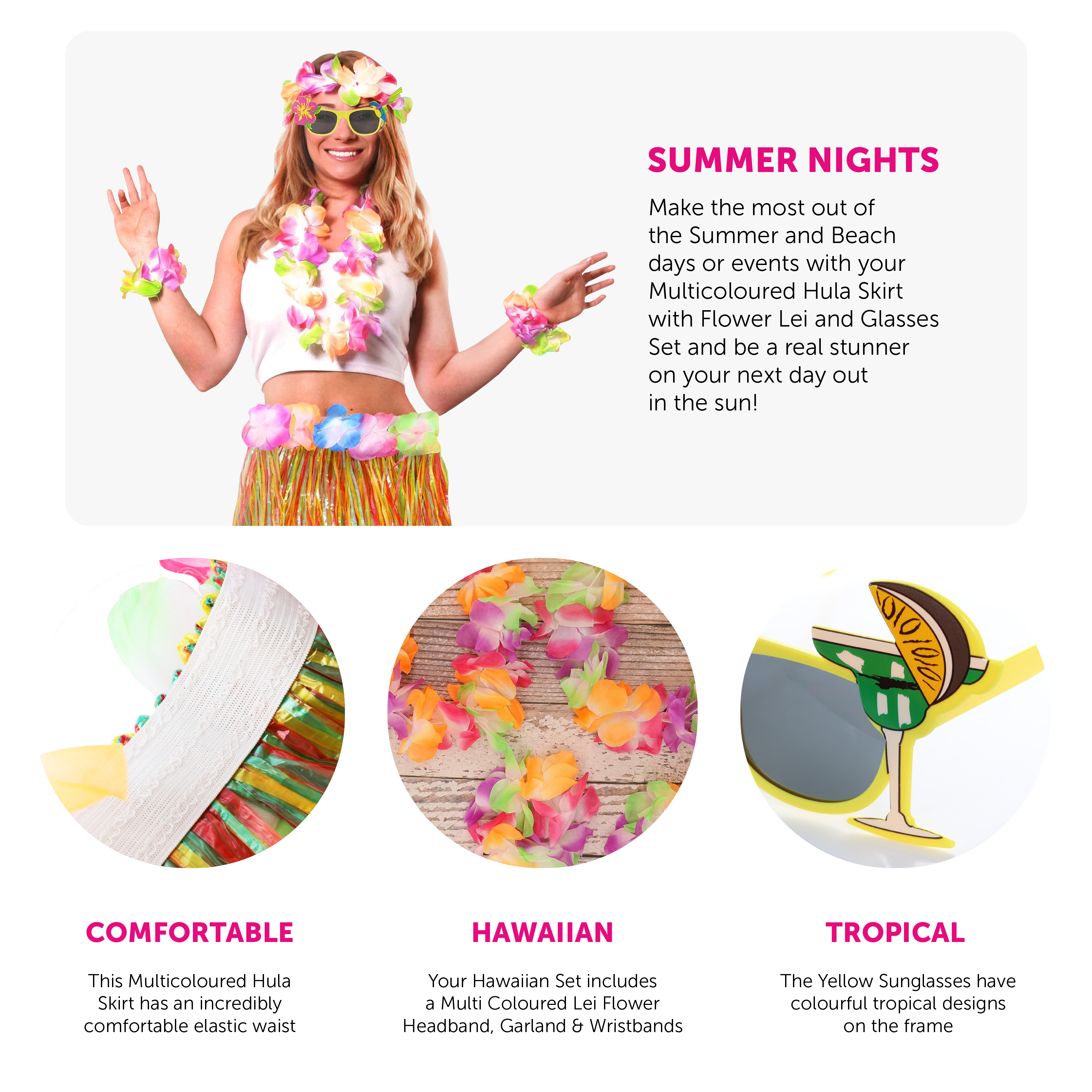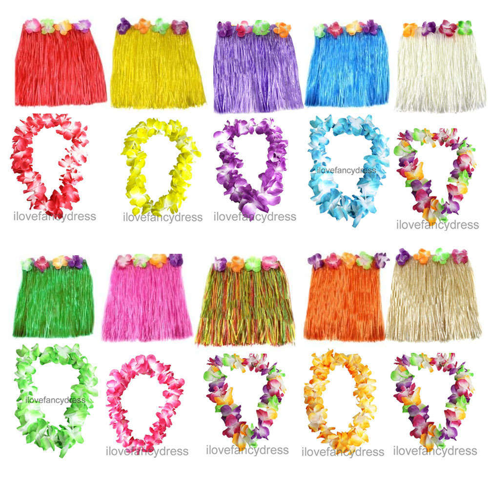 SET DETAILS: Your set includes a short grass-like Multicoloured Hula Skirt with an elasticated waistband, with multi coloured decorative Hawaiian Lei Flowers around the waist, a 4 Piece Multi coloured Hawaiian Lei Flower Necklace, Headband and Wristband Set, and Yellow Tropical Sunglasses with Hawaiian designs, all ready for the beach!