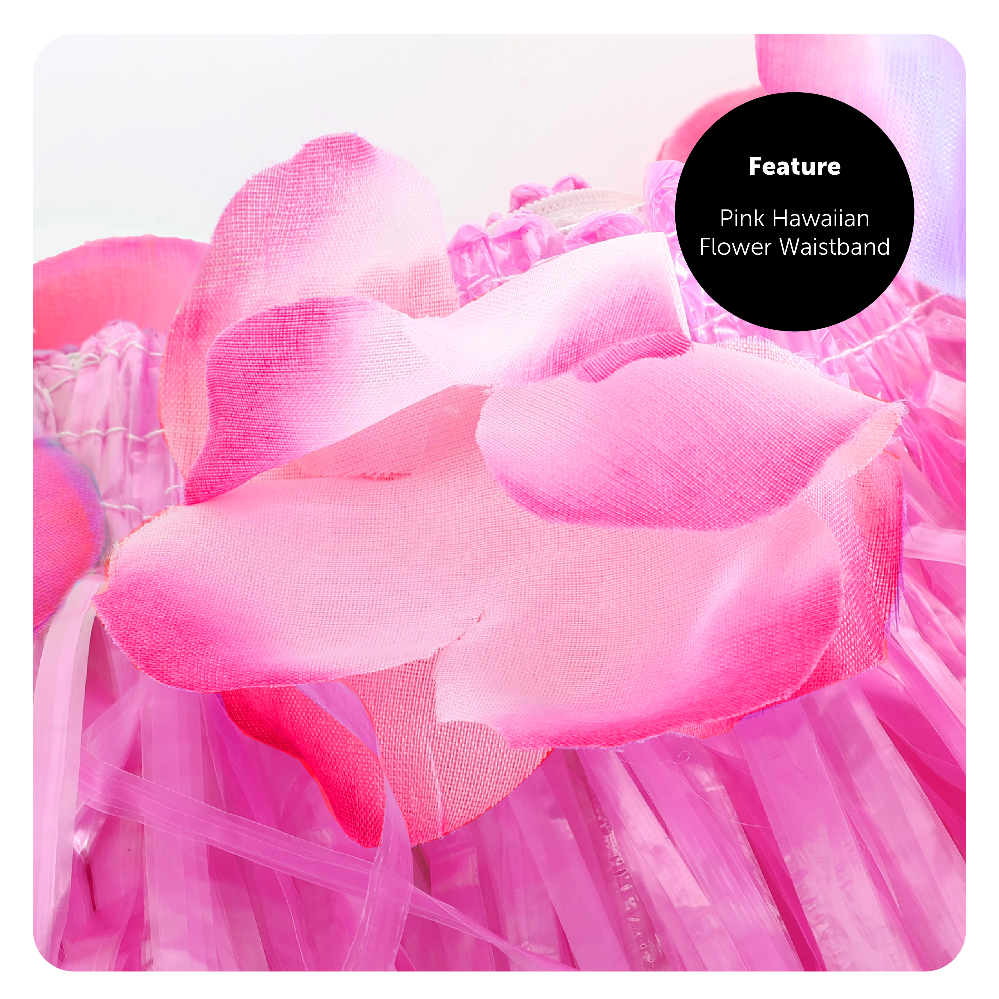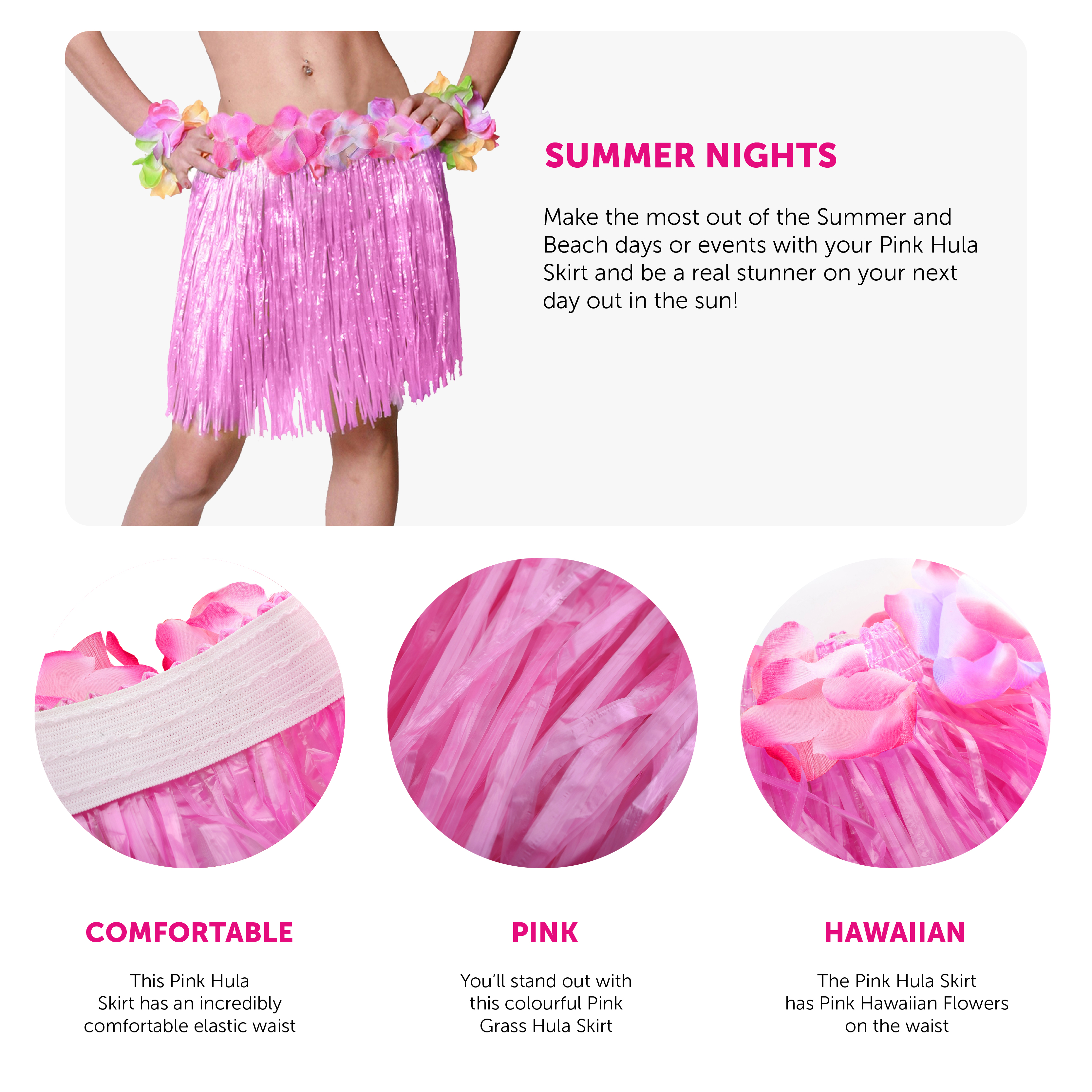 HULA SKIRT DETAILS: Your Hula Skirt is a Pink, grass-like Skirt with an elasticated waistband and matching Pink decorative Hawaiian Lei Flowers, all tropical and ready for the beach!