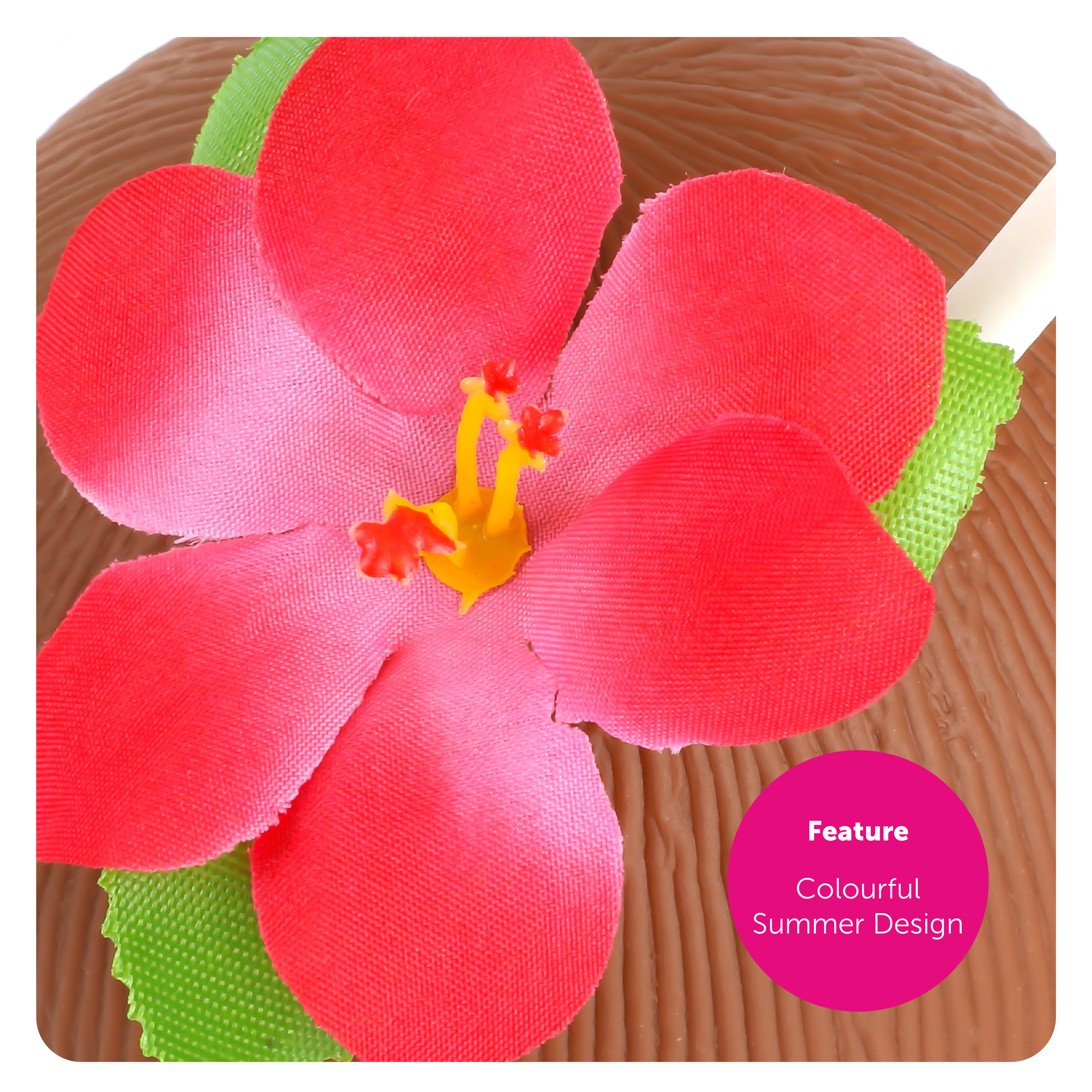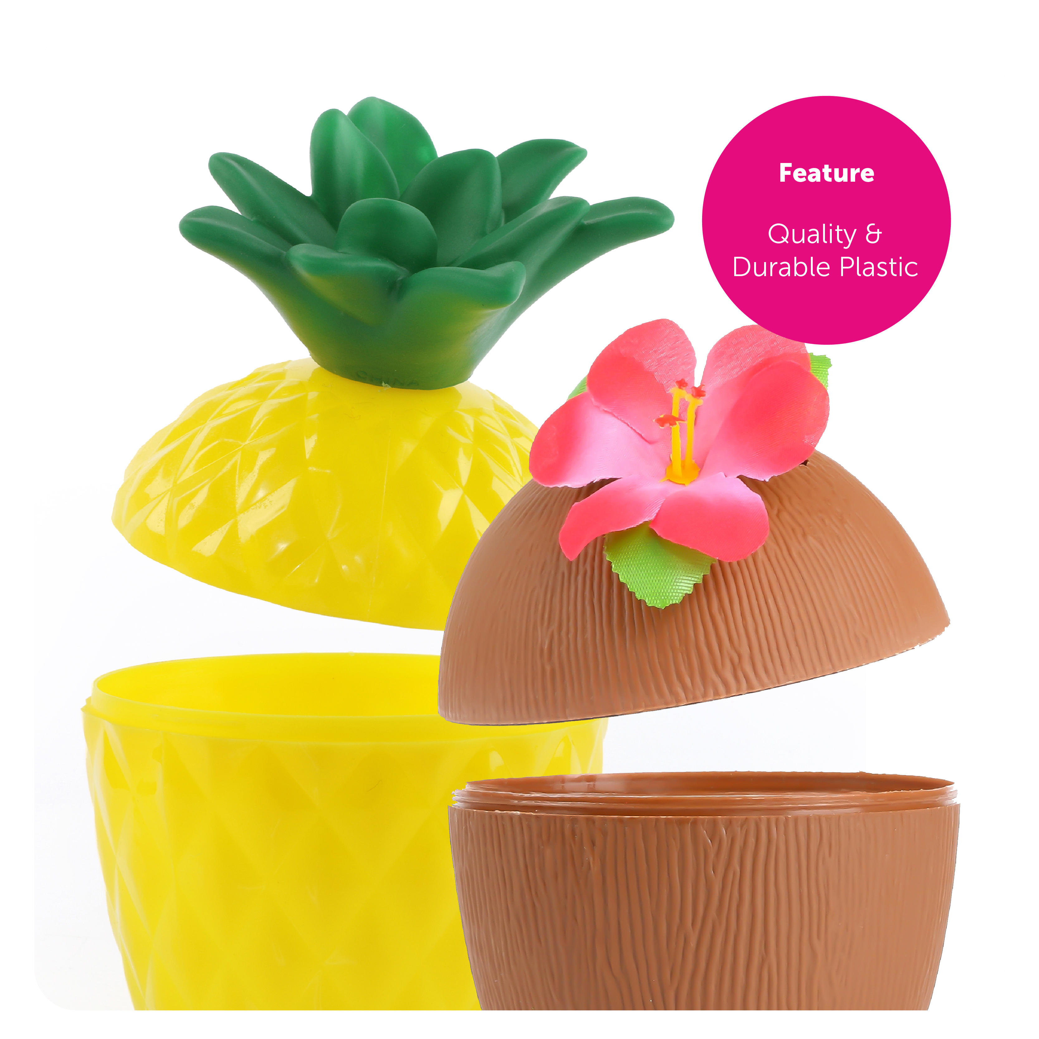 CUP SET DETAILS: The reusable Plastic Cup set includes Brown Cups, shaped like Coconuts, detailed with a Pink Hibiscus Hawaiian Flowers on the lid, and Yellow Cups, shaped like Pineapples, detailed with a Green leafy stem on the lid, both styles have paper straws included! The Cups are perfect for Children and Adults to use, holding a large amount of liquid for any hot, Summer themed party!
