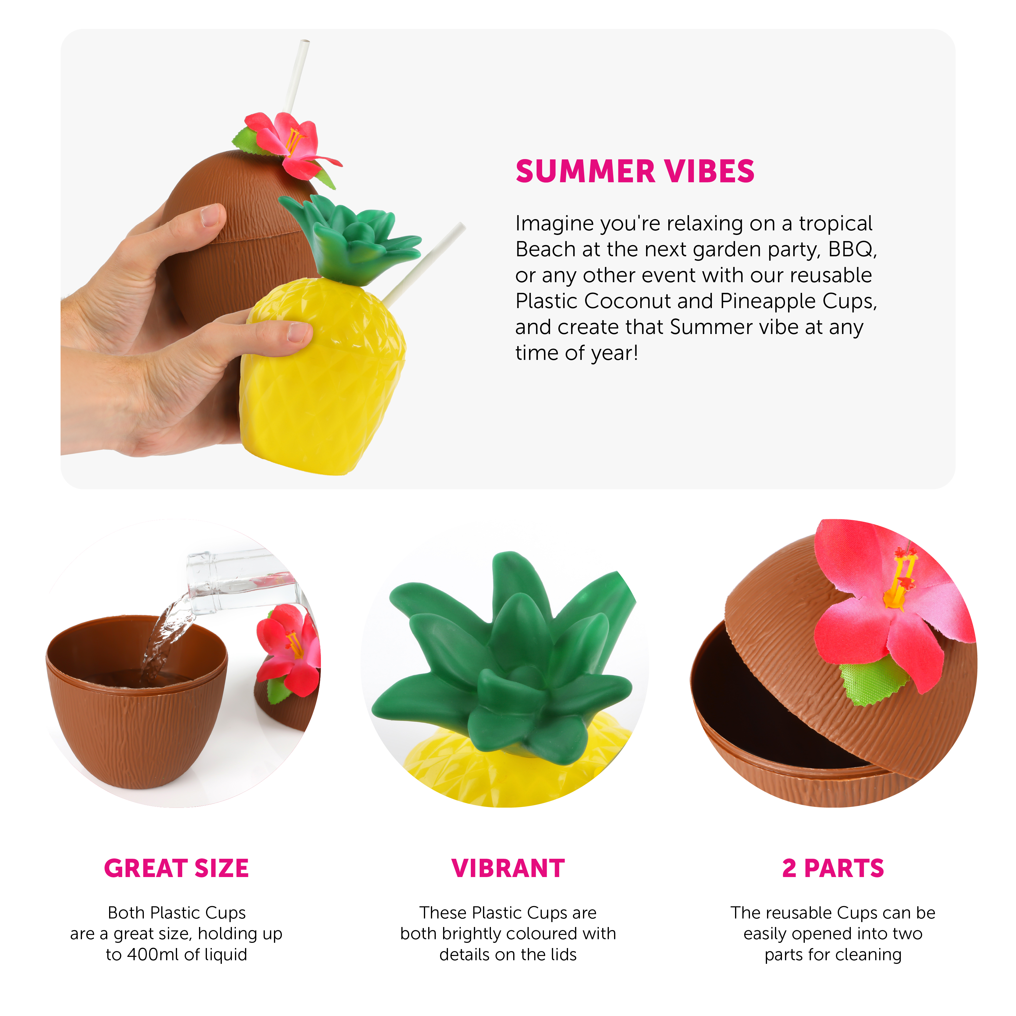 REUSABLE PLASTIC COCONUT & PINEAPPLE CUPS WITH PAPER STRAWS: Imagine you're relaxing on a tropical Beach at the next garden party, BBQ, or any other event with our reusable Plastic Coconut and Pineapple Cups, and create that Summer vibe at any time of year!
