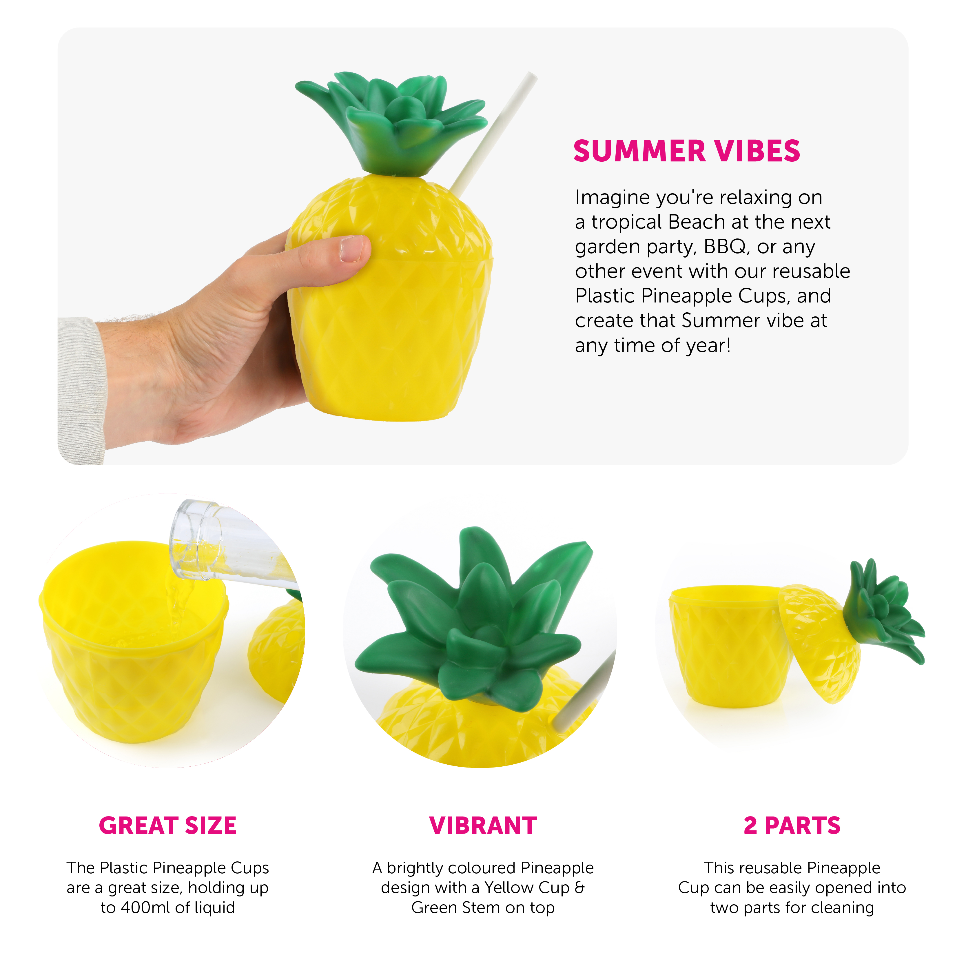 REUSABLE PLASTIC PINEAPPLE CUP & PAPER STRAW: Imagine you're relaxing on a tropical Beach at the next garden party, BBQ, or any other event with our reusable Plastic Pineapple Cups, and create that Summer vibe at any time of year!
