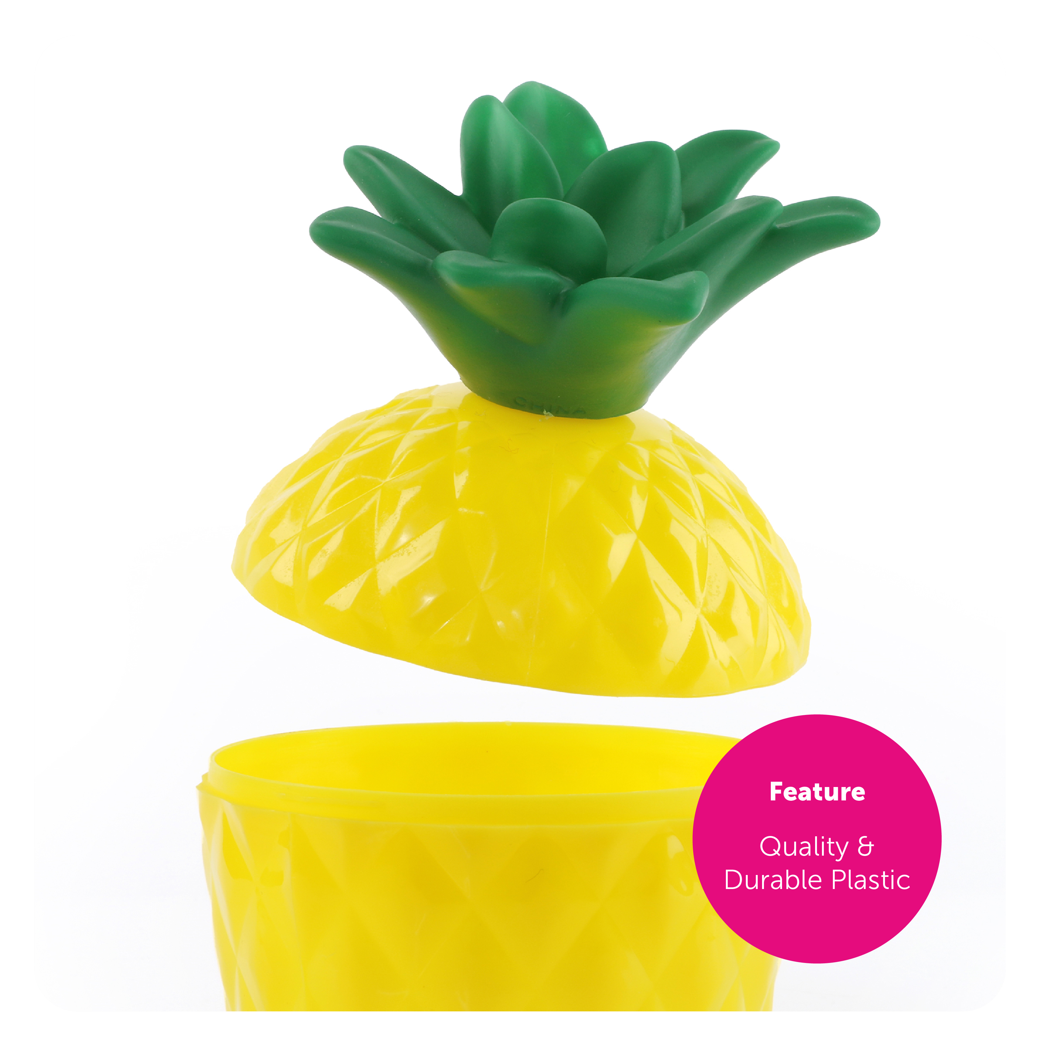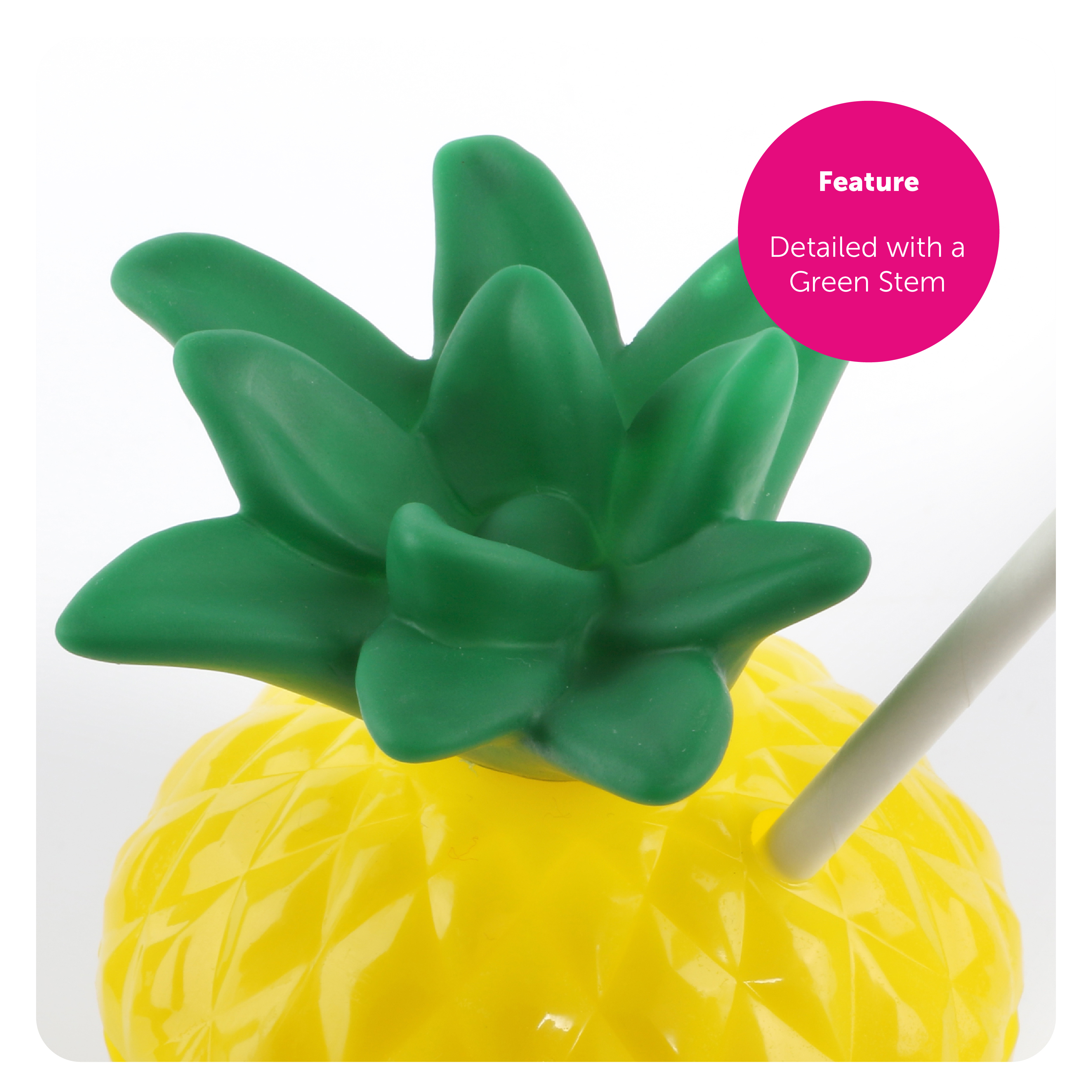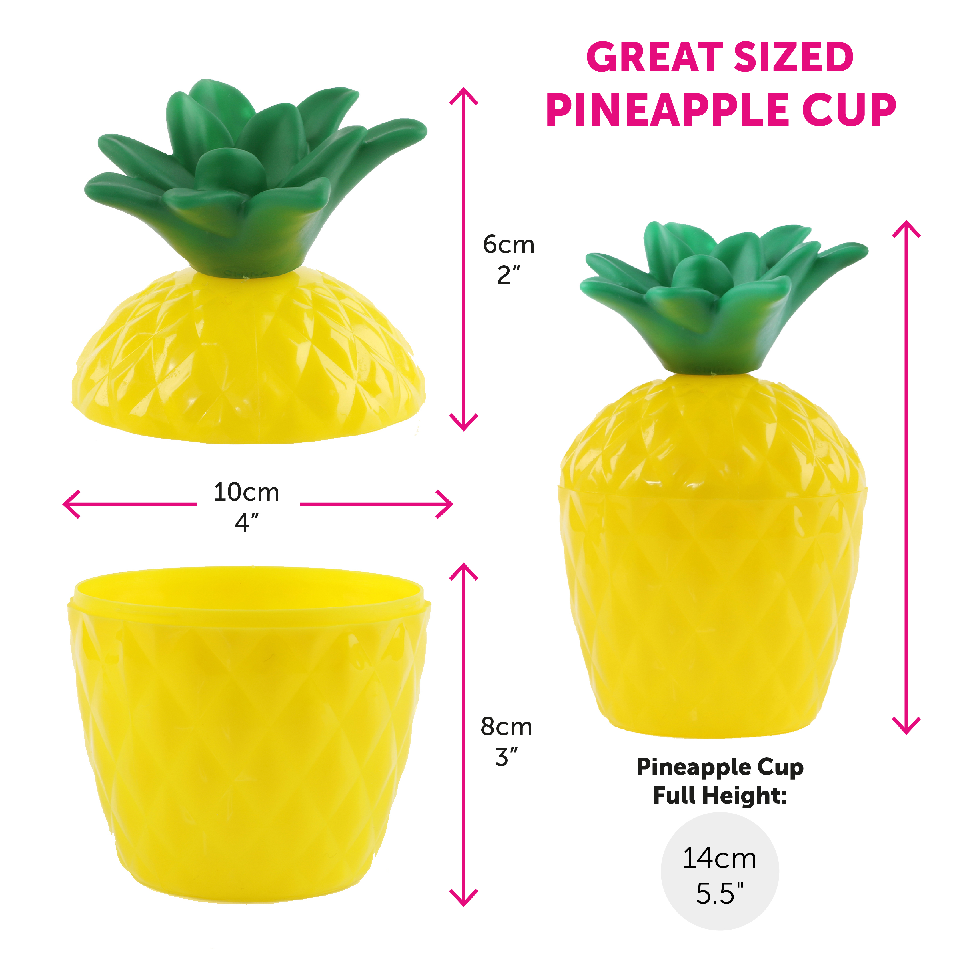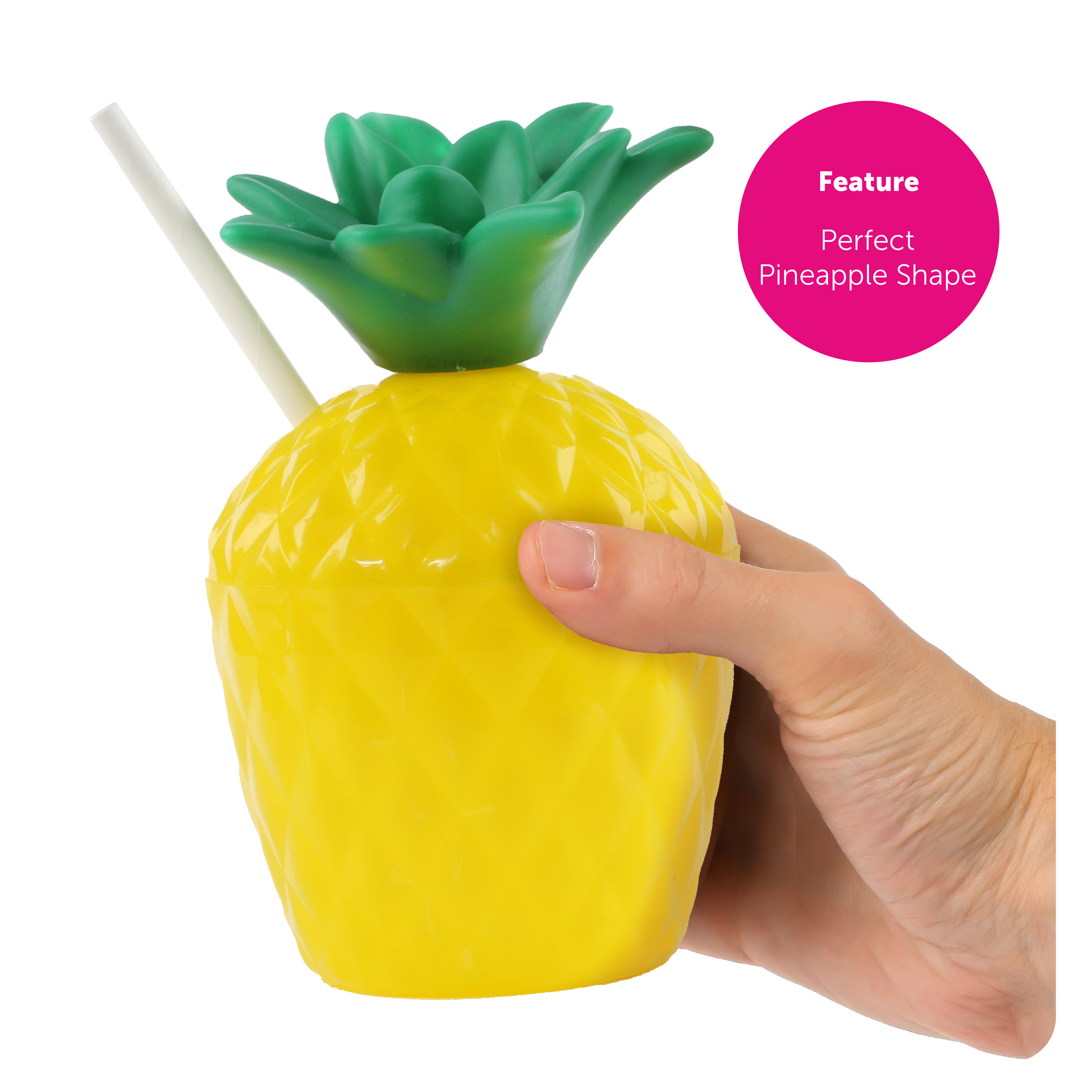 CUP DETAILS: The Pineapple Cups are reusable plastic Yellow Cups, shaped like Pineapples, detailed with a Green leafy stem on the lid and paper straws included! The Cups are perfect for Children and Adults to use, holding a large amount of liquid for any hot, Summer themed party!