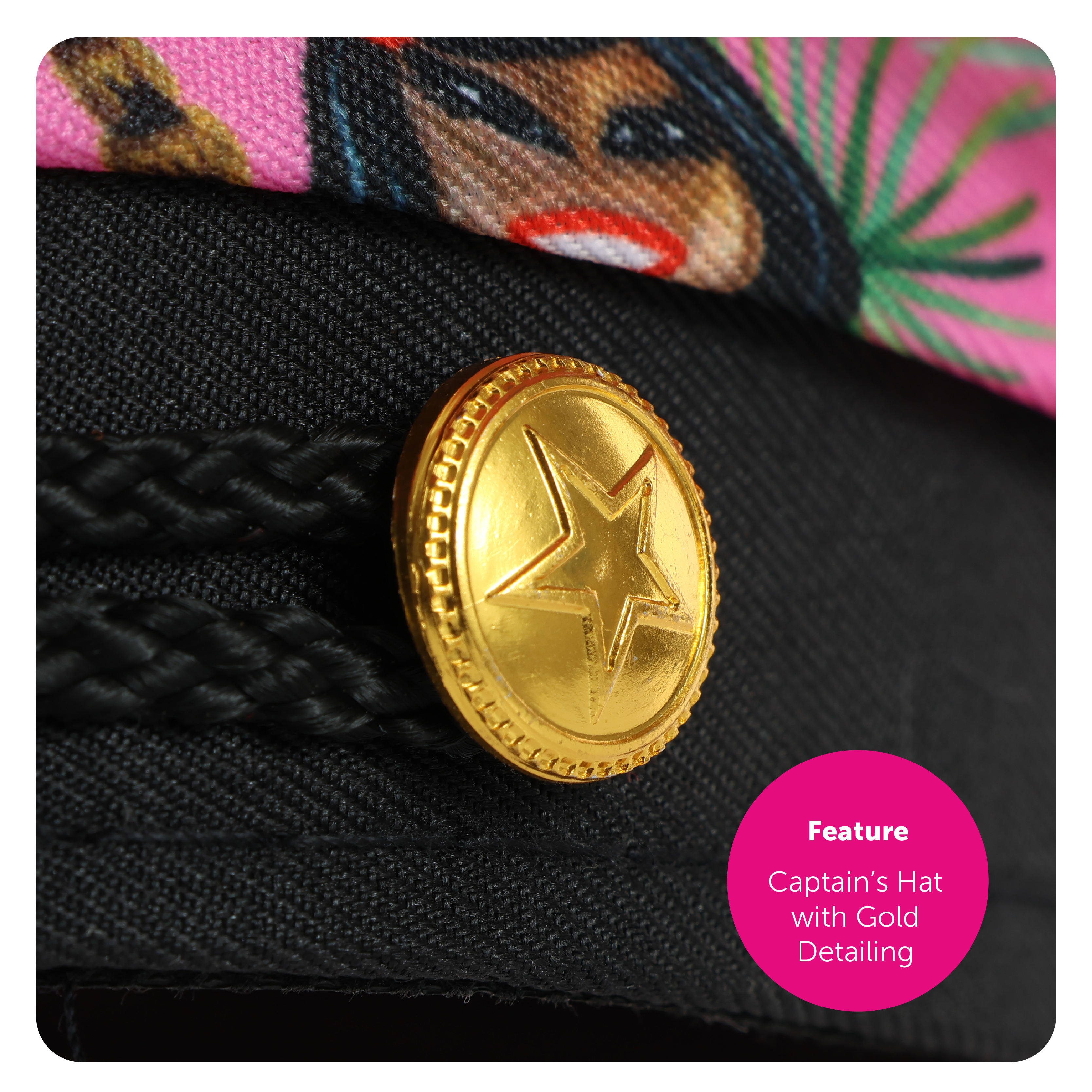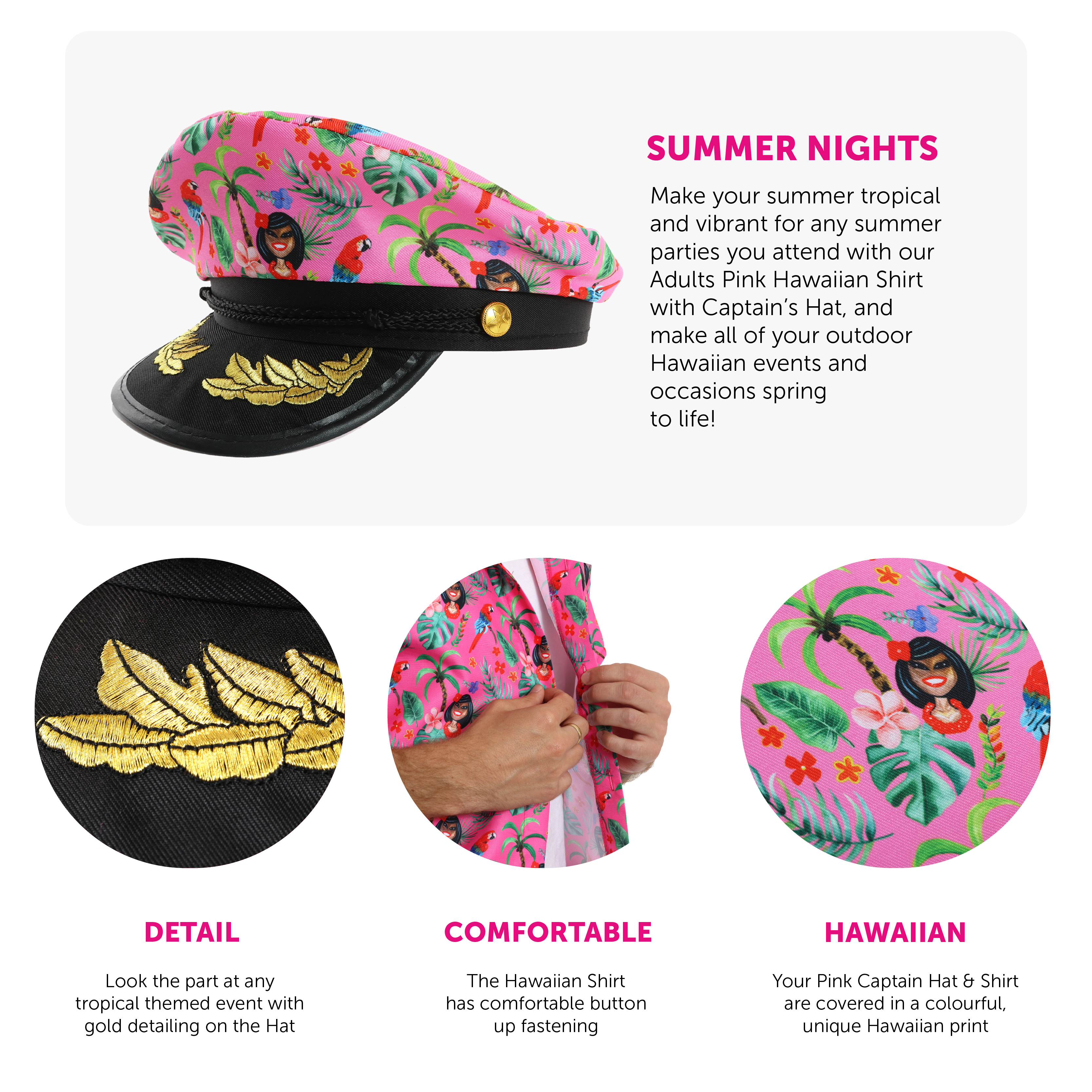 HAWAIIAN SET INCLUDES: Your Hawaiian Set includes a Short Sleeved Pink Shirt detailed with a Hawaiian pattern, and a matching Pink Captain's Hat with Gold detailing, the perfect look for any Summer event!