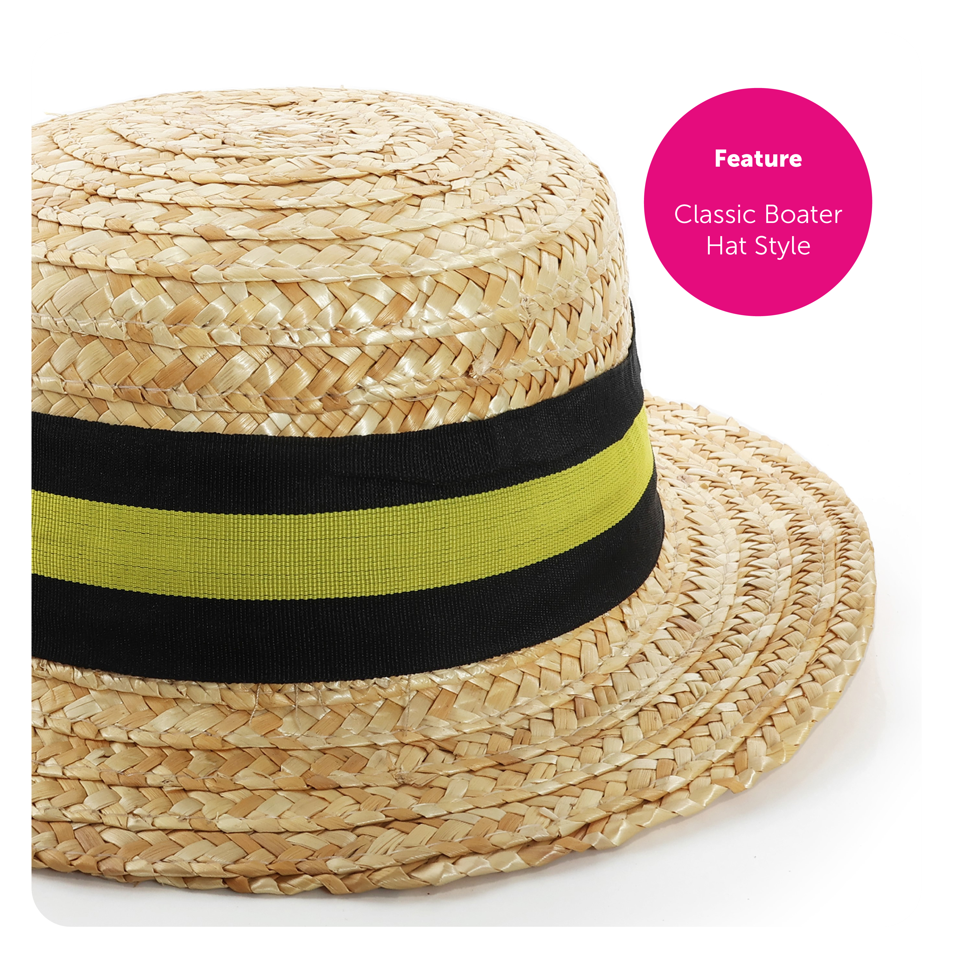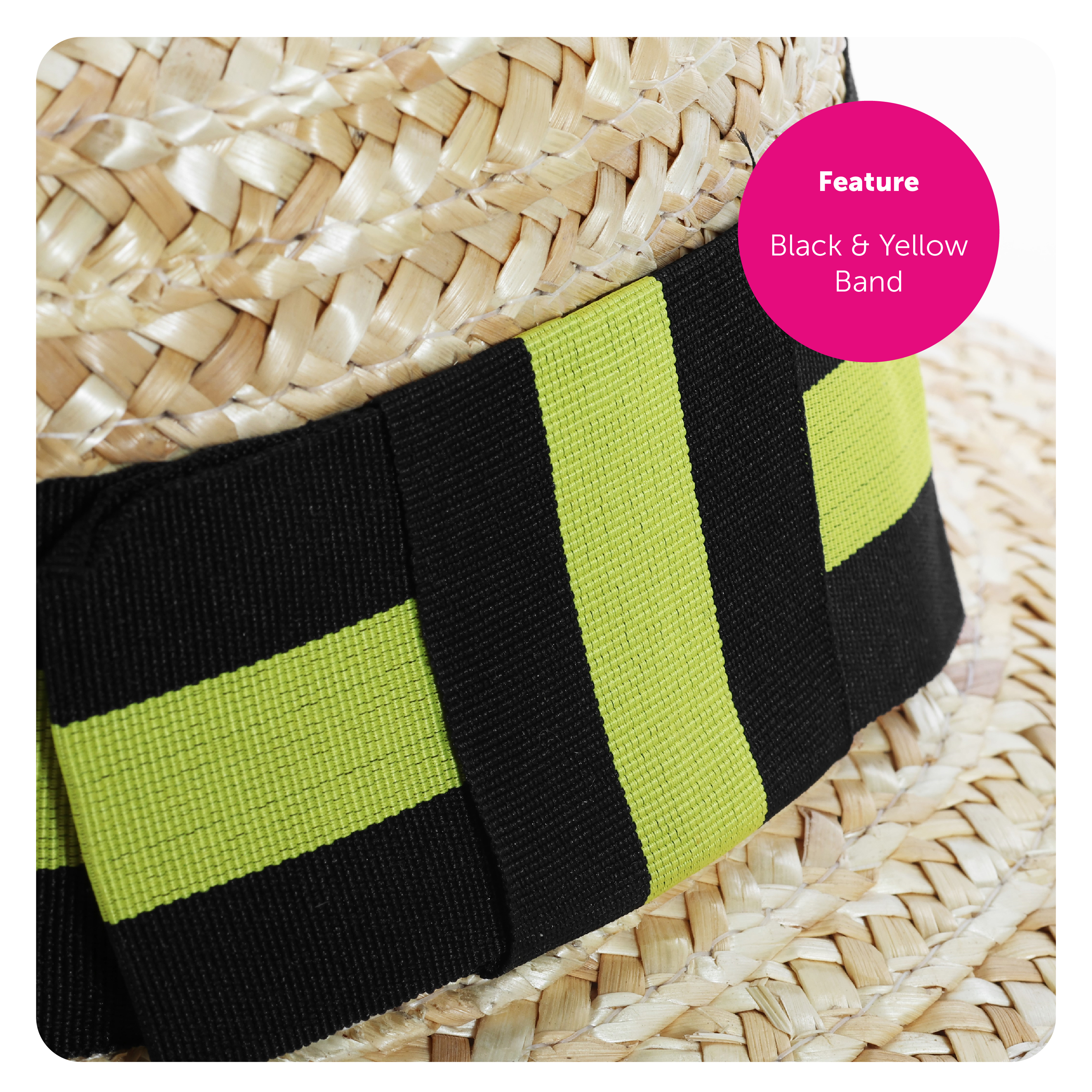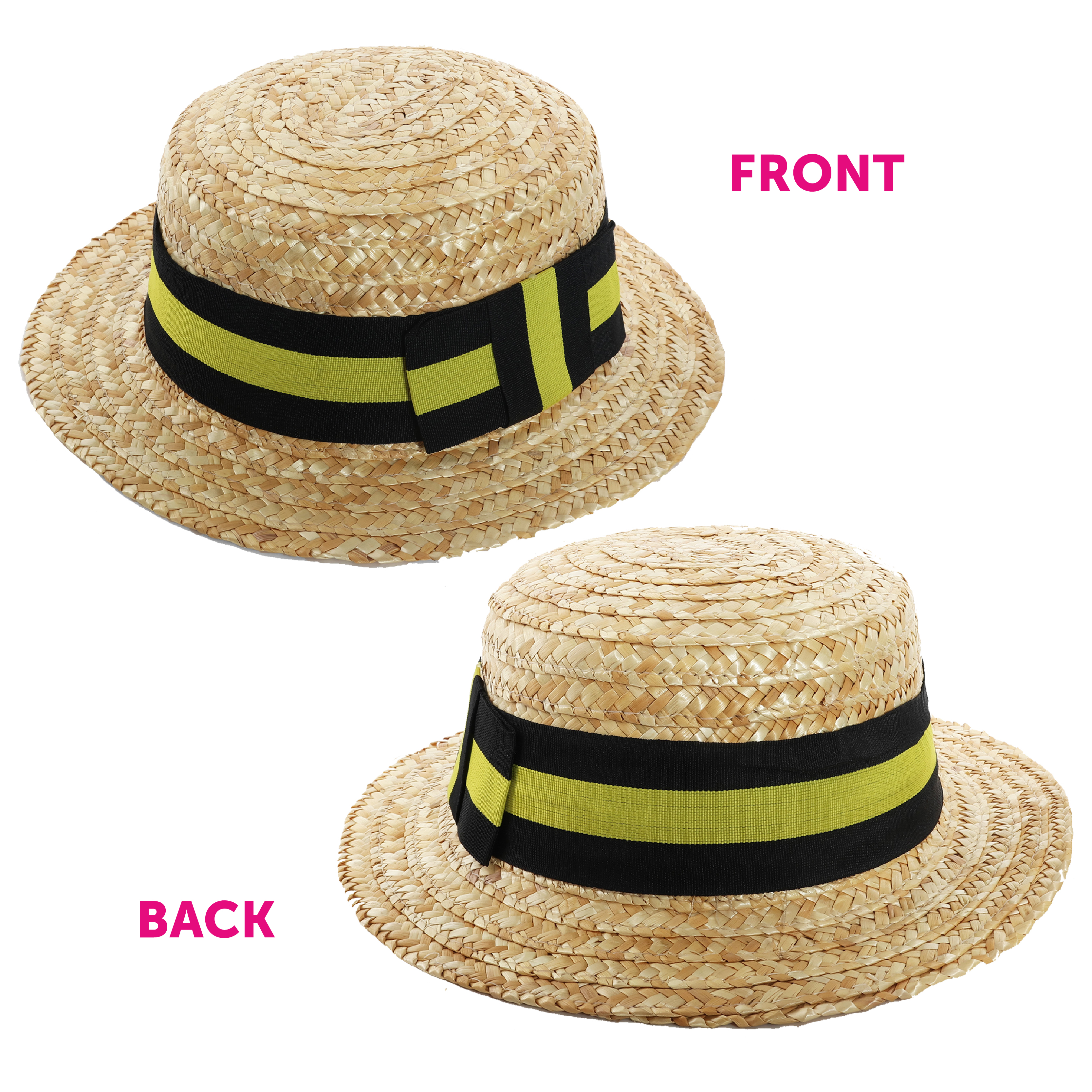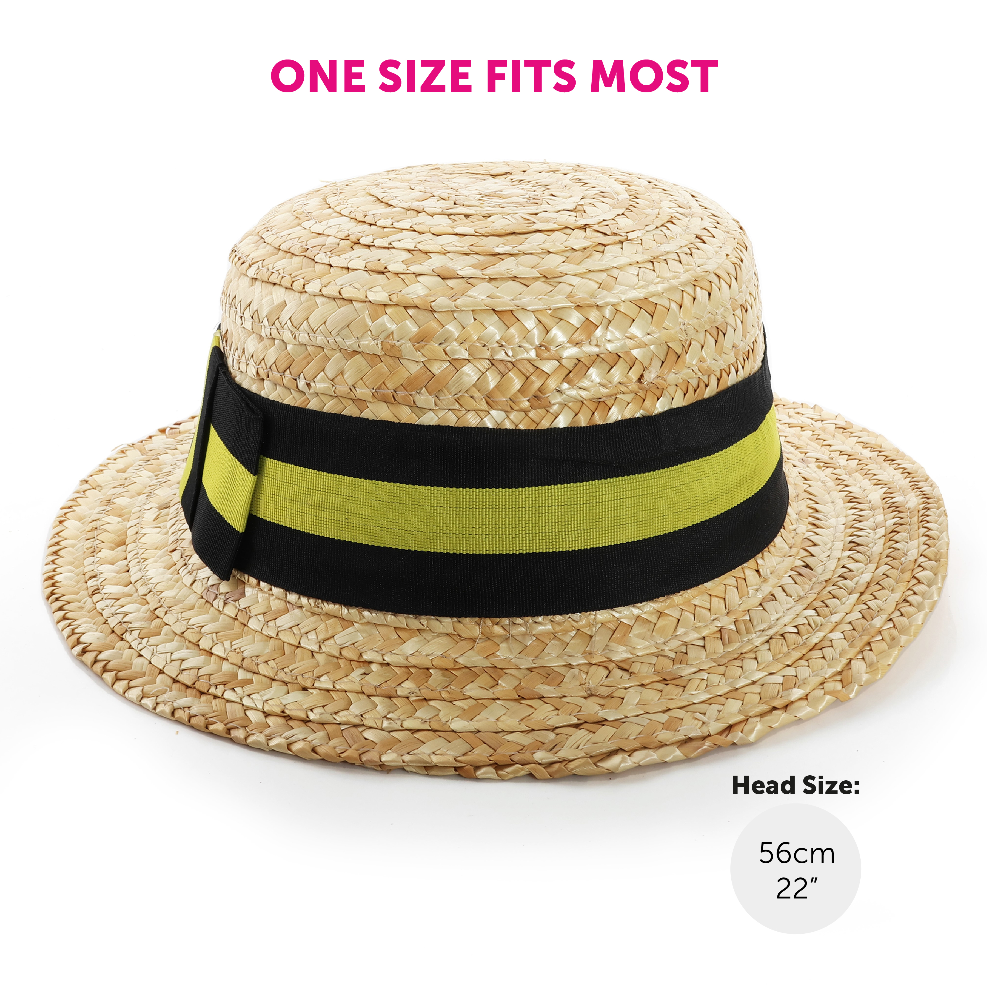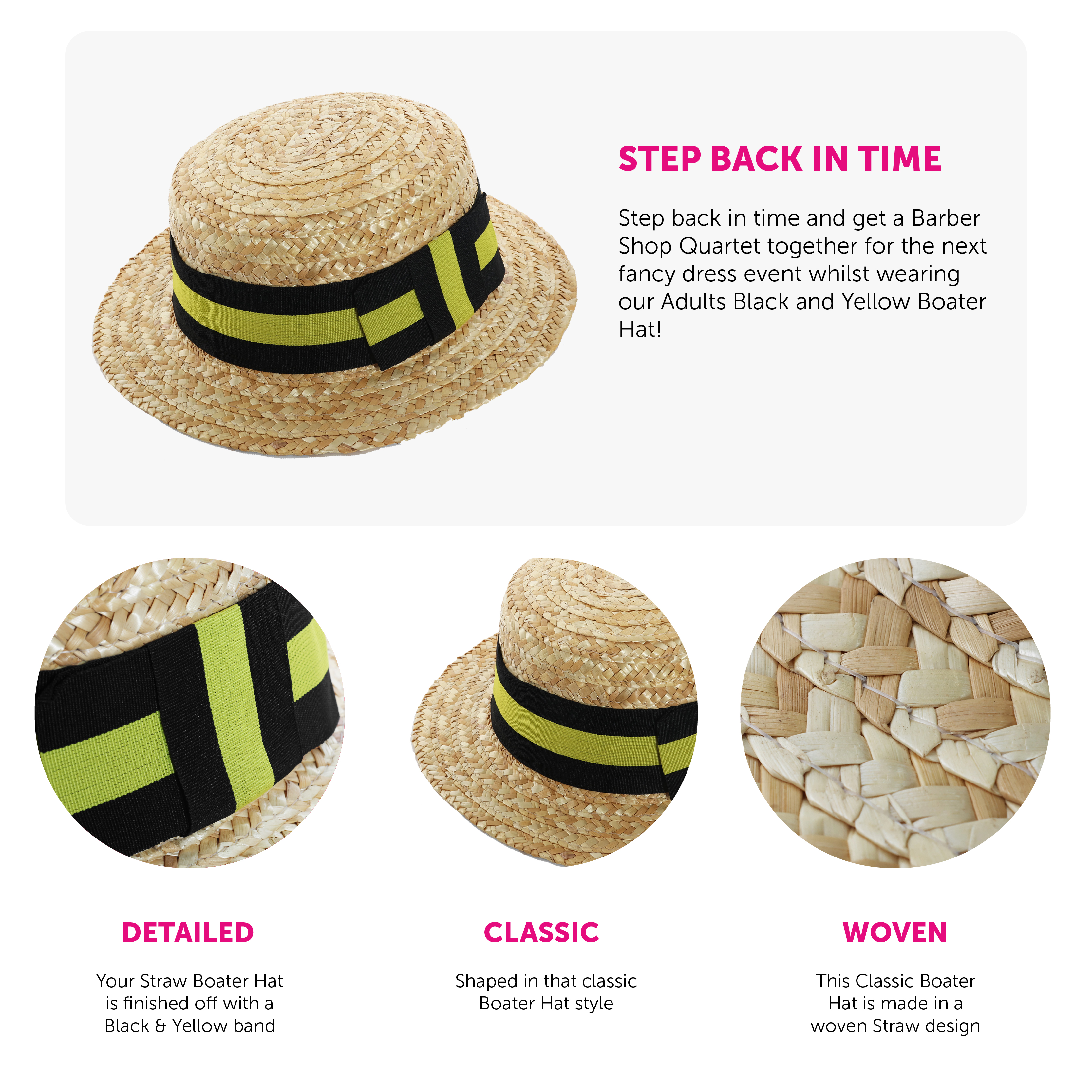 BOATER HAT DETAILS: This Adults Boater Hat is a lightweight, woven Straw styled Hat with a Black and Yellow Striped Band wrapped around - a great finishing touch to any outfit!
