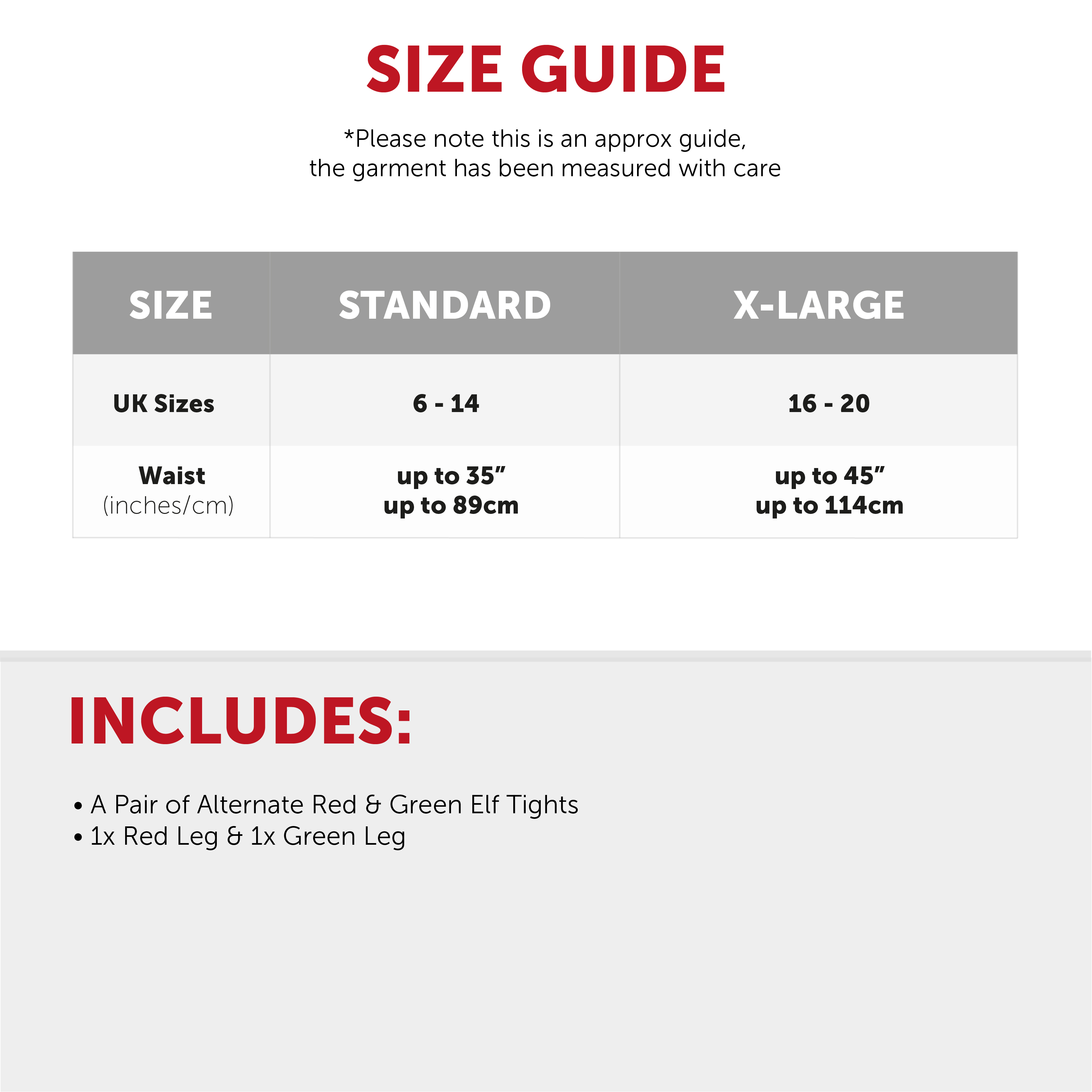 AVAILABLE IN MULTIPLE SIZES: Your Adults Elf Tights are available in multiple sizes from Standard (UK 6-14), and X-Large (UK 16-20), with 2 sizes to choose from and allowing comfortable room for any Adult to wear!