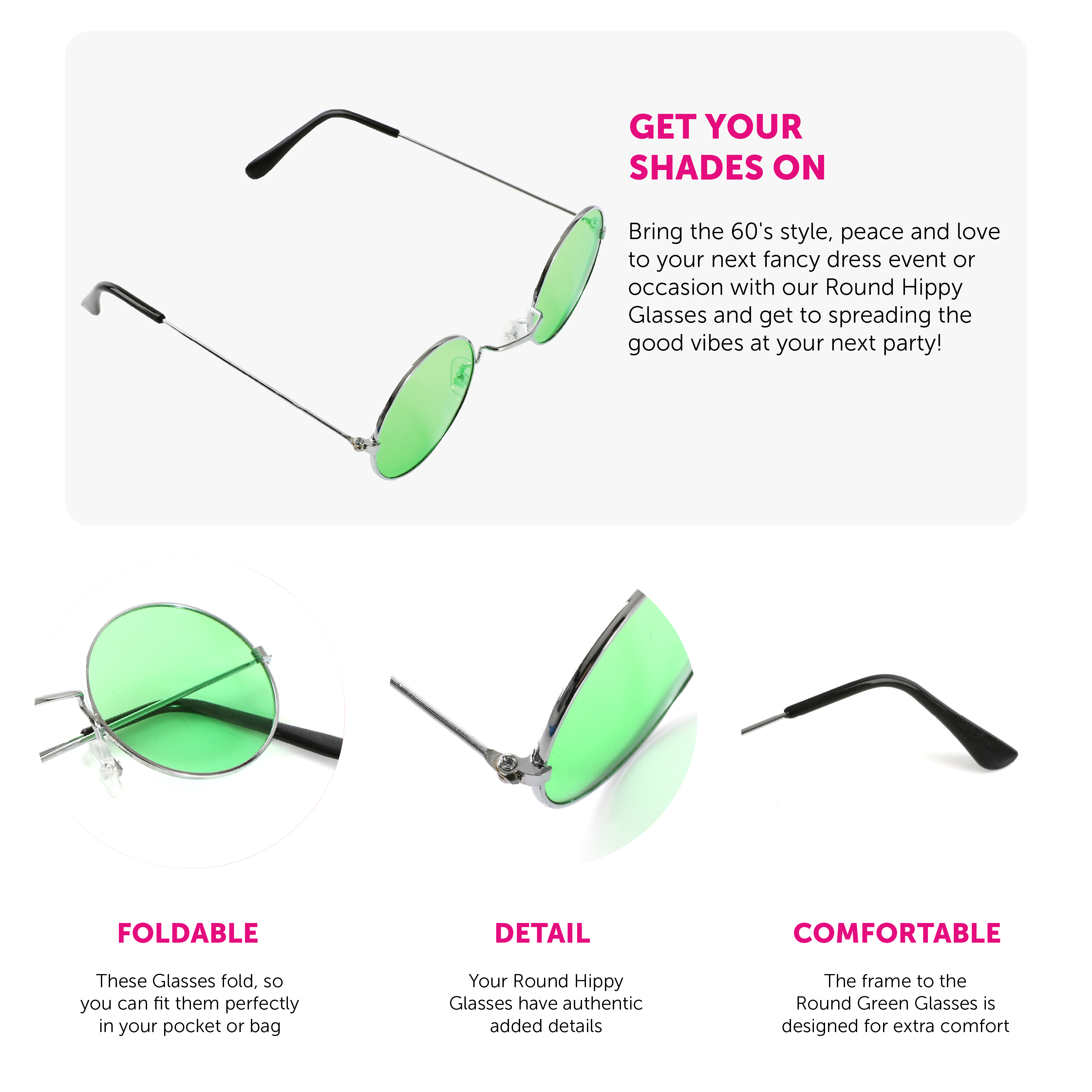 ROUND GREEN HIPPY GLASSES: Bring the 60's style, peace and love to your next fancy dress event or occasion with our Round Hippy Glasses and get to spreading the good vibes at your next party!