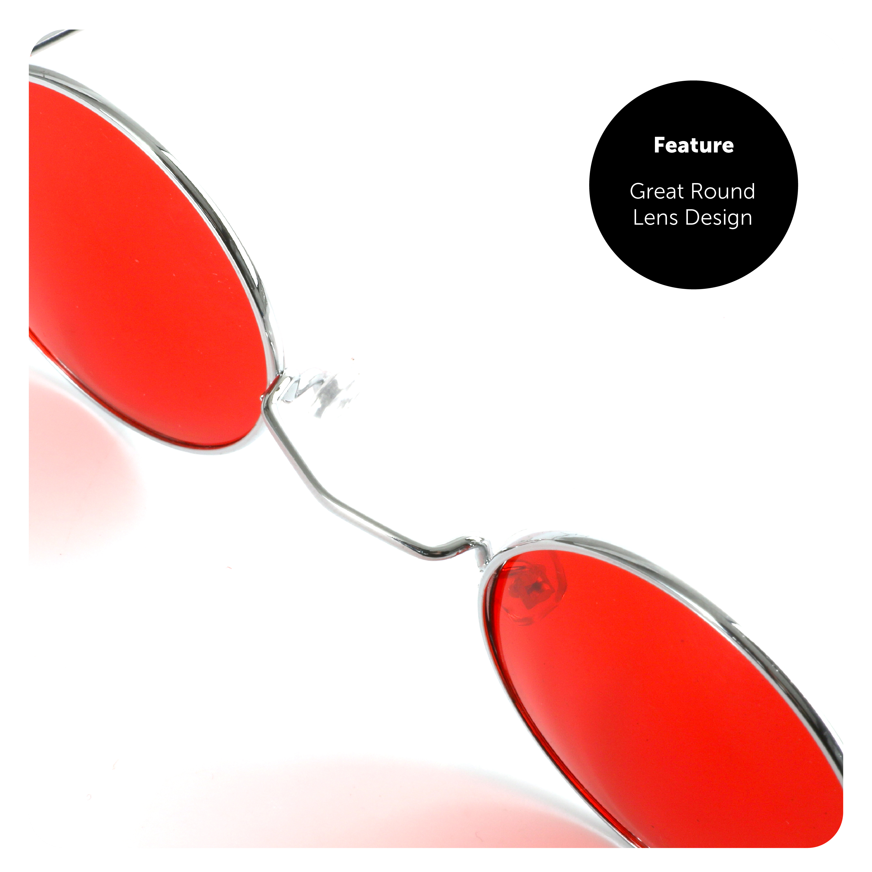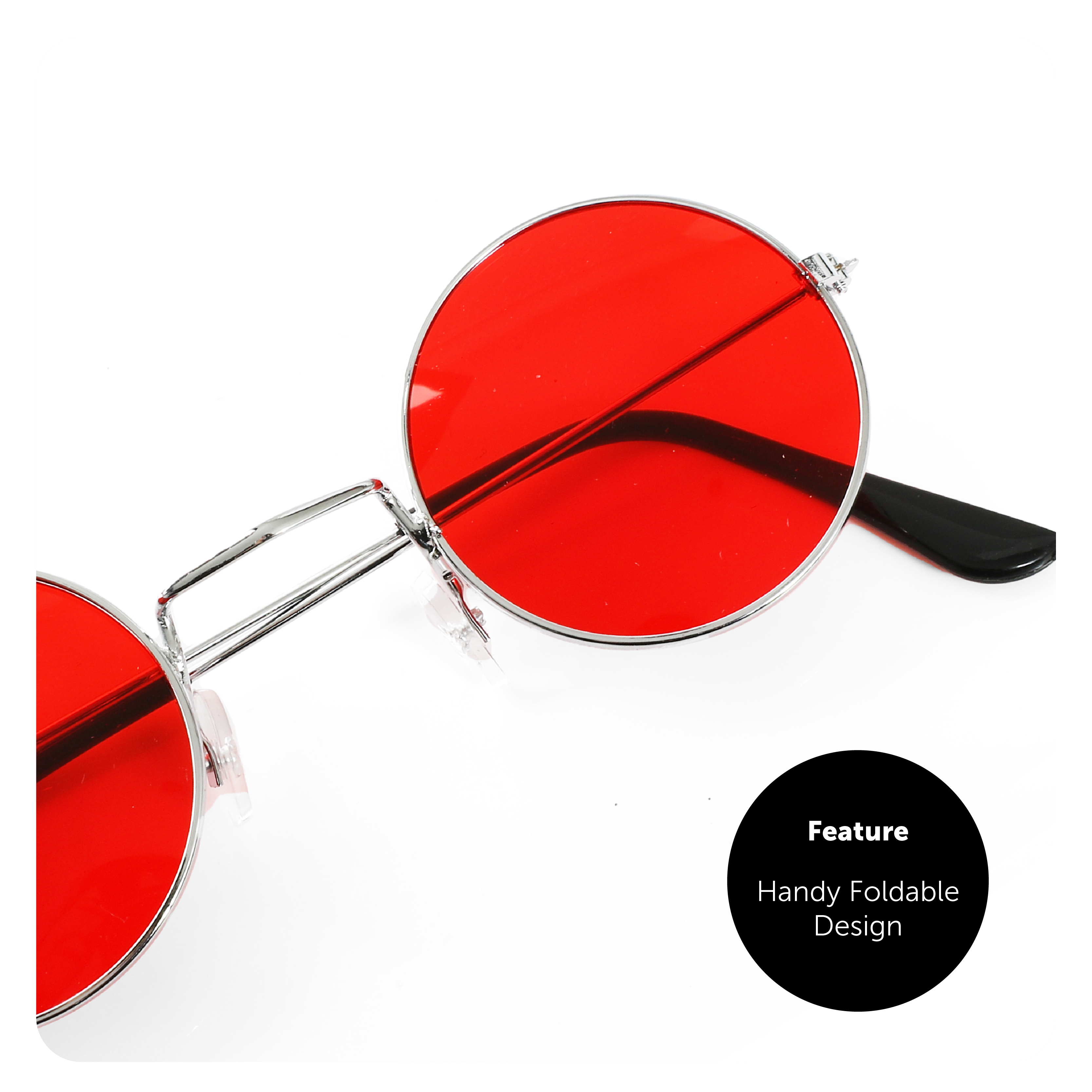 ROUND RED HIPPY GLASSES DETAILS: Your Round Red Hippy Glasses have Red Lenses with a round circular rim frame design, that will comfortably sit on anyone’s face no matter what age or size you may be!