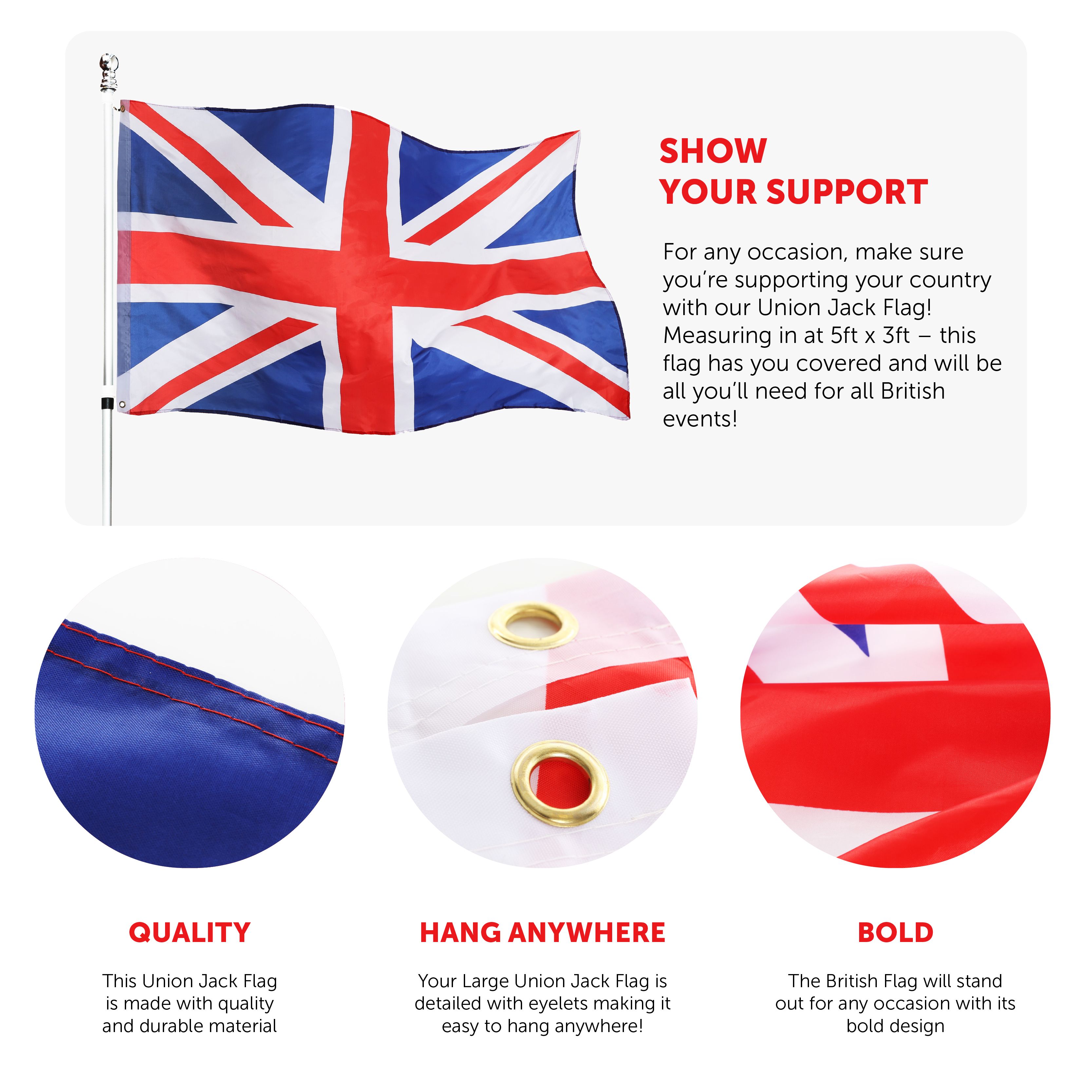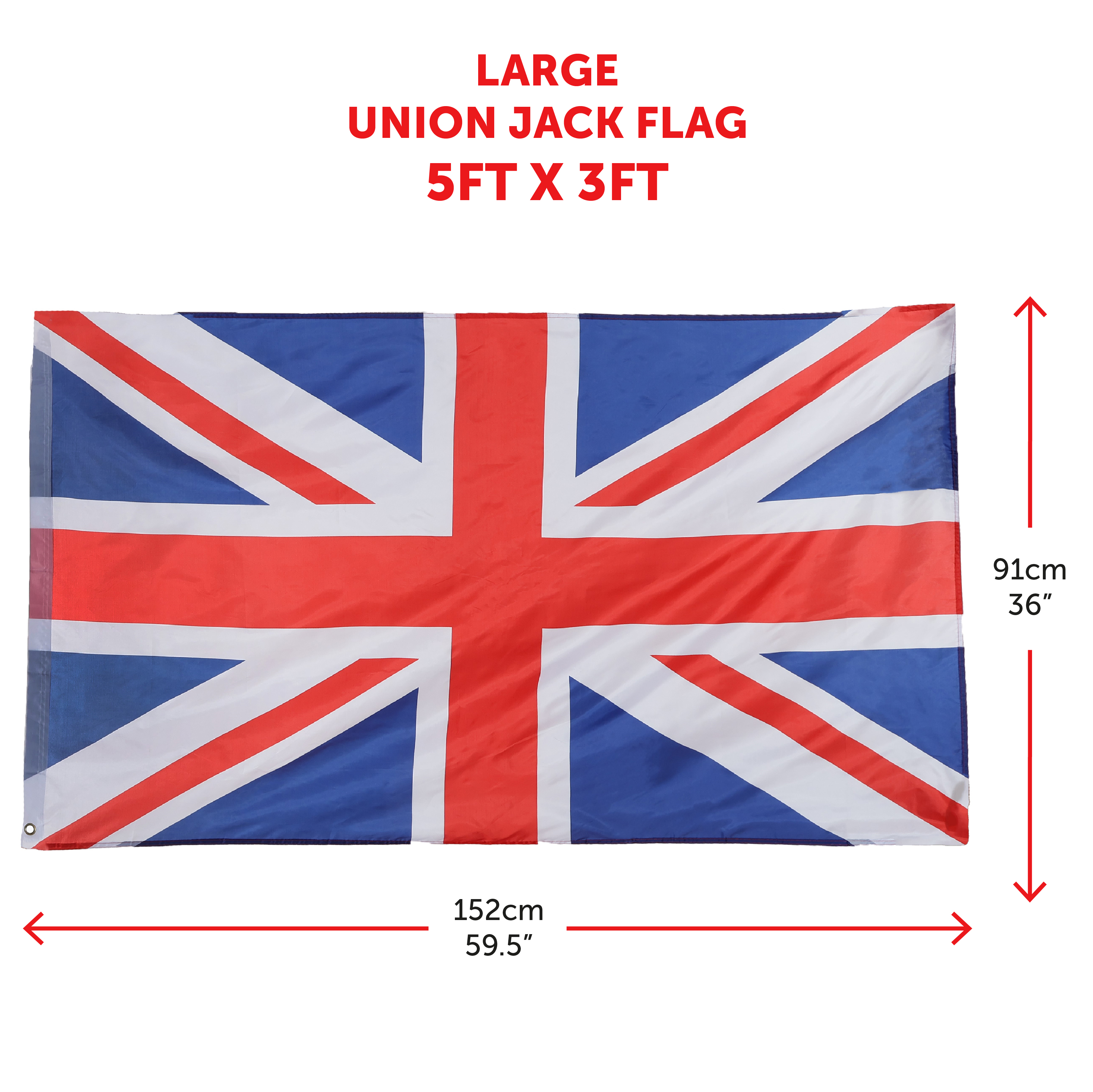 FLAG DETAILS: This Flag is a vibrant Red, White and Blue Union Jack Flag, measuring 5ft (152cm/60") in Width and 3ft (91cm/36") in Height, you'll have the perfect flag accessory to fly high for any event!