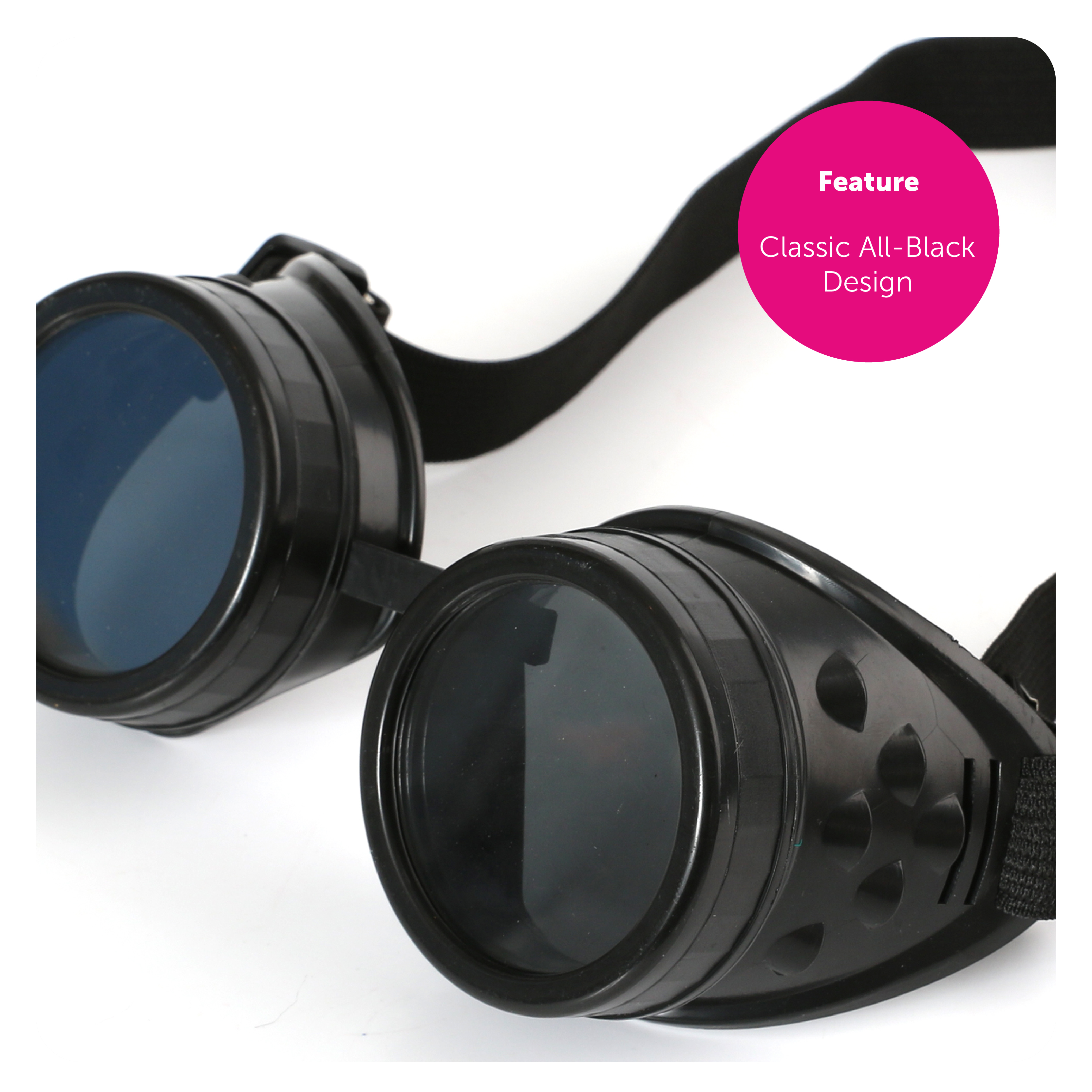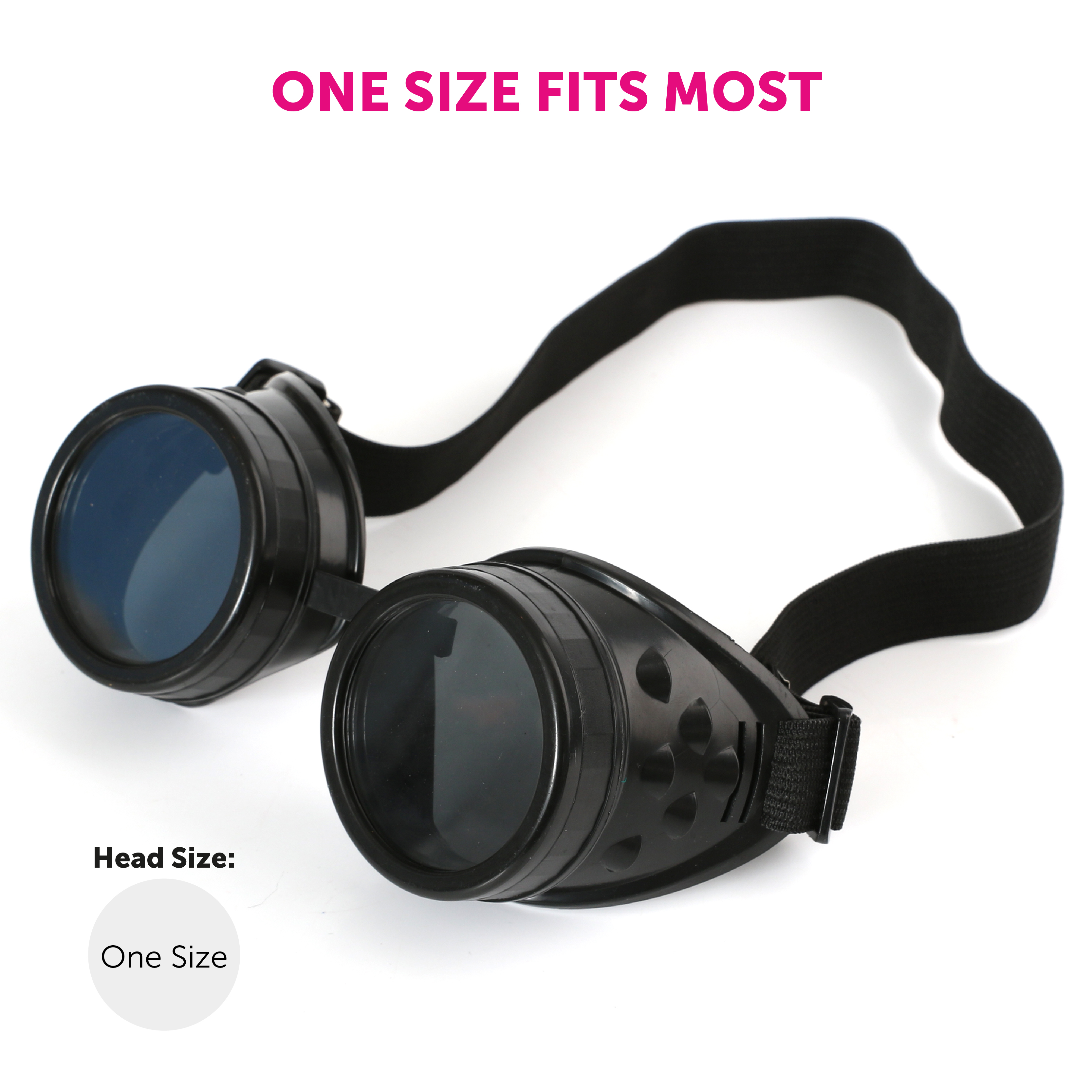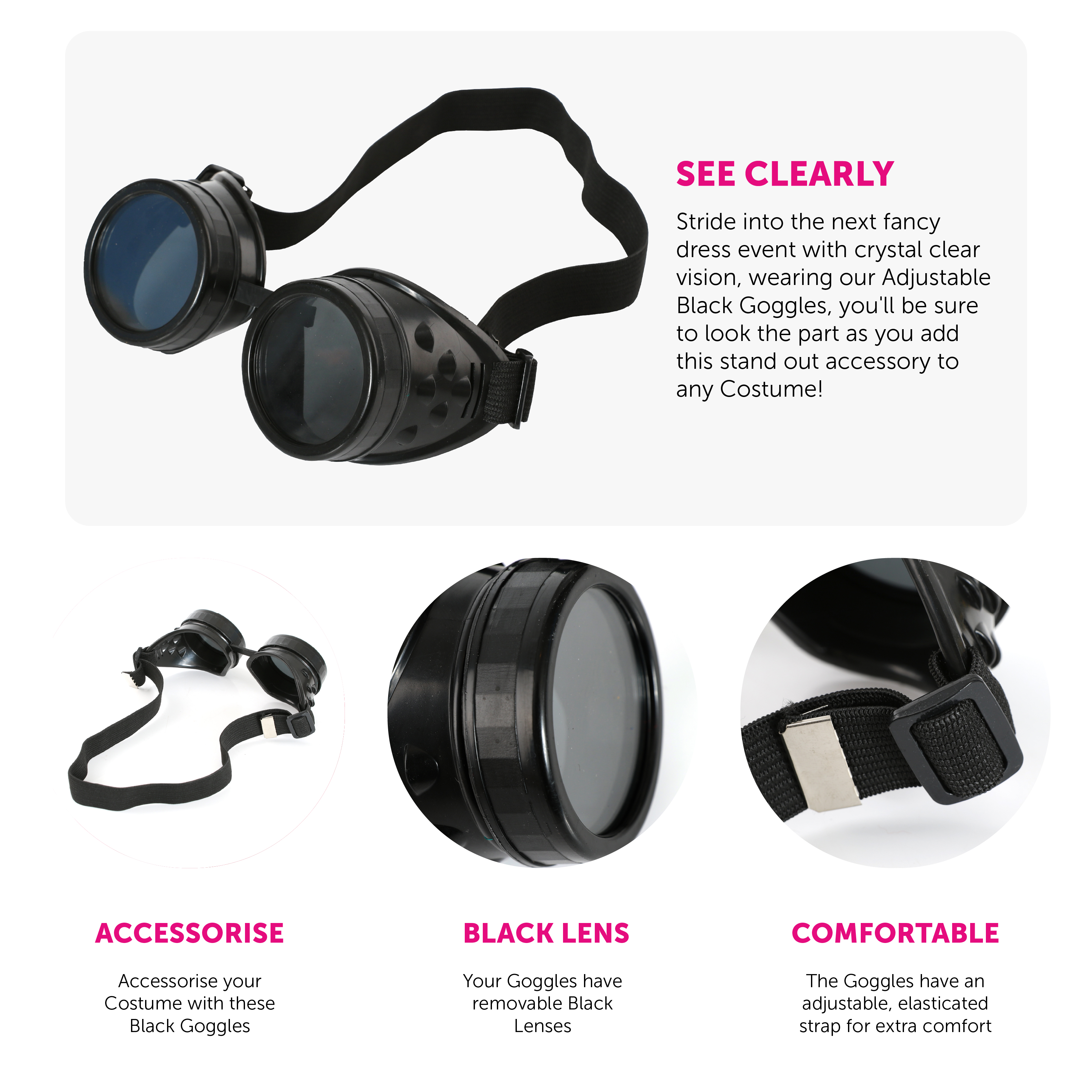 ADJUSTABLE BLACK GOGGLES: Stride into the next fancy dress event with crystal clear vision, wearing our Adjustable Black Goggles, you'll be sure to look the part as you add this stand out accessory to any Costume!