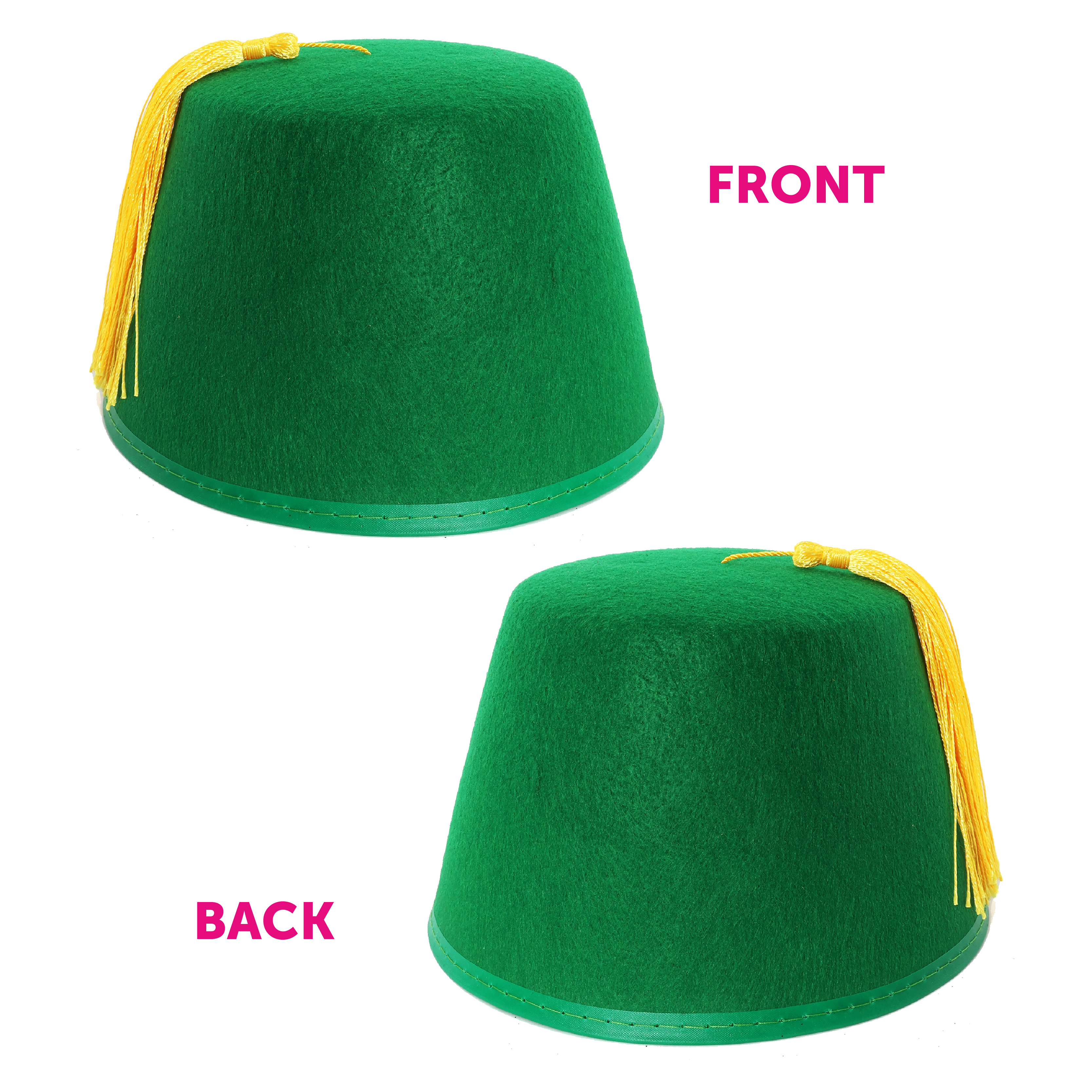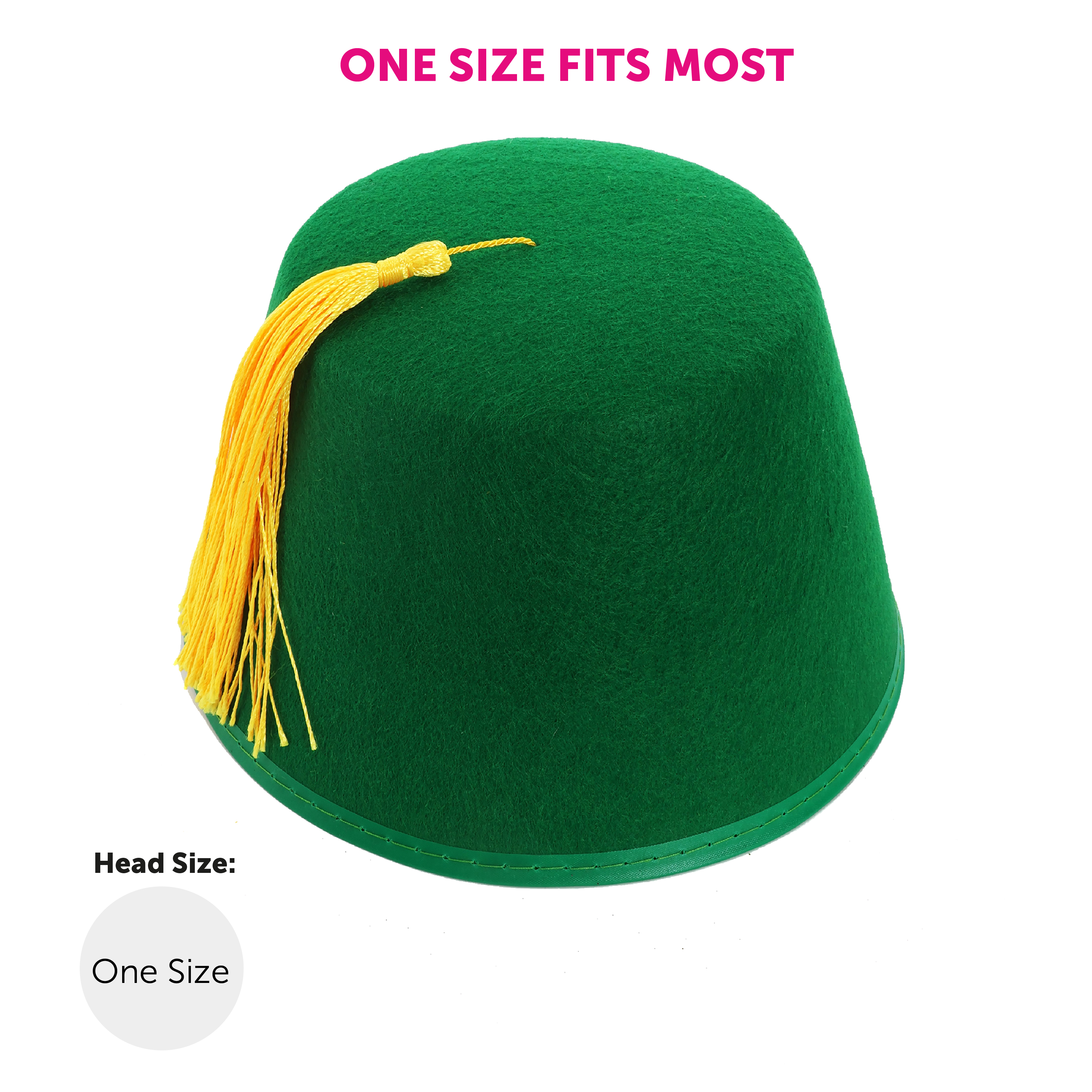 GREEN FEZ HAT DETAILS: Your Green Fez Hat is a superbly high-quality hat, with a Black tassel on the top of the hat, and a unisex size that will fit any adult or child comfortably with ease!