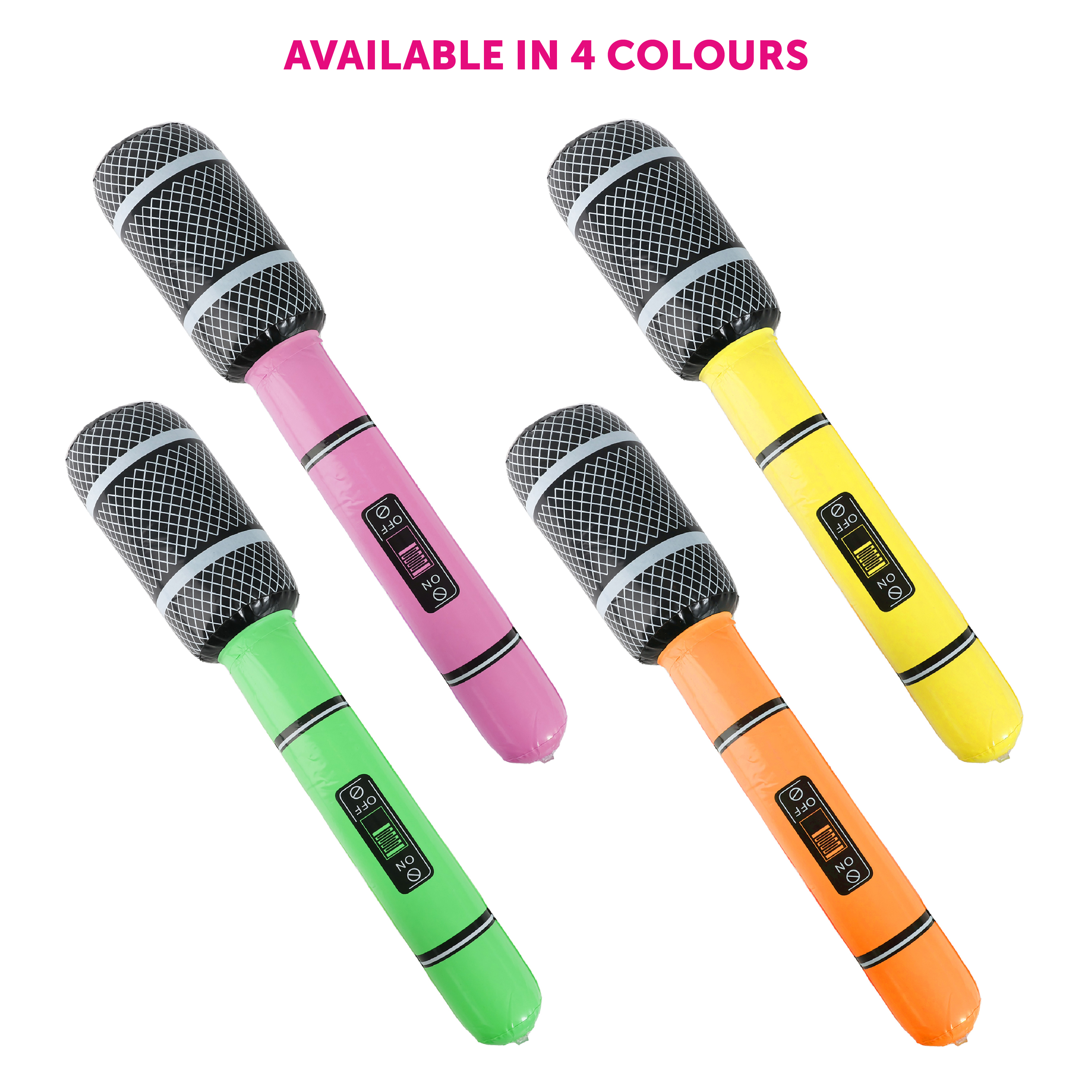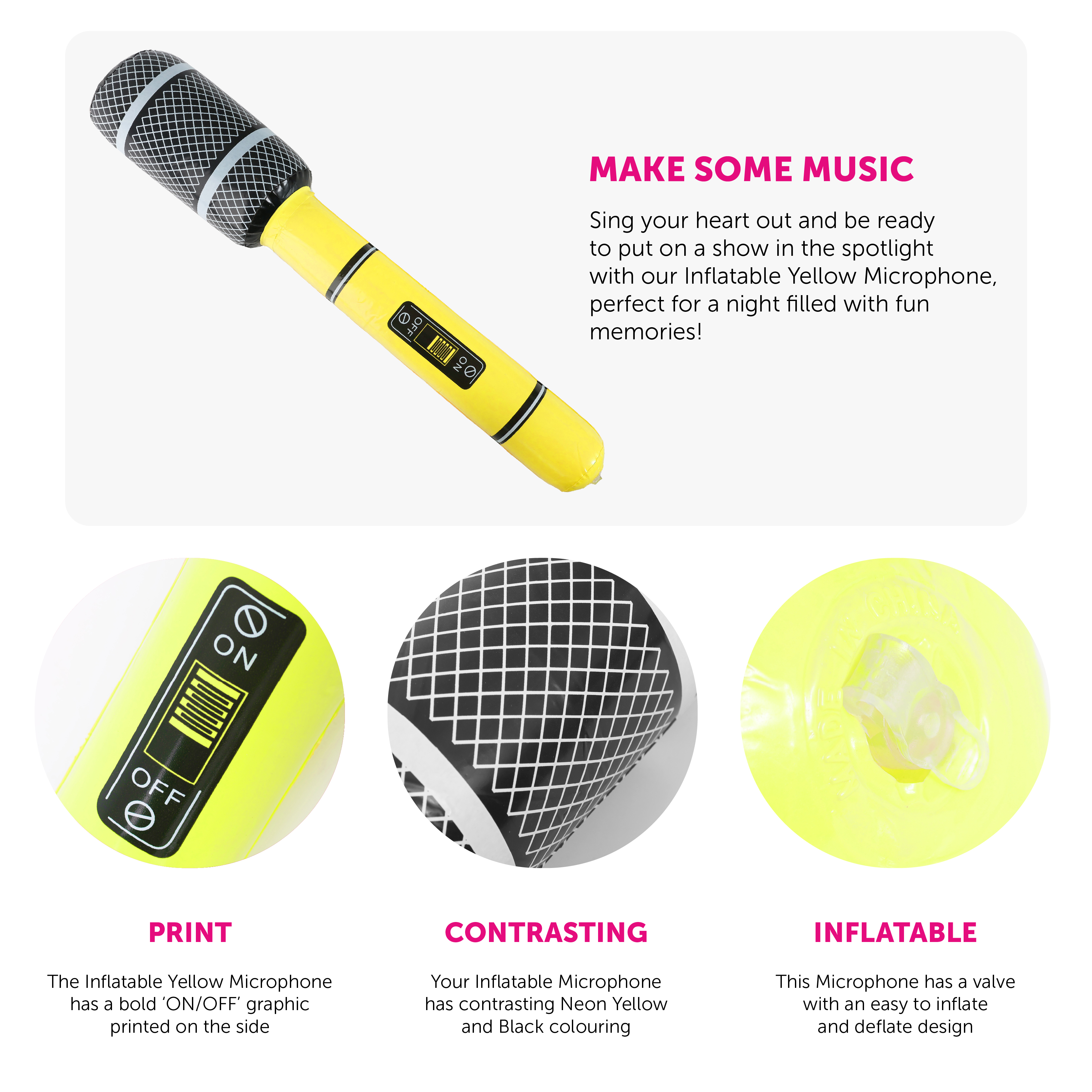 MICROPHONE DETAILS: This Microphone is an easy to inflate Yellow and Black Microphone with a pump valve at the bottom, and an 'ON/OFF' switch graphic, the perfect accessory for any Music themed event!